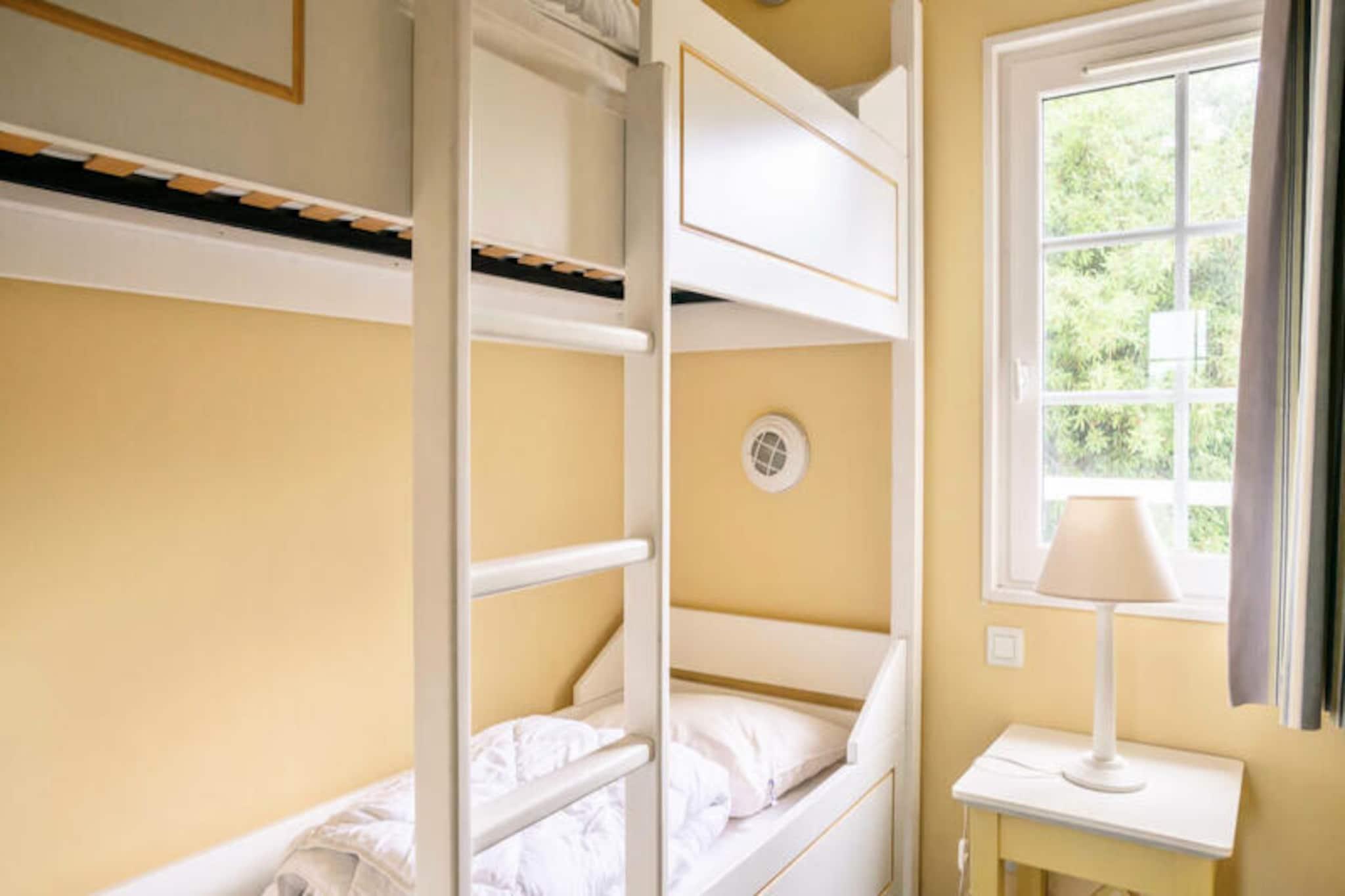 Dette rummelige feriehus kan komfortabelt rumme op til otte gæster. Ejendommen har tre soveværelser, to badeværelser og to separate toiletter, der tilbyder masser af plads til en familie eller gruppeophold. Det er kæledyrsvenligt, så du kan tage dine lodne ledsagere med. Feriehuset inkluderer også væsentlige faciliteter såsom et vedligeholdelsessæt og et fjernsyn til underholdning. Bemærk venligst, at sengelinned og håndklæder er tilgængelige mod et tillægsgebyr, og at slutrengøring er obligatorisk. Beliggende kun et stenkast fra Bourgenay-marinaen, tilbyder denne indkvartering et ideelt sted for dem, der ønsker at udforske Vendée-kysten. Gæsterne kan nyde nem adgang til nærliggende attraktioner, herunder smukke strande, cykelstier og den charmerende by Talmont-Saint-Hilaire. Området er også hjemsted for caféer, markeder og butikker, perfekt til at opdage lokale produkter og spisemuligheder. Indvendigt har feriehuset et fuldt udstyret køkken, ideelt til at tilberede måltider under dit ophold. Stuen byder på et afslappende sted at slappe af, mens de to badeværelser sikrer komfort for alle gæster. Derudover kan du nyde ejendommens uderum og adgang til flere opvarmede swimmingpools i boligen.