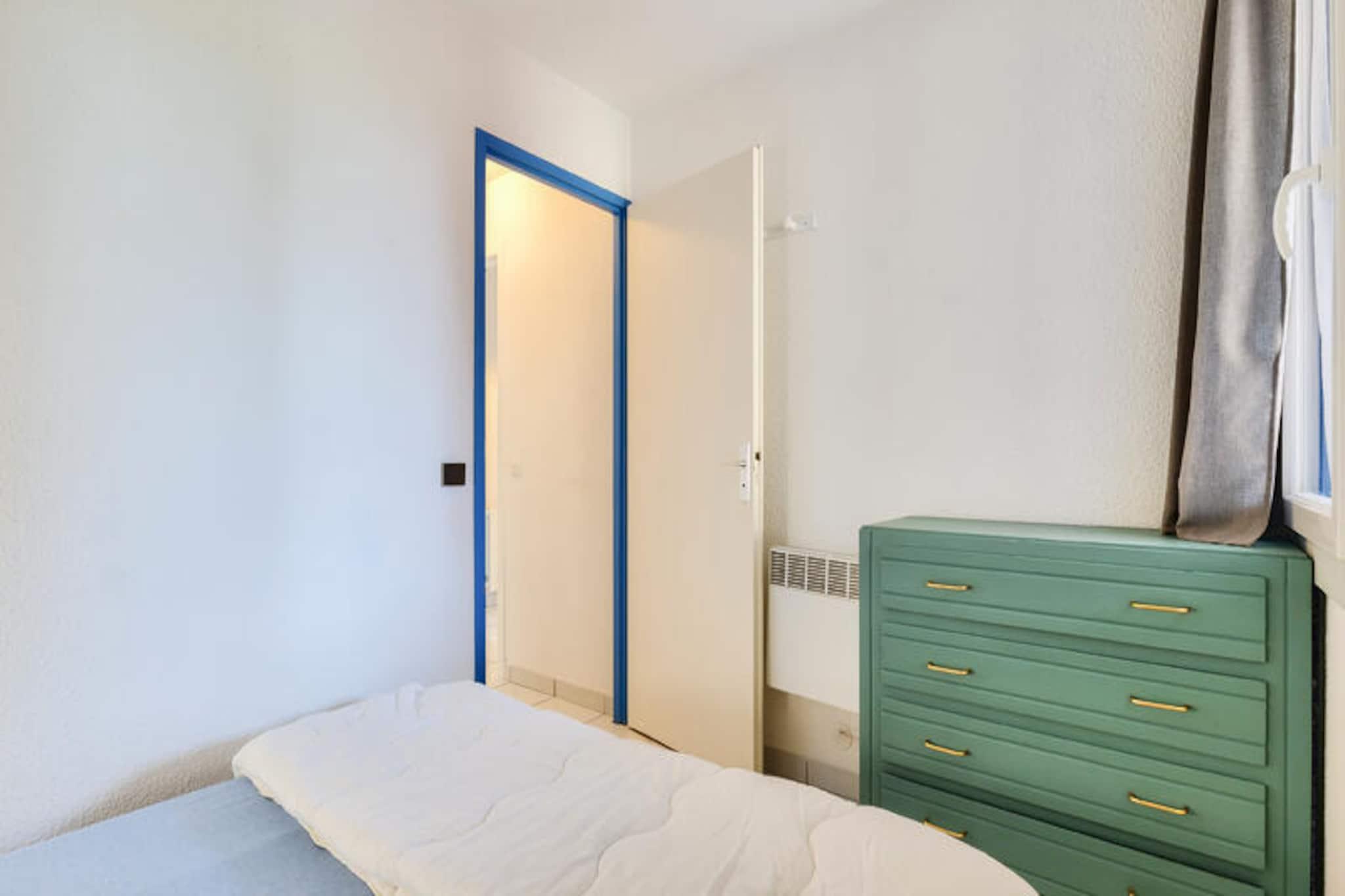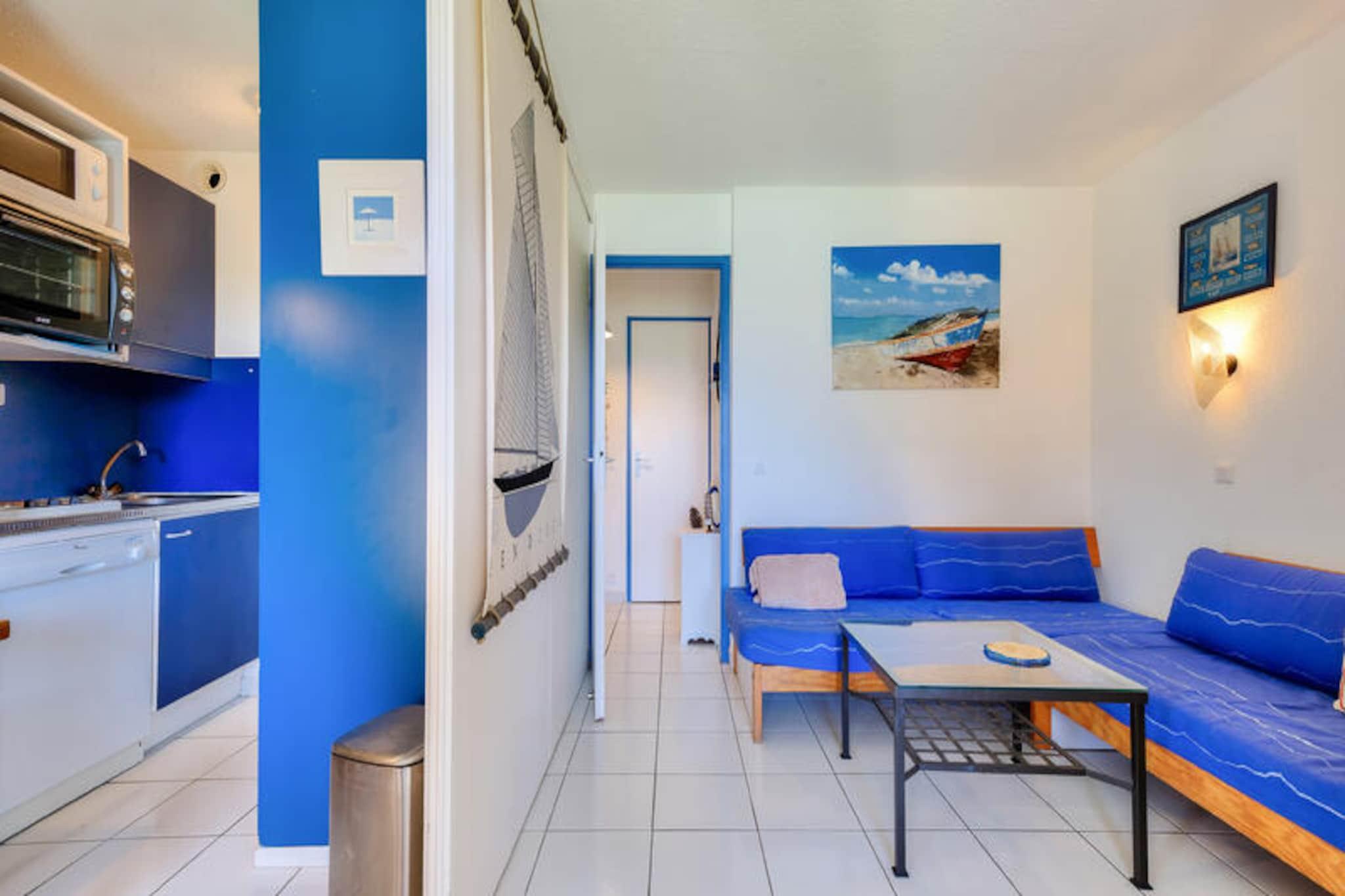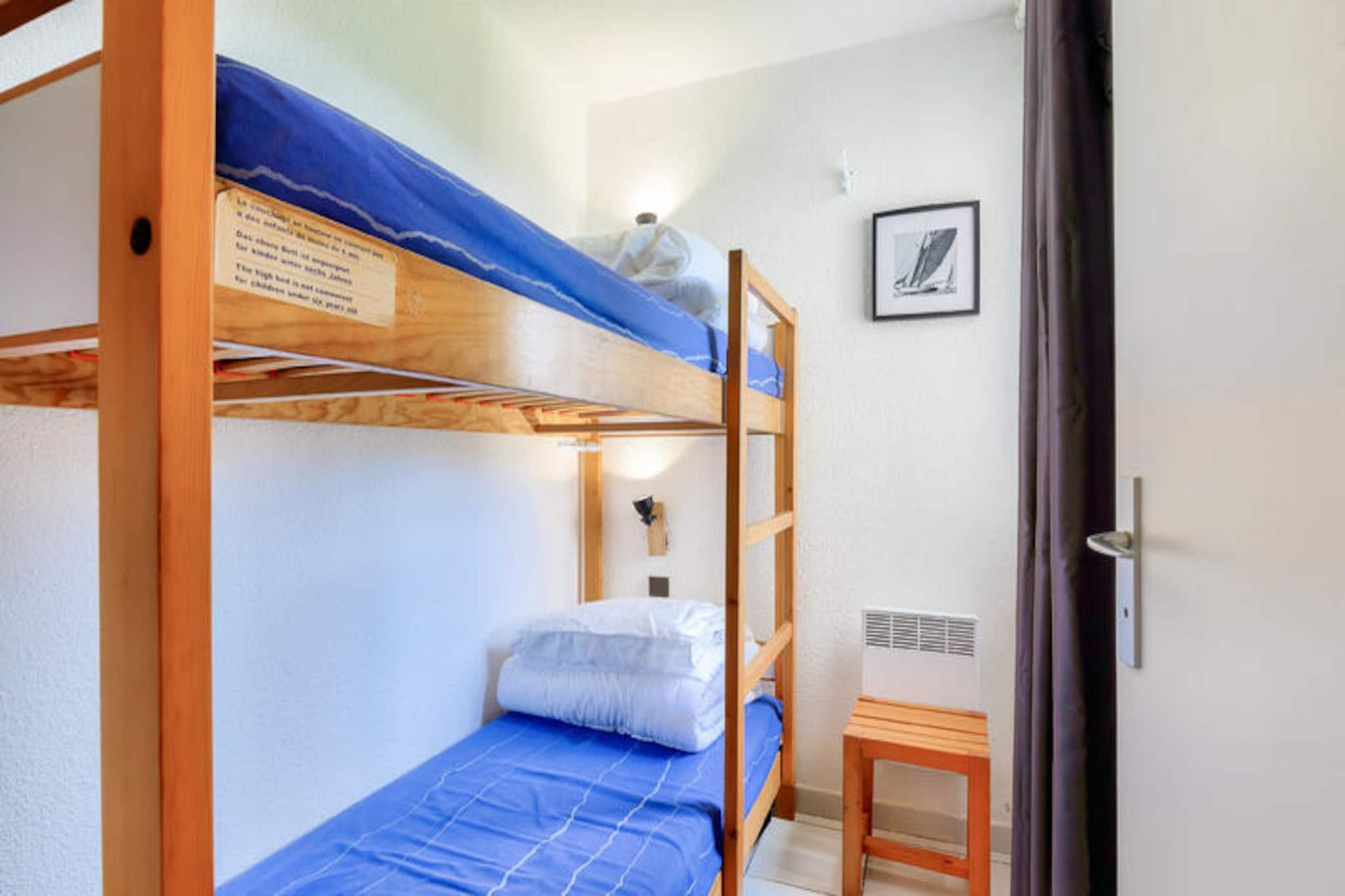 Denne charmerende ferielejlighed er ideel til op til 5 gæster og tilbyder et komfortabelt ophold med et soveværelse med dobbeltseng, et kabineområde med køjesenge, en stue med en sovesofa og et badeværelse med badekar. Lejligheden er kæledyrsvenlig (der kan forekomme ekstra gebyrer), og sengetøj og håndklæder er tilgængelige mod et tillægsgebyr. For ekstra bekvemmelighed opkræves et slutrengøringsgebyr, og parkering er tilgængelig på stedet. Lejligheden har en overdækket terrasse med udsigt over landsbyen, perfekt til at slappe af efter en dag med udforskning. Ejendommen ligger på en 90 hektar stor ejendom omgivet af fyrreskove og tilbyder direkte adgang til havet og kun 2,5 km fra Veillon-stranden, som kan nås til fods, på cykel eller med shuttle. Gæsterne kan nyde en række fritidsaktiviteter, herunder to 18-hullers golfbaner, tennis og minigolf. Boligen har også butikker på stedet, herunder et pizzeria, bageri og isbar, hvilket tilføjer bekvemmelighed og charme til dit ophold. Den nærliggende bymidte byder på yderligere caféer og markeder for en lokal oplevelse. Lejligheden har et semi-åbent køkken udstyret med væsentlige apparater, herunder en mikrobølgeovn og ovn, hvilket gør det nemt at tilberede måltider. Badeværelset har badekar med søjle, og der er god opbevaringsplads til dine ejendele. På stedet finder du opvarmede pools, rutsjebaner og et soppebassin til familiesjov. Med sin førsteklasses beliggenhed og mange faciliteter er denne lejlighed perfekt til en afslappende ferie.