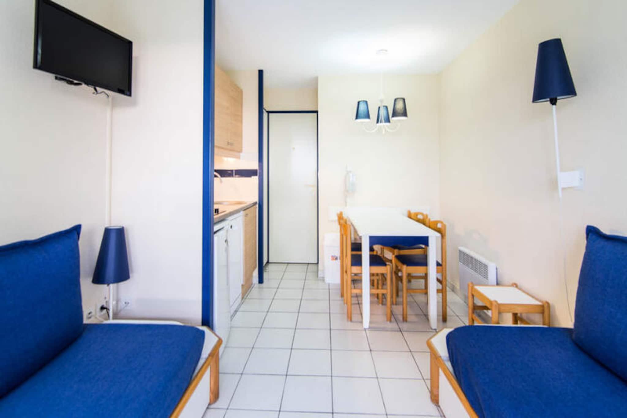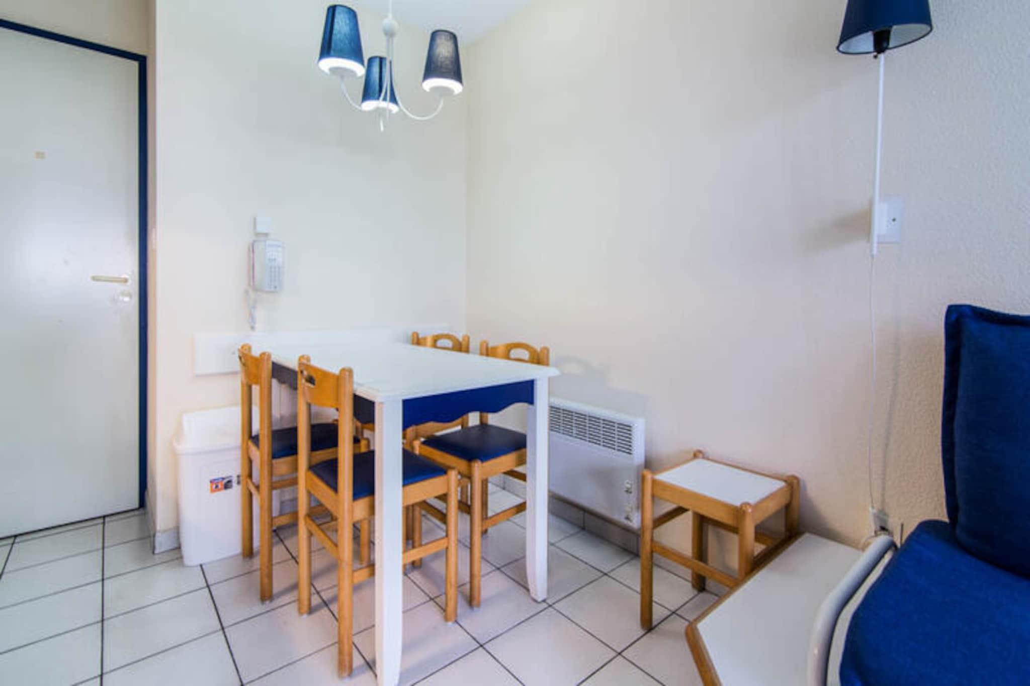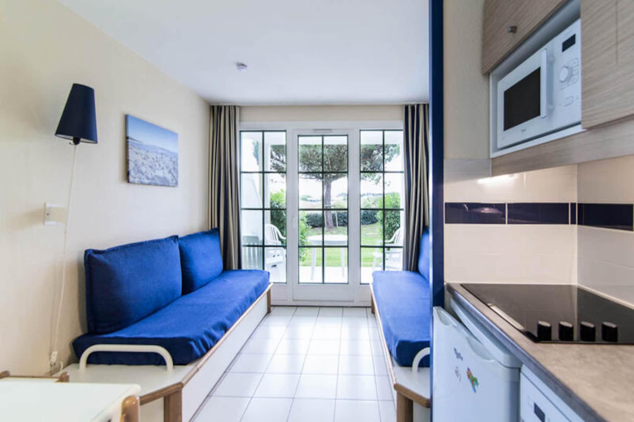 Denne charmerende lejlighed, beliggende i stueetagen, har plads til op til 5 personer og har en møbleret terrasse mod sydøst med udsigt over parken og en lille sø. Det omfatter en stue med to sovesofaer, den ene med en udtræksseng, og et kabineområde med en køjeseng. Lejligheden har også en spiseplads med bord og fire stole. Kæledyr er tilladt efter forudgående forespørgsel, og et babysæt er tilgængeligt efter anmodning. Sengetøj og håndklæder er tilgængelige mod et tillægsgebyr, og der er en obligatorisk rengøringsservice i slutningen af ??dit ophold. Boligen ligger i en fantastisk 90 hektar stor ejendom omgivet af en fyrreskov og direkte med udsigt over en rolig sø. Det er kun 2,5 km fra Veillon Beach, som du kan få adgang til til fods, på cykel eller med en shuttleservice. Området byder på mange aktiviteter, herunder to 18-hullers golfbaner, tennis, minigolf og et opvarmet vandområde med rutsjebaner. Nærliggende butikker omfatter et pizzeria, bageri og bar, mens centrum af Seignosse ligger kun 200 meter væk, med forskellige caféer, markeder og attraktioner. Indvendigt har lejligheden et fuldt udstyret køkken med mikroovn, komfur og køleskab, åbent til stuen. Badeværelset har badekar og toilet, og der er masser af opbevaringsplads overalt. Gæsterne kan nyde gratis parkering i boligen og adgang til de tre swimmingpools, der er tilgængelige fra april til september, med yderligere faciliteter såsom wifi og sengetøj til rådighed mod et ekstra gebyr.