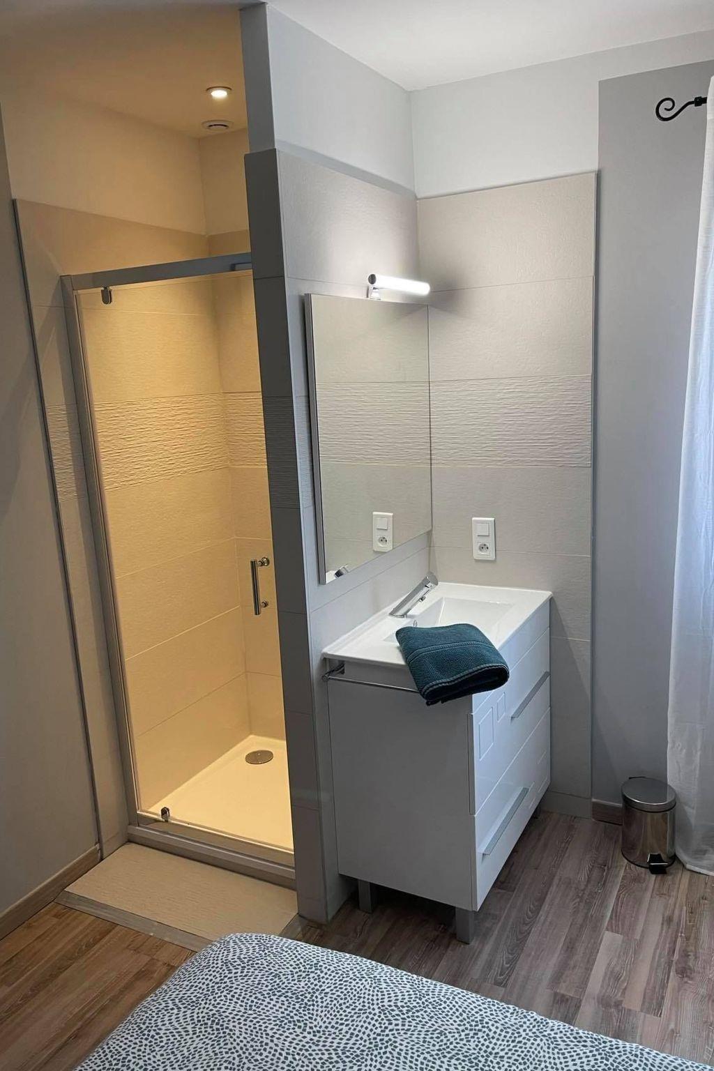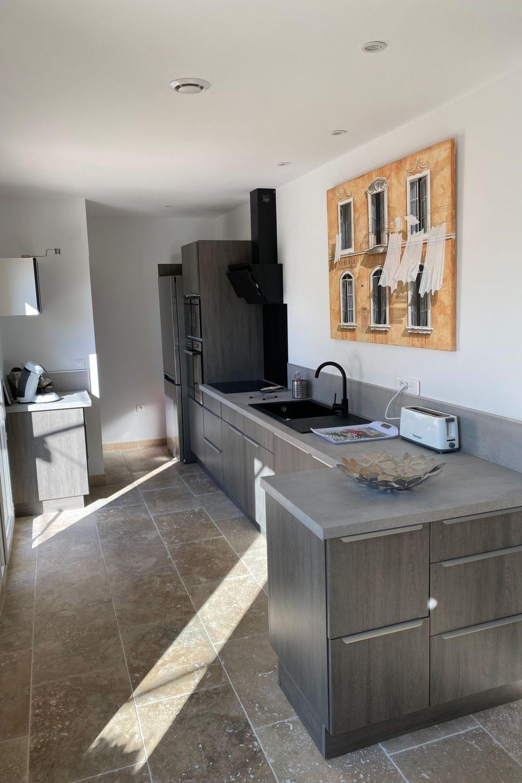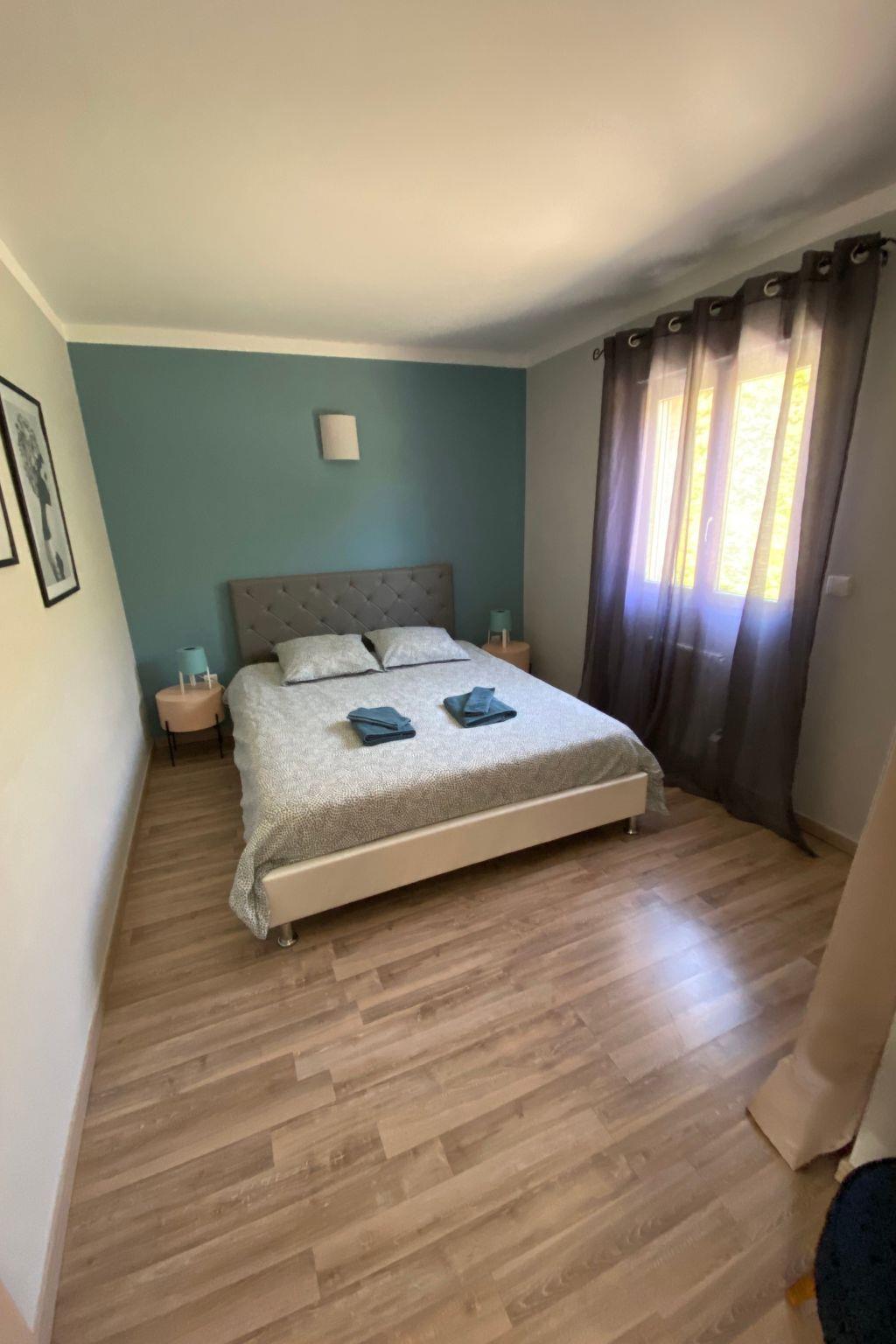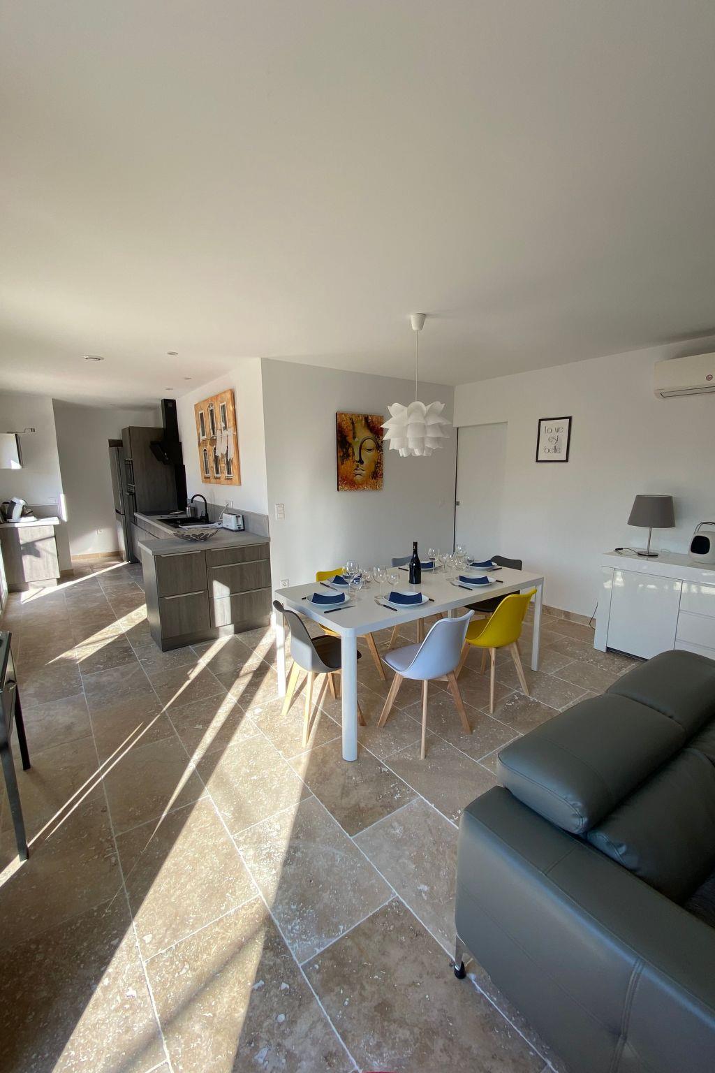 New 100 m2 ground-floor villa for 6 people: open-plan kitchen, dining/living room opening onto covered terrace and swimming pool, 1 master suite with shower and washbasin (160 cm double bed), 1 bedroom (160 cm double bed), 1 bedroom with 160 cm double bed, bathroom, air-conditioned villa in the day area (kitchen, dining room and living room).
