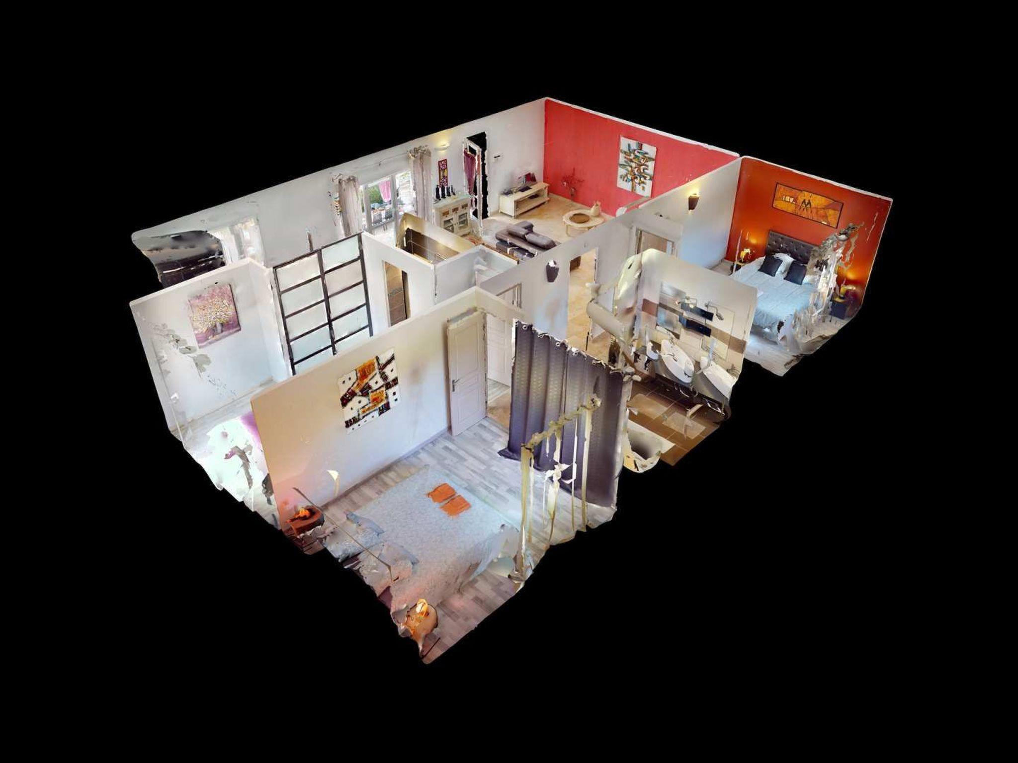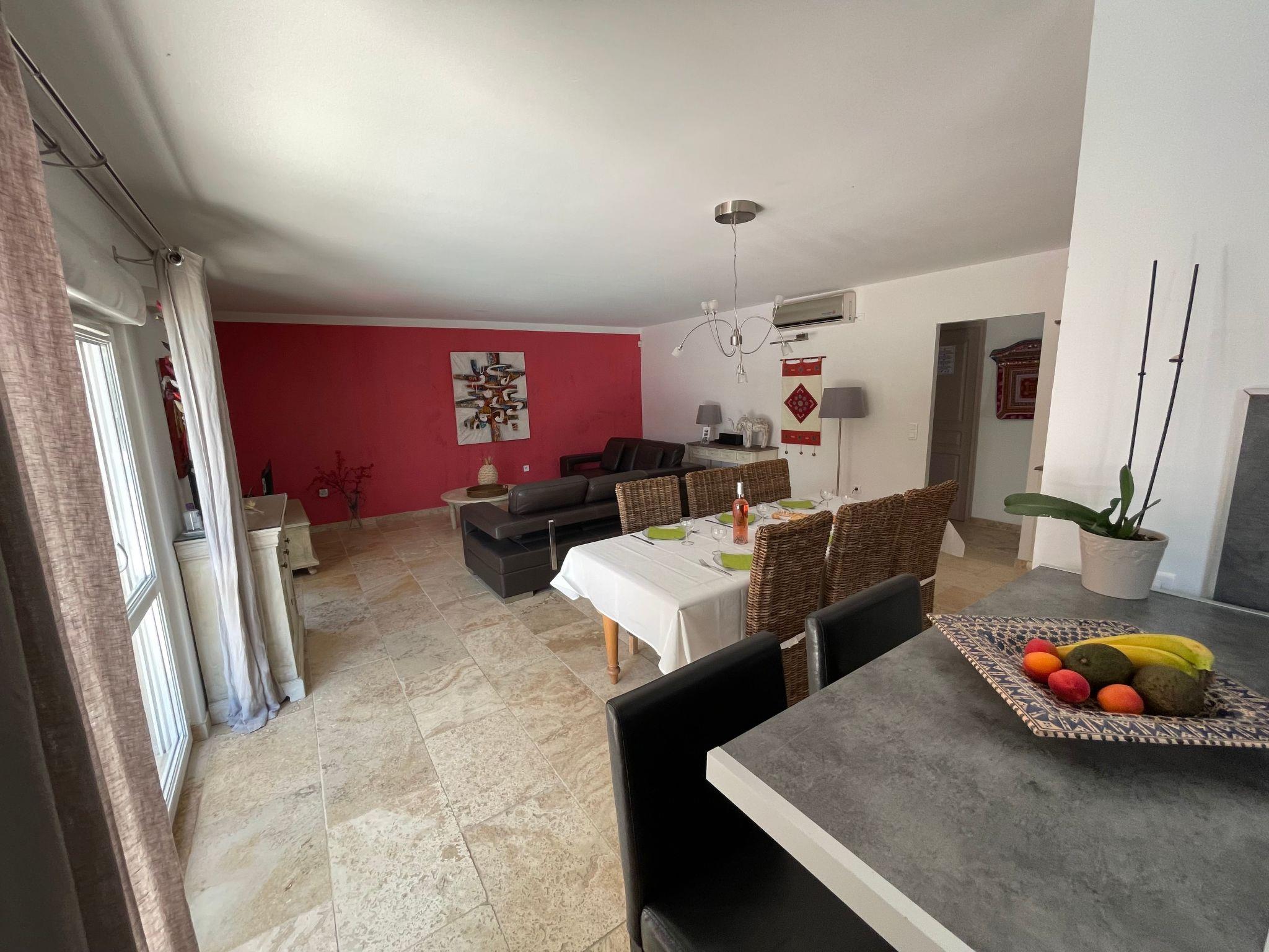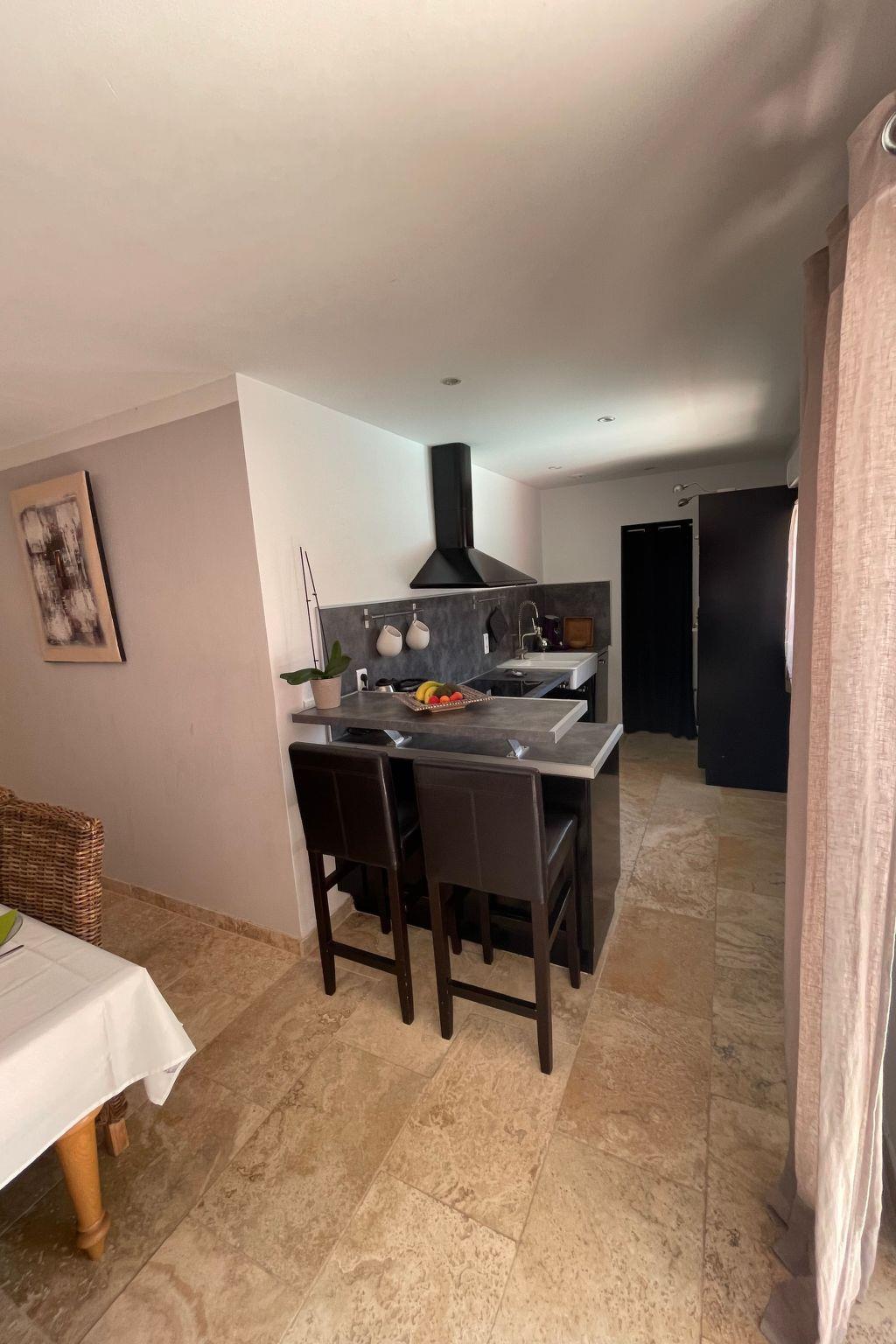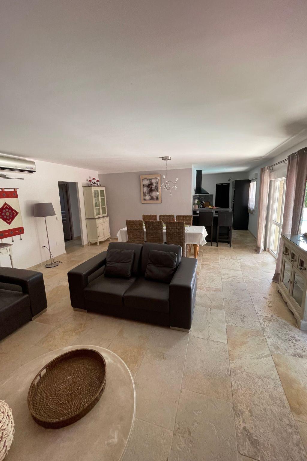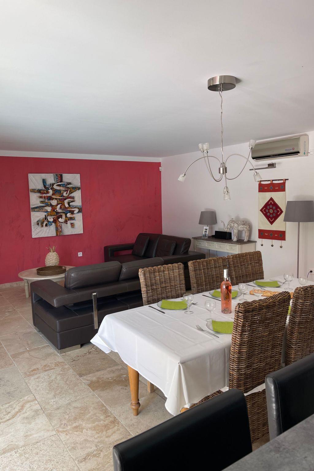 New 100 m2 ground-floor villa for 6 people: open-plan kitchen, dining/living room opening onto the covered terrace and pool, 1 bedroom with shower room (160 cm double bed), 1 bedroom (160 cm double bed), 1 bedroom with 160 cm double bed, bathroom, air-conditioned villa in the day area (kitchen, dining room and living room).