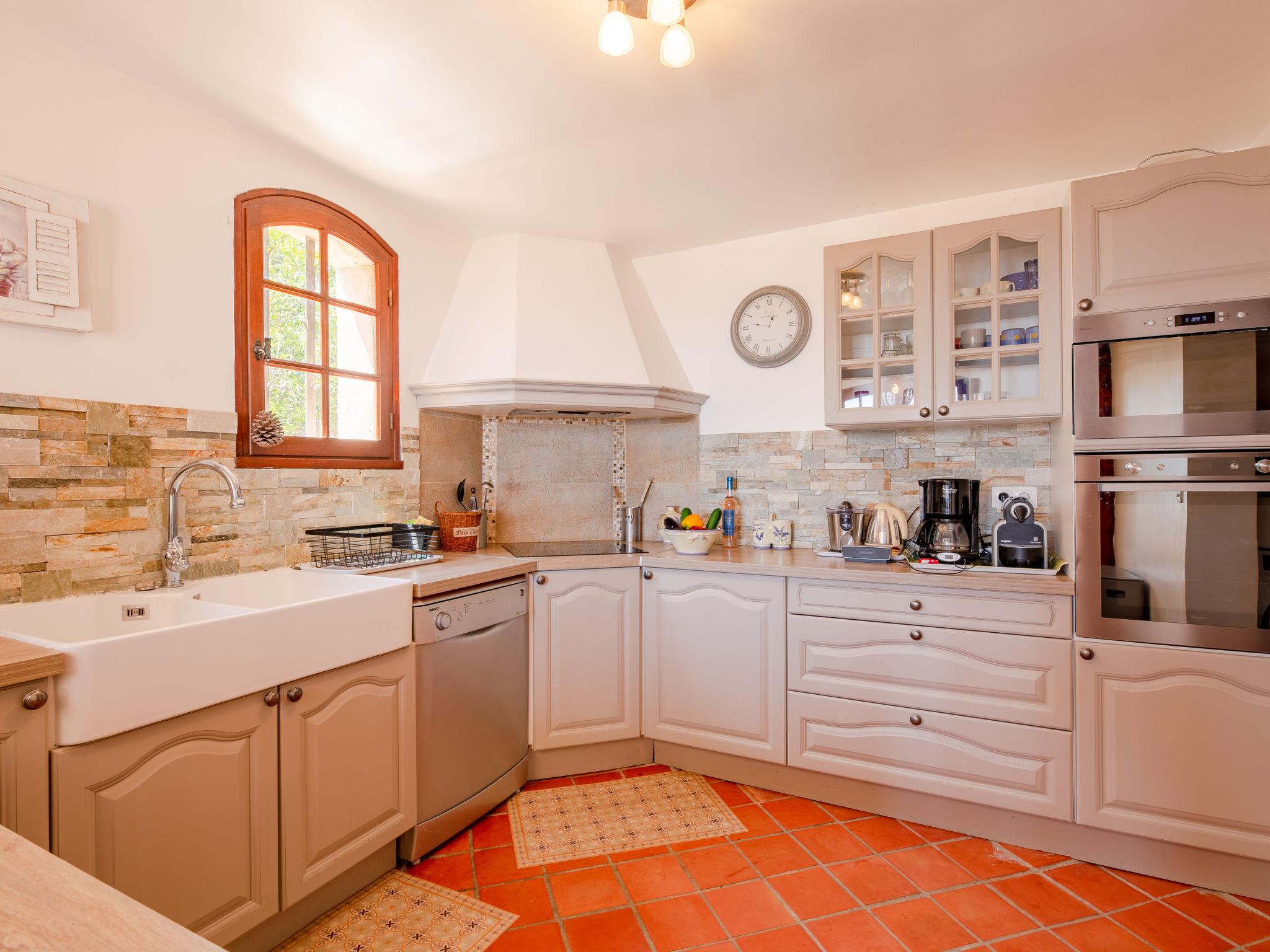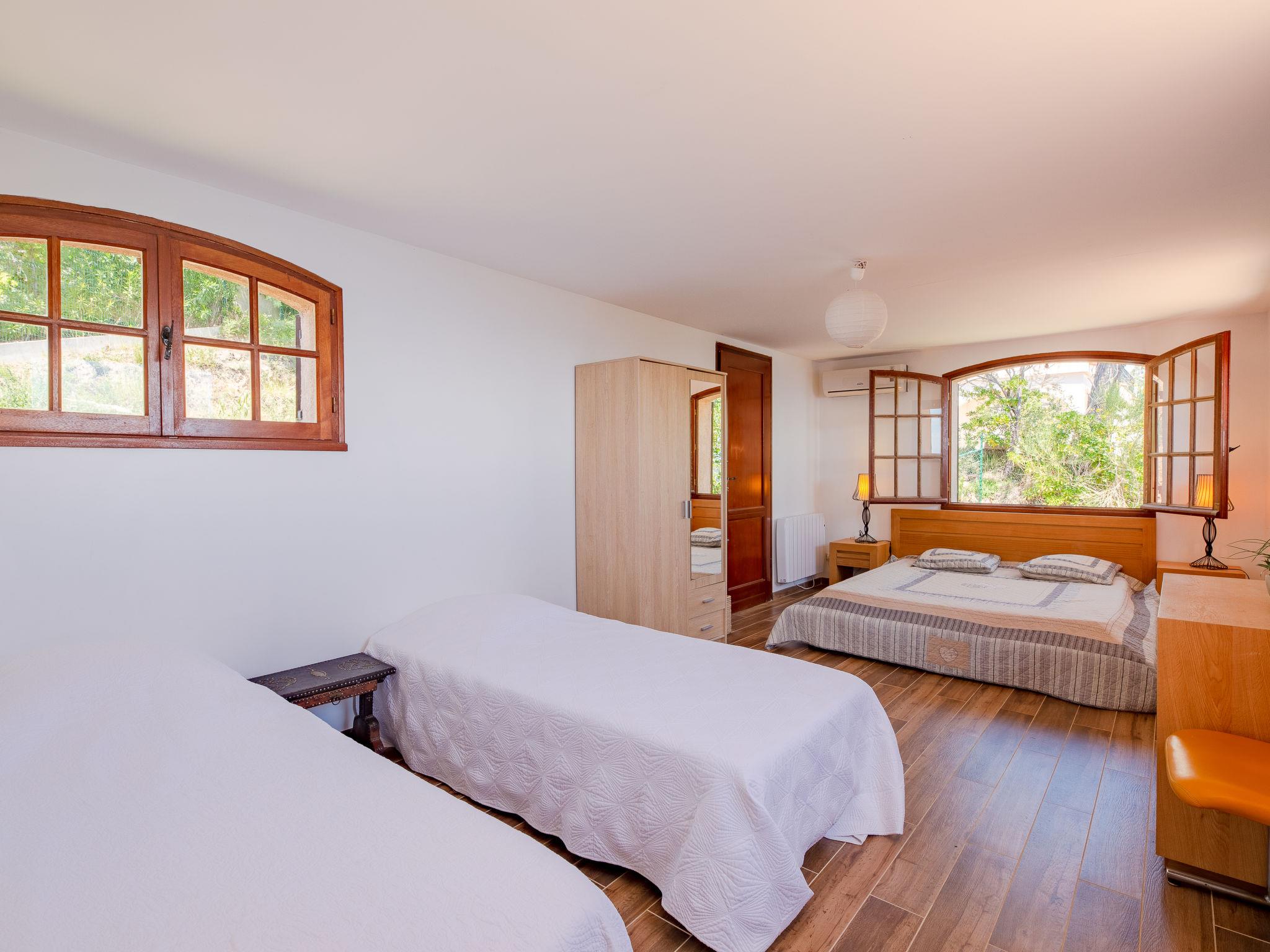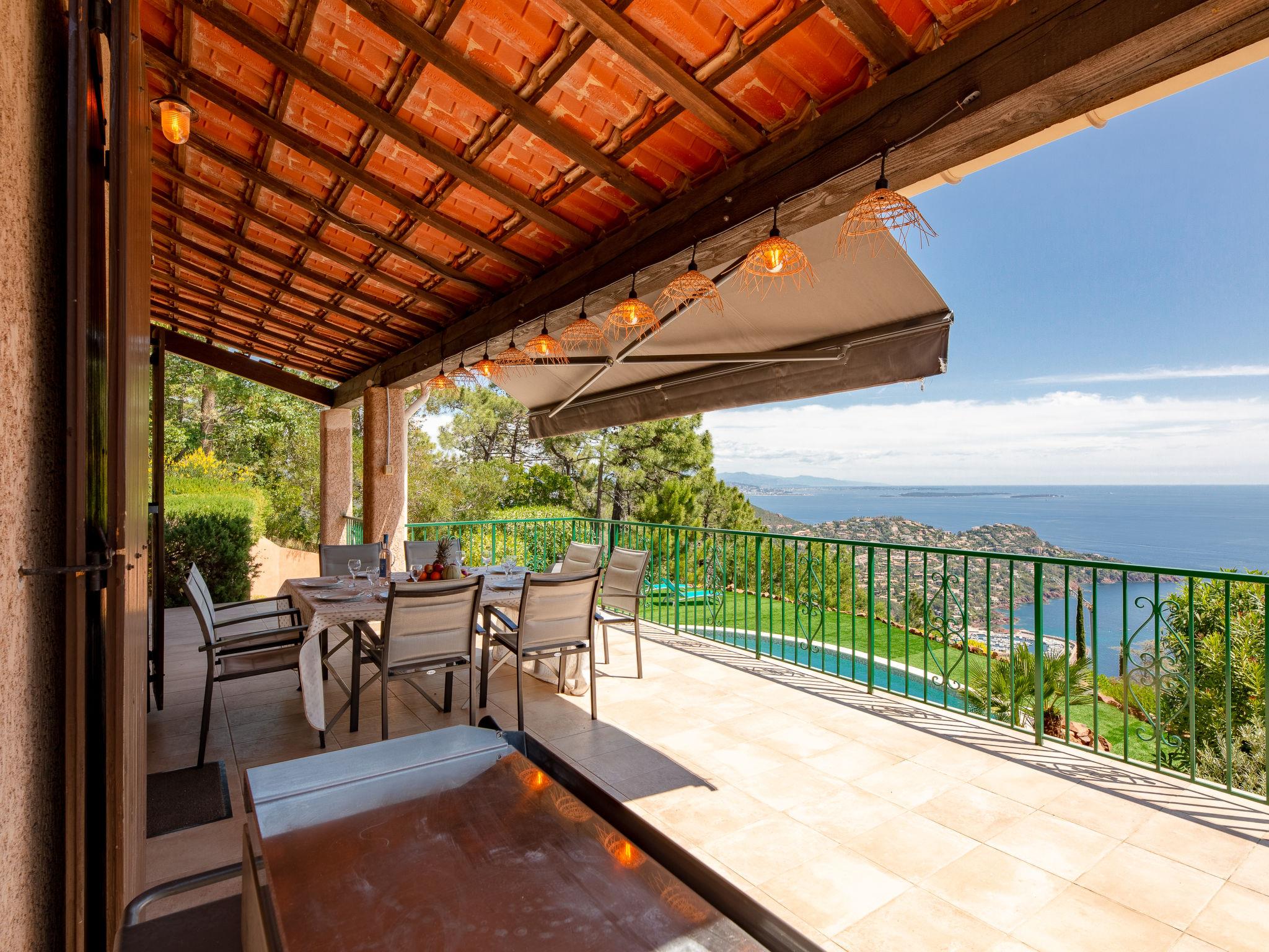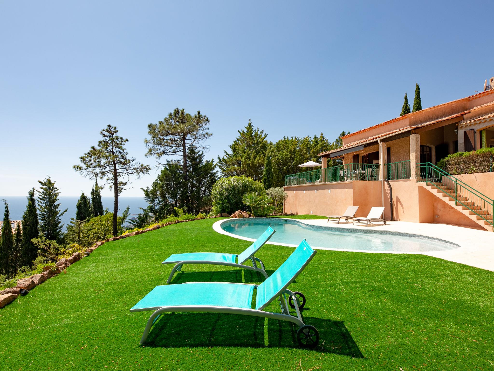 Beautiful house "Ponderosa". 9 km from the centre of Théoule-sur-Mer, 2.5 km from the centre of Le Trayas, 22 km from the centre of Saint Raphael, on a slope, in the residential district, 3 km from the sea. Private: natural state property 1'500 m2 (fenced), swimming pool kidney shaped (13 x 4 m, seasonal availability: 01.Jan. - 31.Dec.) with alarm system and salt-electrolysis pool-cleaning system. Outdoor shower. Steep motor access. Parking (for 3 cars) on the premises. Shop 9 km, bakery 2.5 km, bus stop 2.2 km, rocky beach 3 km.