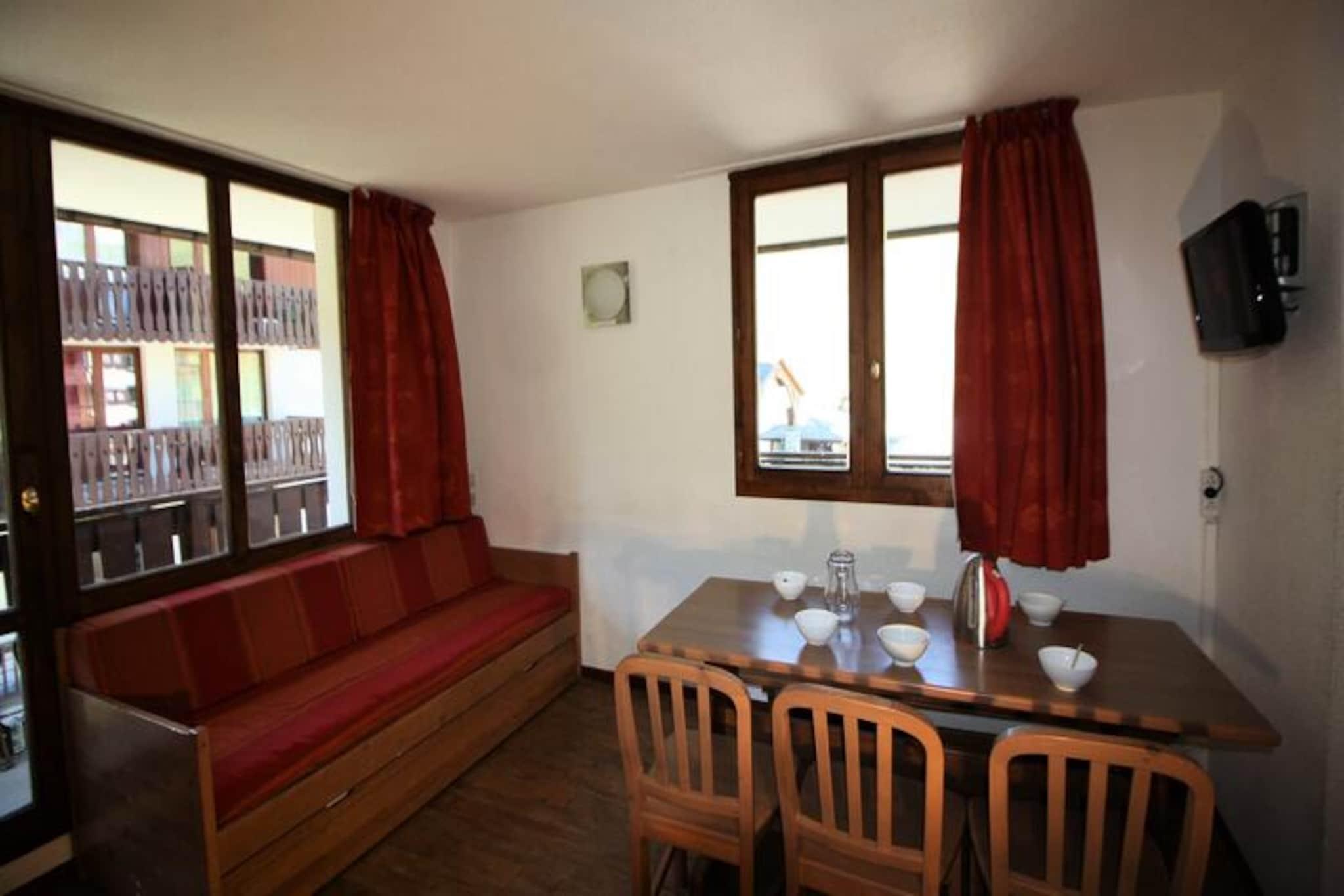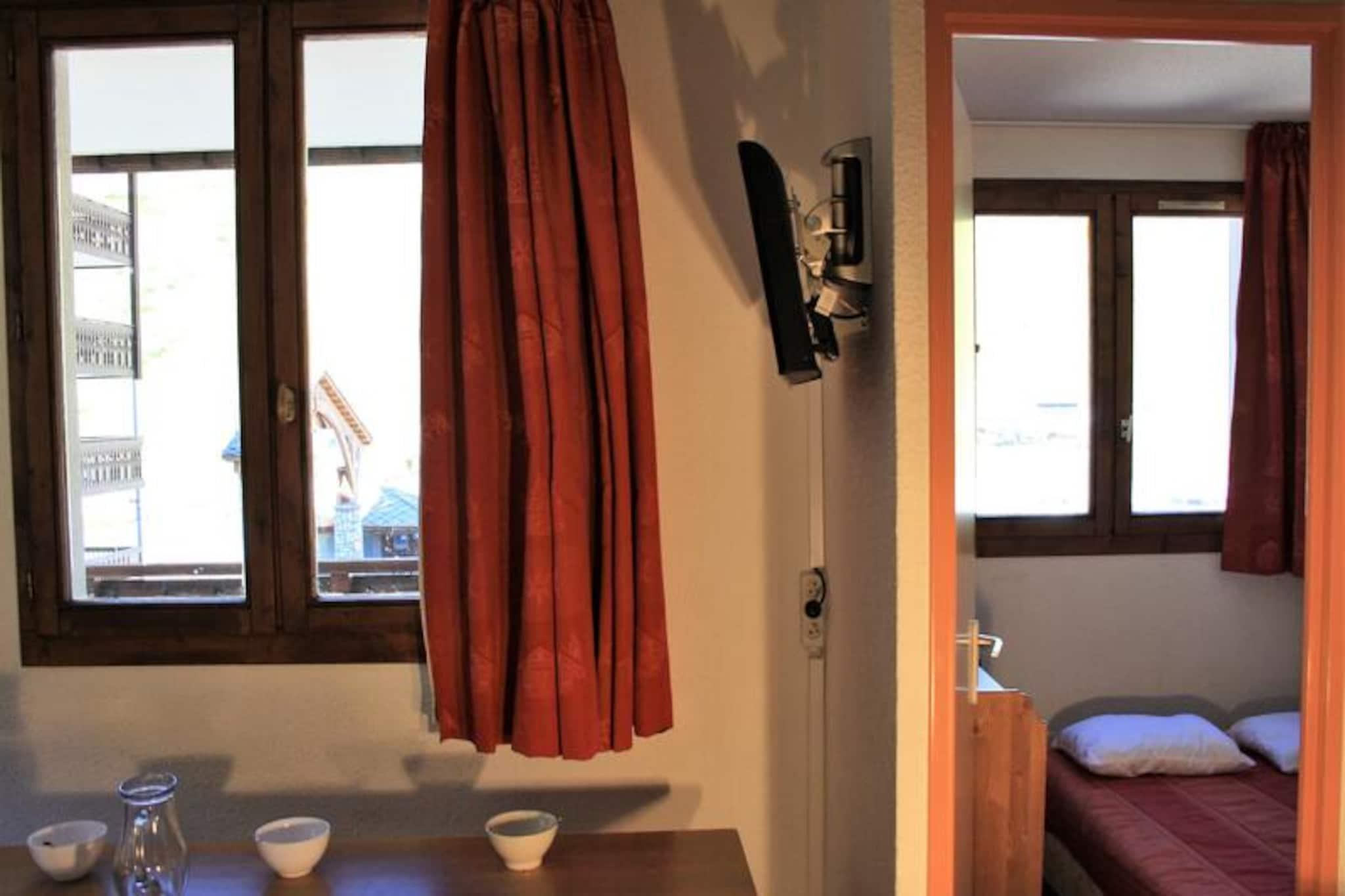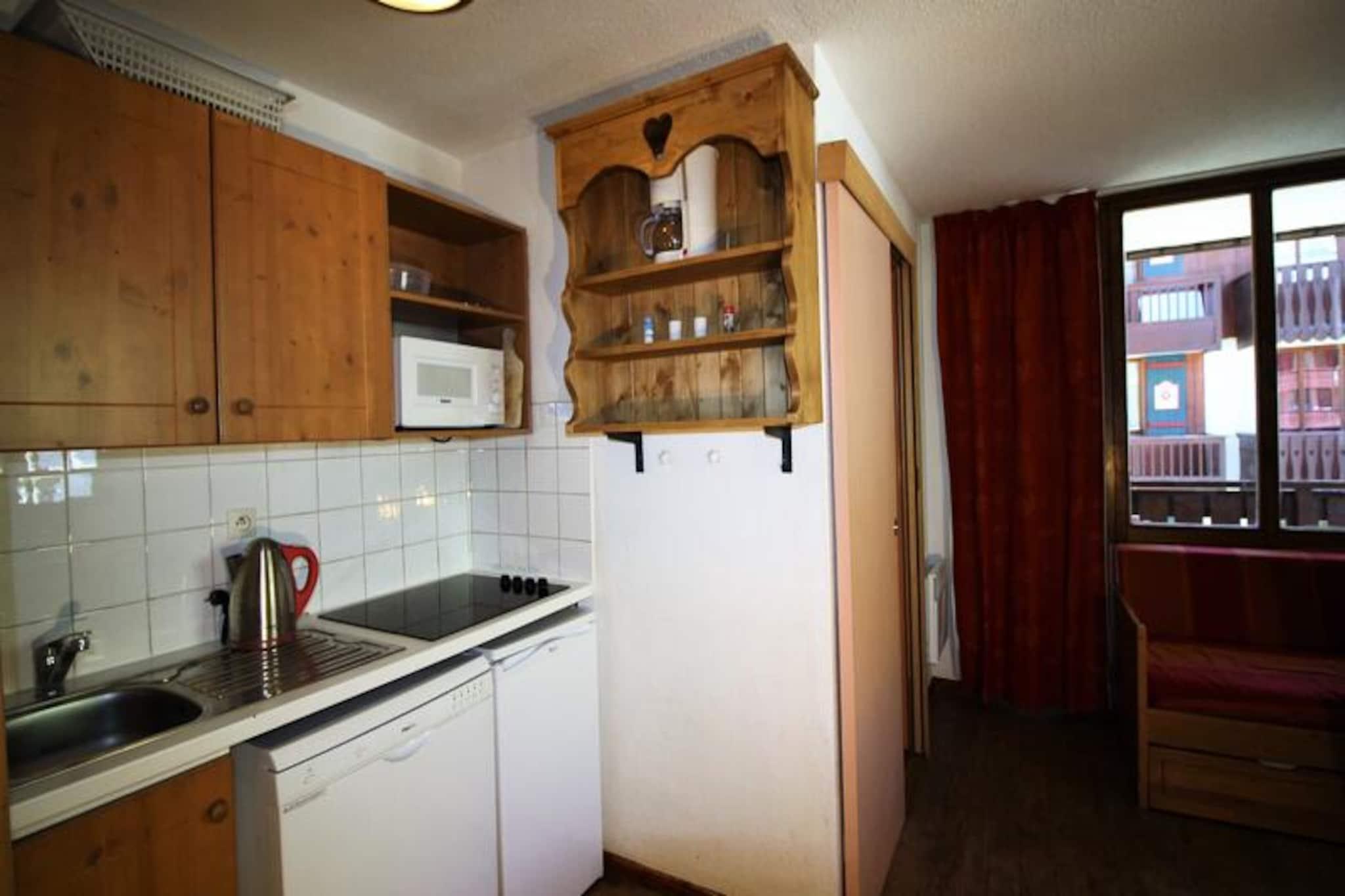 I hjertet af de betagende franske alper tilbyder denne charmerende lejlighed i LE ROND POINT DES PISTES-residensen et hyggeligt tilflugtssted for både skientusiaster og naturelskere. Med sin sydvestvendte balkon kan du nyde den alpine sol og den fantastiske udsigt over de omkringliggende tinder, hvilket skaber den perfekte kulisse for din bjergferie. Uanset om du er her for vintersport eller sommervandreture, lover denne ejendom en uforglemmelig oplevelse. \n\nLejligheden har komfortabel plads til op til seks gæster på tværs af sin gennemtænkte planløsning. En sovealkove med køjesenge, et privat soveværelse med en dobbeltseng og en stue med en udtræksseng sikrer rigelig plads til familier eller grupper. Tekøkkenet er udstyret med moderne bekvemmeligheder, herunder keramiske kogeplader, mikrobølgeovn, køleskab og opvaskemaskine, hvilket gør madlavning til en leg. Efter en dag med eventyr kan du slappe af i den hyggelige opholdsstue med fladskærms-tv eller slappe af på badeværelset med badekar og håndvask. Yderligere bekvemmeligheder inkluderer et separat toilet og private skibokse til problemfri opbevaring.\n\nBeliggende kun få skridt fra pisterne og skilifterne tilbyder boligen uovertruffen adgang til det berømte Paradiski-område. I nærheden finder du et udvalg af butikker, herunder et bageri, supermarked, barer og restauranter, alt sammen inden for 100 meter. Den franske skiskole ligger også bekvemt tæt på, hvilket gør denne beliggenhed ideel for både begyndere og erfarne skiløbere. Om sommeren forvandles området til et paradis for vandrere og cyklister med stier, der fremviser regionens naturlige skønhed.\n\nUanset om du søger spændende alpine eventyr eller fredelige øjeblikke omgivet af majestætiske landskaber, er denne lejlighed din port til det bedste af de franske alper. Book nu og skab minder, der vil vare hele livet.