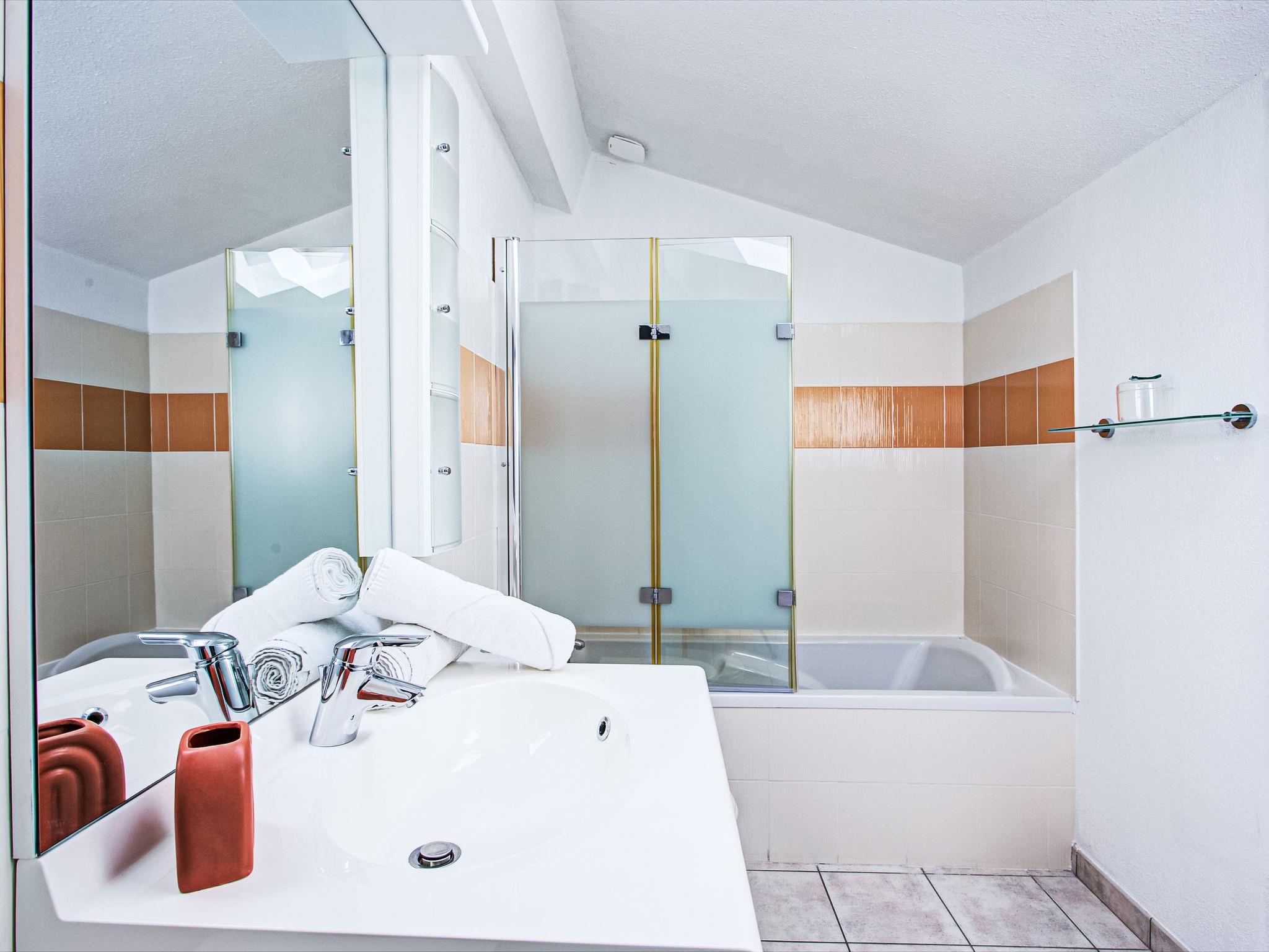 3-room terraced house 73 m2 on 2 levels, south facing position. Beautiful and tasteful furnishings: living/dining room with dining table, TV, air conditioning and electric shutters. Exit to the garden. 1 room with 1 french bed (1 x 140 cm, length 200 cm), bath/shower/WC. Kitchen (4 ceramic glass hob hotplates, toaster, kettle, microwave, electric coffee machine) with dining table. Upper floor: 1 room with 1 french bed (1 x 140 cm, length 200 cm), air conditioning. 1 open room with 1 x 2 bunk beds (90 cm, length 190 cm) with bath/shower/WC. Terrace 150 m2. Terrace furniture. Facilities: washing machine, iron, hair dryer. Parking (fenced 2 cars). Please note: smoke alarm. Offer by a private individual according to Art. 155, IV of CGI.