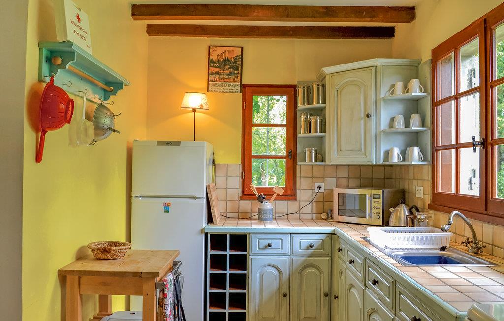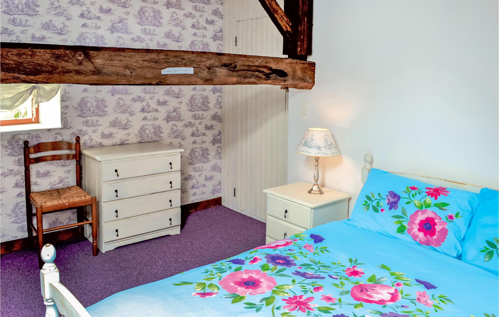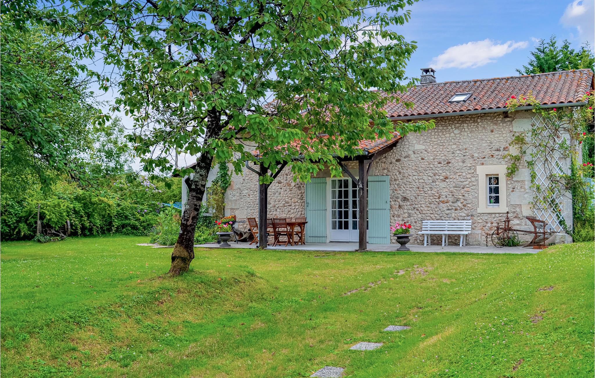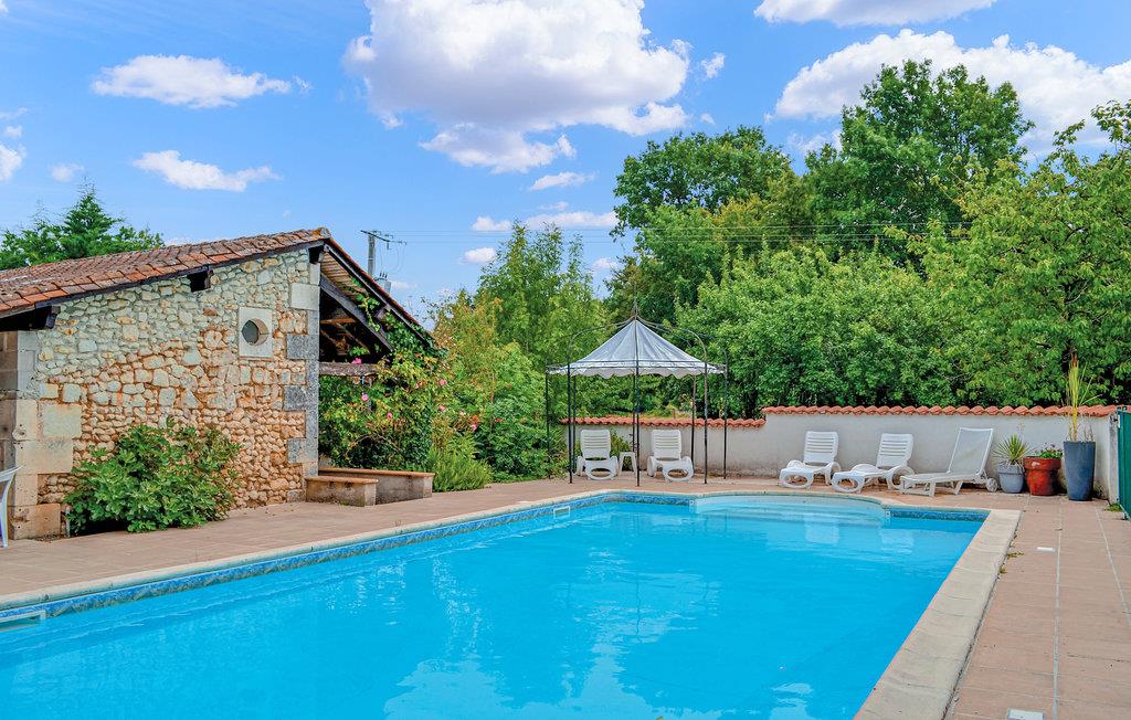 Huset har pejs og synlige loftsbjælker i eg, som giver en stemning af hygge. Det har beliggenhed i en stor privat have, hvor der er en overdækket terrasse foran huset, hvorfra der er udsigt over swimmingpoolen og haven. Swimmingpoolen er til rådighed fra maj til oktober. I den fredelige og stille lille landsby kan man nyde en ferie afsondret fra larm og støj.