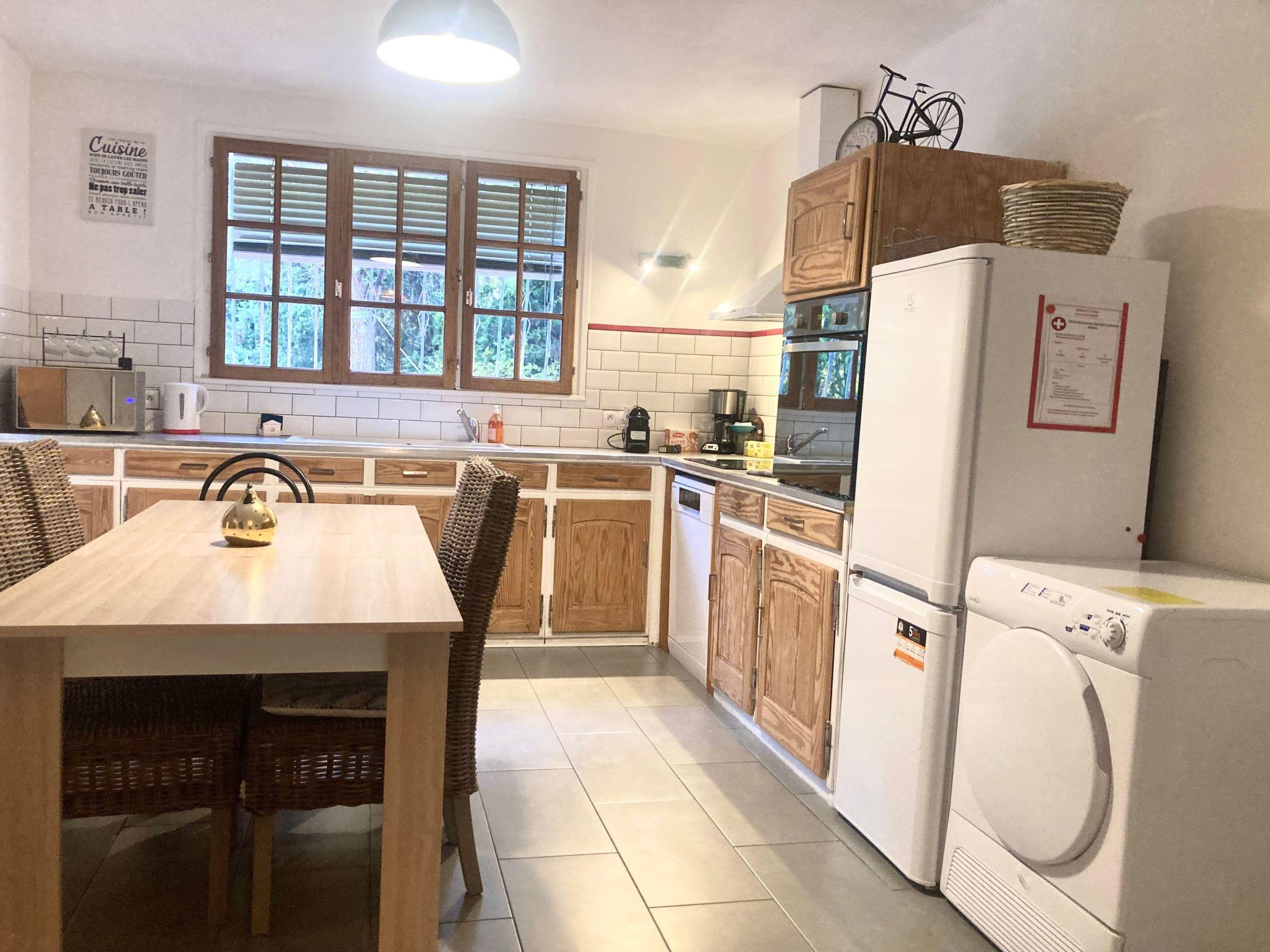 The interior of the house is fully equipped to meet all your needs during your stay. The three spacious bedrooms are ideal for resting after a day exploring the surrounding area. The house also has a practical bathroom, complete with a bathtub for your moments of relaxation. A private washing machine and tumble dryer provide all the comforts you need for an extended stay. Partial air conditioning, combined with three fans, ensures a cool and pleasant interior, while the fireplace adds a warm note to cooler evenings. The kitchen, the heart of the house, is fully equipped with an induction hob, two types of coffee maker, a dishwasher and an electric kettle, promising moments of conviviality and sharing over home-cooked meals.