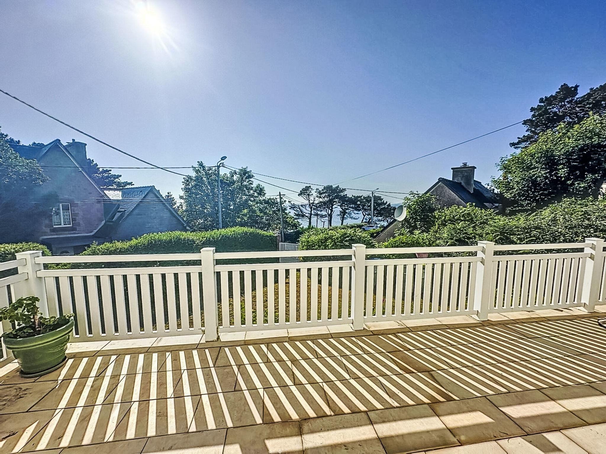 "Ty Poulpry", 5-room house 130 m2 on 3 levels. Spacious, partly renovated in 2024, comfortable and beautiful furnishings: living/dining room with open-hearth fireplace (only for decoration), TV (flat screen). Exit to the balcony, west facing position. Kitchen (oven, dishwasher, 3 ceramic glass hob hotplates, toaster, kettle, microwave, freezer, electric coffee machine, Capsules for coffee machine (Senseo) extra) with small dining table. Sep. WC. Upper floor: 1 room with 1 french bed (160 cm, length 190 cm). 1 room with 1 french bed (140 cm, length 190 cm). Shower/WC, double hand-basin. 2nd upper floor: 1 room with 1 french bed (140 cm, length 190 cm). 1 room with 1 french bed (2 x 80 cm, length 190 cm). Shower/WC, double hand-basin. Electric heating. Large balcony 20 m2, west facing position, terrace 18 m2, south facing position and, east facing position. Terrace furniture, barbecue, deck chairs (4). Beautiful view of the sea. Facilities: washing machine, iron, baby cot for up to 2 year olds, hair dryer. Internet (WiFi, free). Please note: non-smoking house. Smoke alarm. Offer by a private individual according to Art. 155, IV of CGI.