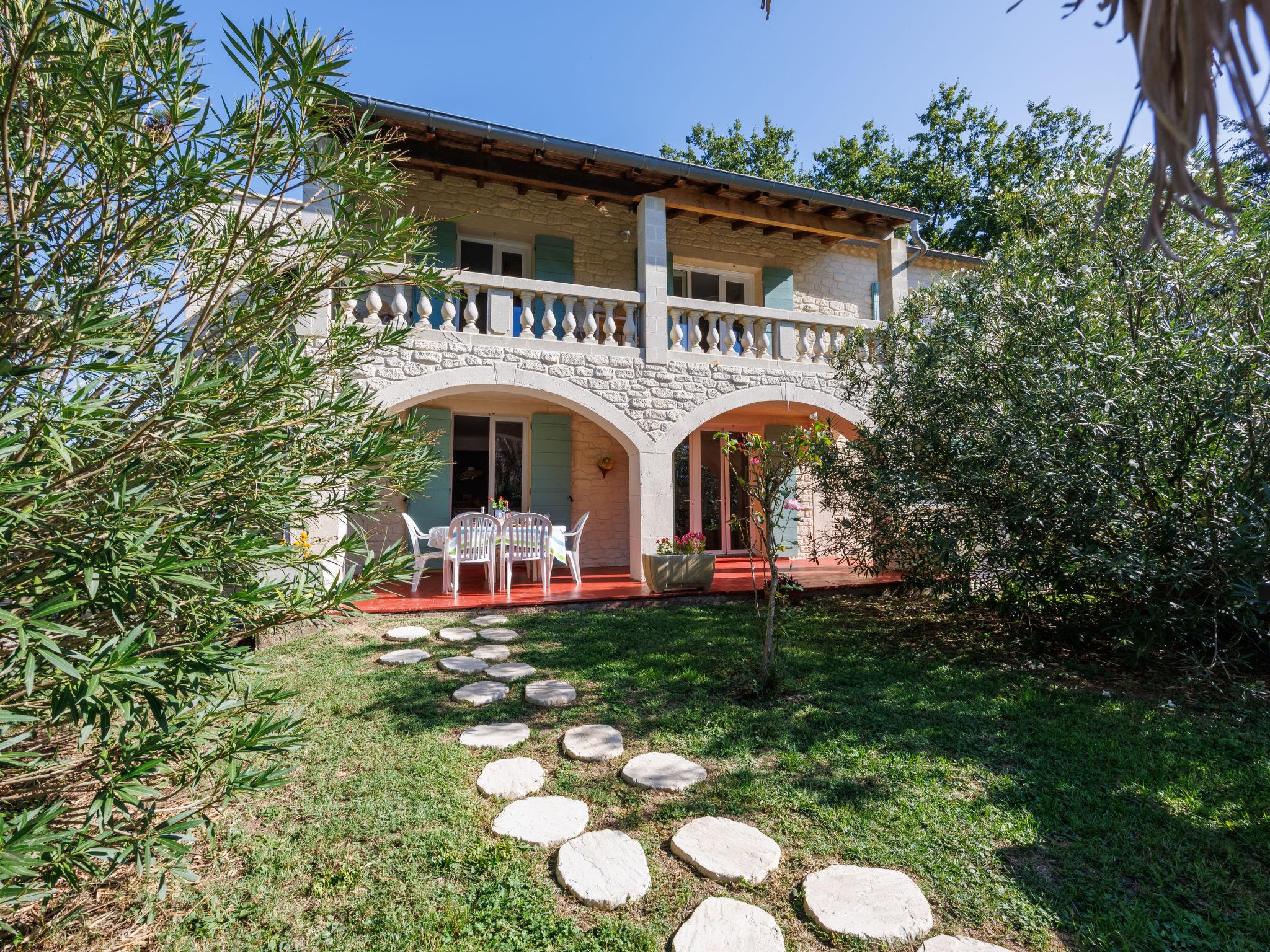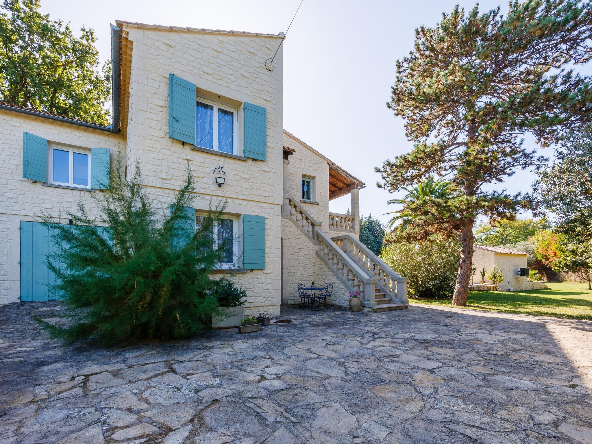 Uzès: Beautiful single-family house "L'Aouzet", 2 storeys, surrounded by trees. On the outskirts, 3 km from the centre of d'Uzès, in a secluded, quiet position, 73 km from the sea, 10 km from the lake, south facing position. Private: well-kept garden 3'000 m2 (fenced) with lawn and wildlife garden, swimming pool angular, heated, with privacy (12 x 6 m, depth 100 - 190 cm, seasonal availability: 01.May. - 15.Oct.) with alarm system. Outdoor shower, pool house, boules, badminton, garden furniture, barbecue, pool maintenance by the owner/gardener. In the house: table tennis, table football, trampoline. Parking (for 3 cars). Shop 3 km, grocery 3 km, supermarket 3 km, bakery 3 km, bus stop "Mairie" 1.5 km, bathing lake "Lac de la Bouscarasse" 10 km. Sports harbour 36 km, golf course (9 hole) 6 km, tennis 3 km, riding stable 15 km. Nearby attractions: Arènes de Nîmes 27 km, Vignobles de Tavel 24 km, Le Pont du Gard 15 km, Palais des Papes d'Avignon 40 km, Musée 1900 6 km, Musée du Bonbon 5 km. Well-known lakes can easily be reached: Lac Dupuy 10 km. Hiking paths: Sentier des Capitelles 2.5 km, La Vallée de l'Eure à Uzès 1.4 km, Le Belvédère des Garrigues 1.5 km. Please note: baby equipment (included).