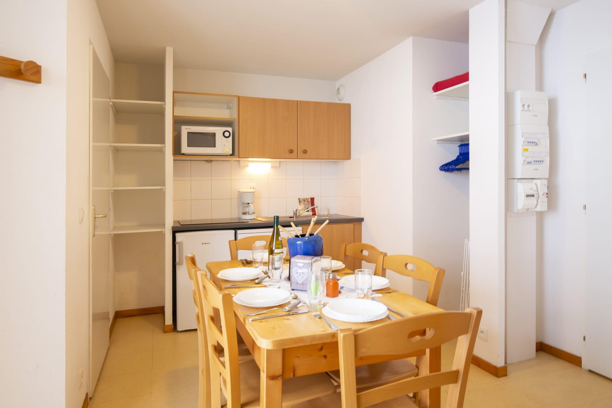 Sæt dig til rette i dette indbydende alpine gemmested i Termignon, hvor komfort møder eventyr. Den 31 m² store lejlighed er perfekt til familier eller venner og byder op til seks gæster velkommen med en hyggelig stue, en balkon med udsigt over bjergene og et tv til afslappede aftener. Det åbne køkken er fuldt udstyret med alt det nødvendige - fra køleskab og fryser til opvaskemaskine, mikrobølgeovn, kaffemaskine, elkedel og brødrister - hvilket gør det nemt at nyde hjemmelavede måltider sammen. Soverne er både fleksibelt og komfortabelt med en dobbelt sovesofa i stuen, to enkeltsenge i soveværelset og køjesenge gemt væk i entréen. Badeværelset har et badekar til et afslappende bad efter skiløb, samt et separat toilet for nemheds skyld. Et skirum, parkeringsplads og valgfri vaskeri tilføjer praktiske detaljer til dit ophold. Beliggende kun 50 meter fra gondolen har du problemfri adgang til et af verdens største skiområder, mens butikker og restauranter i nærheden gør din ferie ekstra behagelig. Ekstraudstyr såsom sengetøj, håndklæder og slutrengøring er tilgængeligt, og kæledyr er også velkomne.