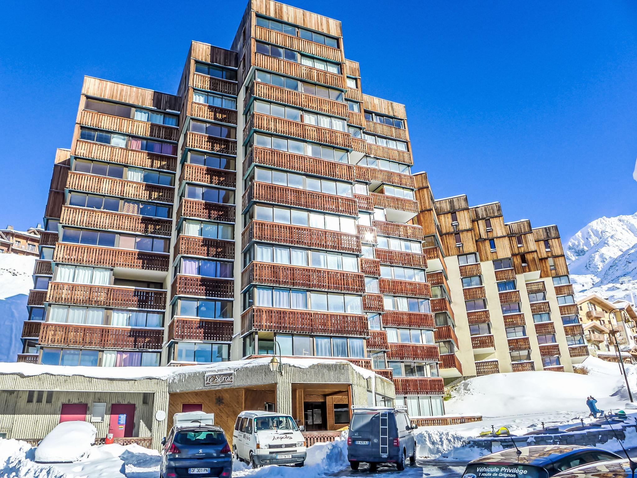 Simple residence "Le Sérac", 10 storeys. Above Val Thorens, in the district of Péclet, in the centre, 800 m from the lake, 50 m from the skiing area. In the house: WiFi (extra). Lift, storage room for skis, central heating system. In Winter: please take snow chains. Public car park at 200 m, extra. Shop 100 m, grocery 150 m, supermarket 150 m, shopping centre 100 m, restaurant 50 m, bar 250 m, bakery 150 m, café 50 m, pedestrian zone 100 m, 5 minute walk to the centre, bus stop "Navette Gratuit" 100 m. Skisport facilities 100 m, slopes 50 m, ski rental, ski bus stop, ski school 150 m, ski-kindergarten 50 m, ice rink, children's playground. Well-known ski regions can easily be reached: 3 Vallées. Well-known lakes can easily be reached: Lac du lou 1 km, Lac Du menuieres 800 m. Please note: entertainment in the season. The owner does not accept any groups. In case of good snow conditions, the house is accessible on skis.