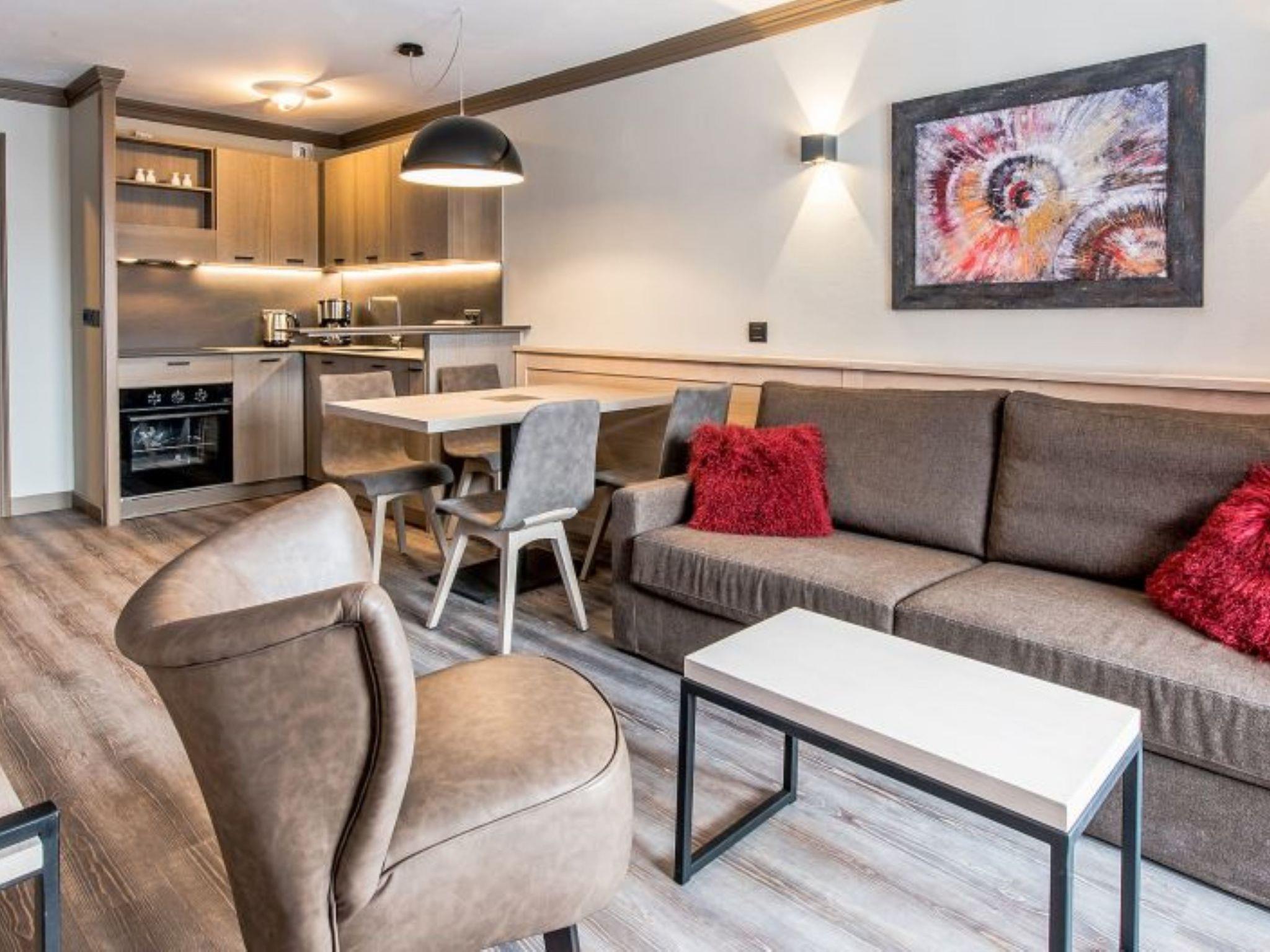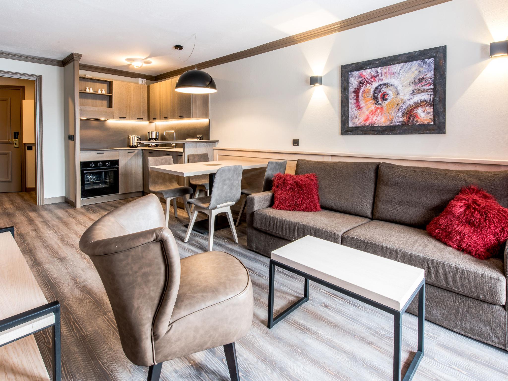 "Village Montana", 3-room apartment 41 to 45 m2. Modern and tasteful furnishings: living room with dining table and satellite TV. 2 rooms, each room with 2 beds. Kitchenette (oven, dishwasher, 4 ceramic glass hob hotplates, toaster, kettle, microwave, electric coffee machine). Bathroom, sep. WC. Heating. Balcony. Beautiful view of the mountains. Facilities: safe. Internet (WiFi, free).