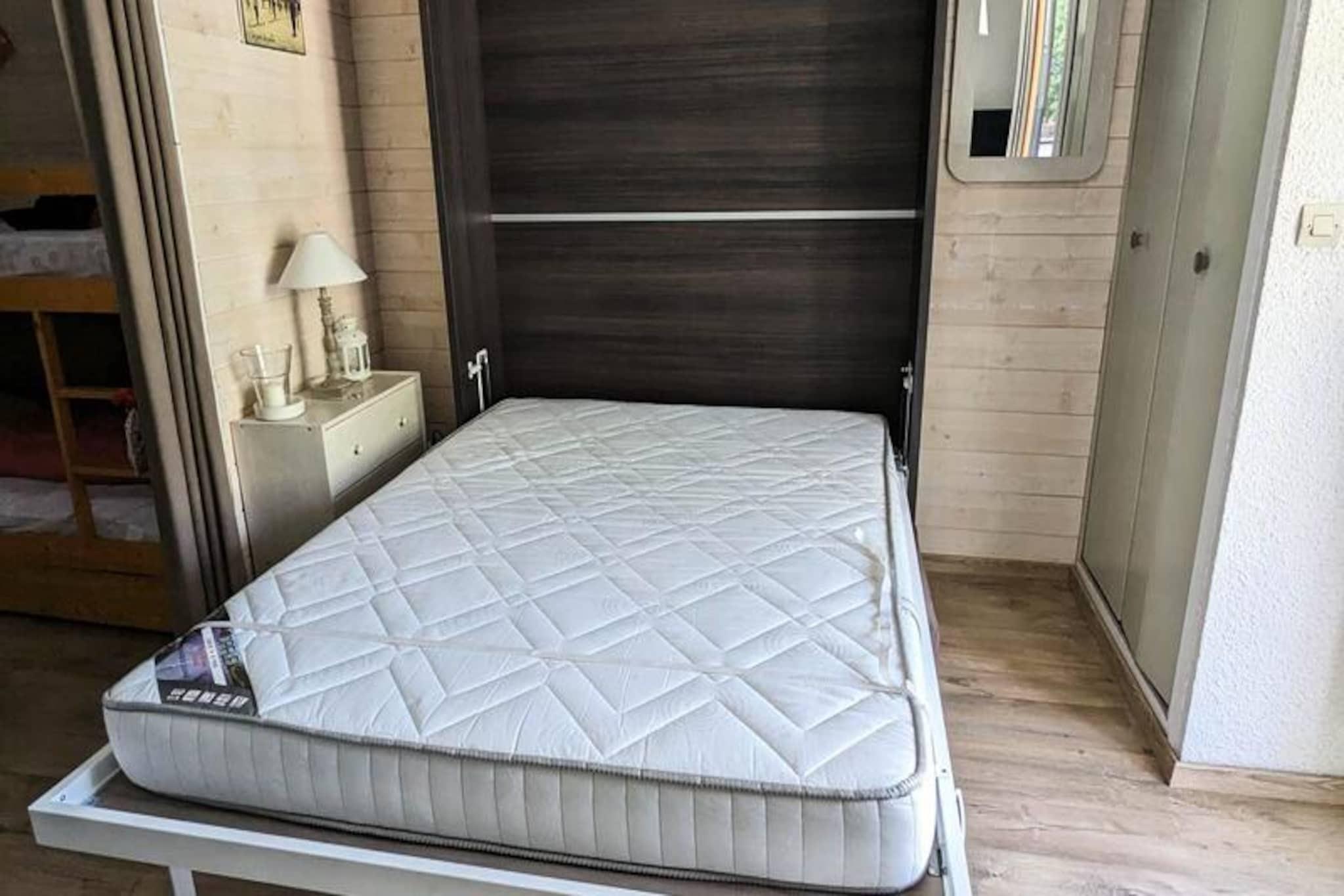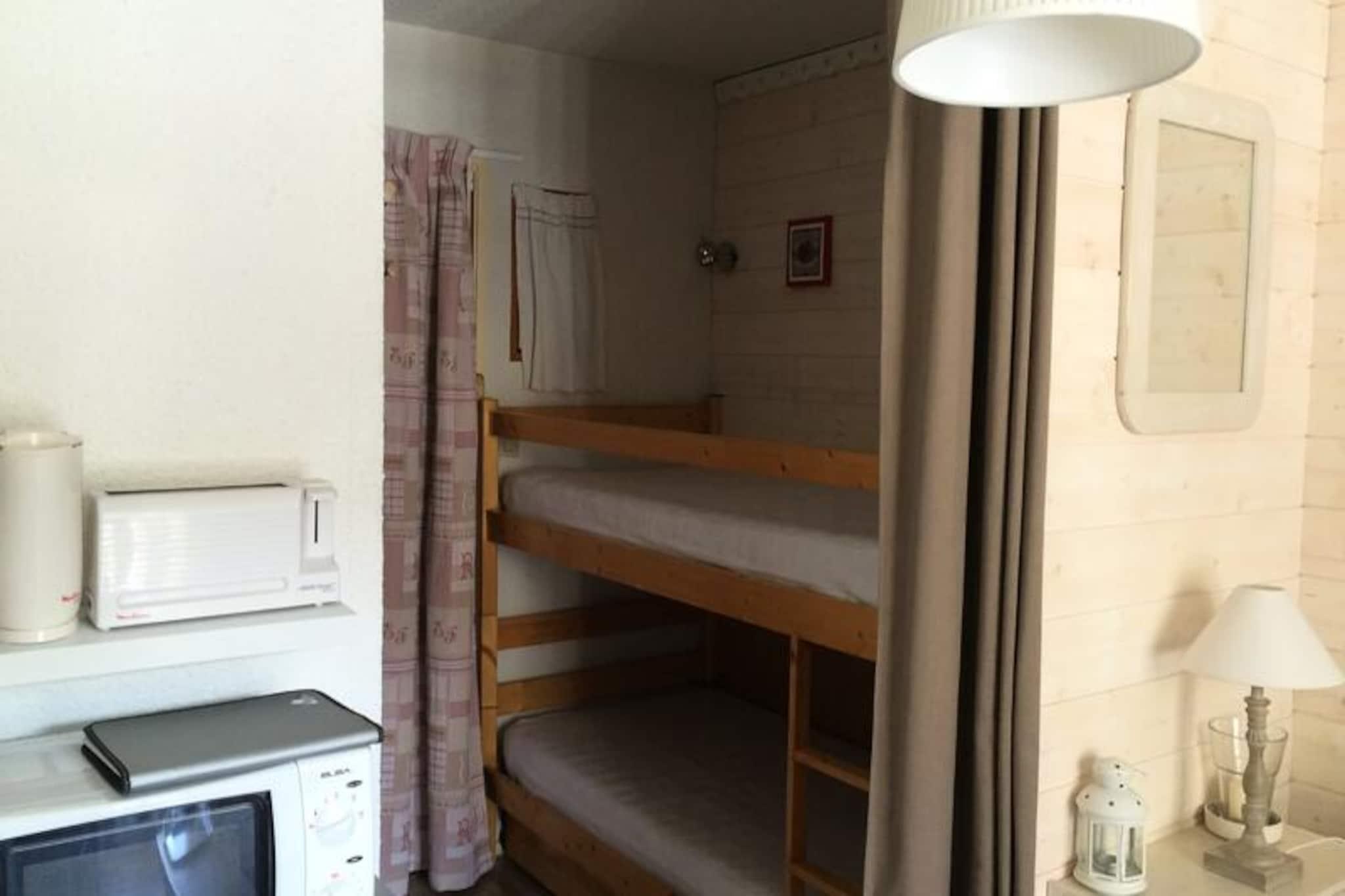 I hjertet af den charmerende alpelandsby Valloire tilbyder dette hyggelige tilflugtssted en intim oase for op til tre gæster. Beliggende i den fredelige Clos des Etoiles-residens, er ejendommen perfekt placeret kun 130 meter fra lokale butikker og en kort gåtur fra Crêt de la Brive-svævebanen, hvilket gør den til en ideel base for vintersportsentusiaster. Om sommeren forvandles beliggenheden til et paradis for afslapning og eventyr, med fritidscentret med swimmingpool, skøjtebane og wellness-område kun 220 meter væk, og en legeplads inden for rækkevidde. Lejlighedens gennemtænkte planløsning sikrer komfort og praktisk anvendelighed. Indgangsområdet, adskilt af et forhæng, har køjesenge, mens stuen kan prale af en udtræksseng med en integreret sofa, der tilbyder en hyggelig soveplads. Tekøkkenet er udstyret med essentielle apparater, herunder ovn, mikrobølgeovn, køleskab og elektrisk kogeplade, der giver mulighed for hjemmelavede måltider efter en dag med udforskning. En vestvendt balkon giver et roligt sted at nyde den friske bjergluft, komplet med et bord og stole til udendørs øjeblikke. Valloires centrale beliggenhed i Maurienne-dalen betyder, at du er omgivet af betagende alpine landskaber og uendelige aktiviteter. Om vinteren er skiløjperne og skolen kun få minutter væk, mens sommeren inviterer dig til at udforske vandrestier, cykelruter og familievenlige attraktioner. Uanset om du søger spændende eventyr eller rolige øjeblikke, tilbyder denne charmerende lejlighed de perfekte rammer for uforglemmelige minder i de franske alper.