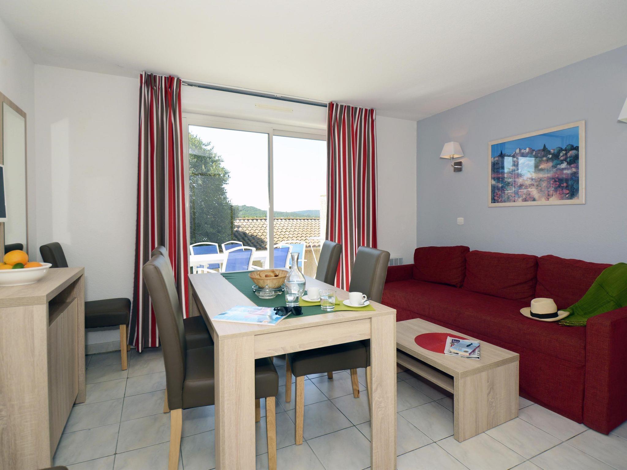"Odalys Référence Les Hauts de Salavas", 2-room apartment 28 m2. Object suitable for 4 adults + 1 child. Bright, practical furnishings: living/sleeping room with 1 sofabed, 1 pull-out bed, dining table and TV. 1 room with 1 x 1 bunk beds, 2 sleeping facilities. Kitchenette (4 hot plates, dishwasher, microwave, electric coffee machine). Shower/WC. Electric heating. Balcony or terrace. Balcony furniture. Facilities: children's high chair, baby cot. Internet (WiFi, extra). Please note: non-smokers only. Maximum 1 pet/ dog allowed. Smoke alarm.