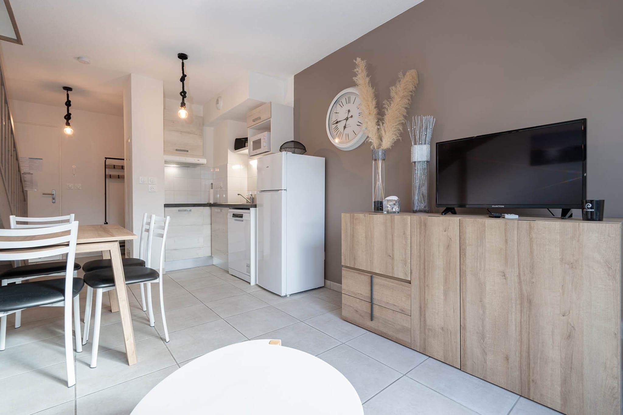 Denne lyse og hyggelige villa på 60 m² i Valras-Plage er det perfekte valg for familier eller små grupper, og tilbyder to soveværelser og plads til op til seks gæster. Beliggende kun 450 meter fra sandstranden og en nærliggende restaurant, og kun 2 km fra et supermarked, giver det en fredelig og bekvem base for en afslappende kystferie. Villaen har en privat have med udendørsmøbler, en terrasse og en grill - ideel til at nyde måltider under solen eller slappe af i den friske havbrise. Gæsterne drager fordel af aircondition, elvarme og udendørs parkering i bygningen, hvilket sikrer komfort og lethed året rundt. Indvendigt er det elektriske køkken i åbent plan fuldt udstyret med køleskab, mikroovn, fryser, opvaskemaskine, kaffemaskine, brødrister, kedel og alle nødvendige redskaber. Uanset om du forbereder en hurtig morgenmad eller en afslappet middag, er alt lige ved hånden for et glat og behageligt ophold.