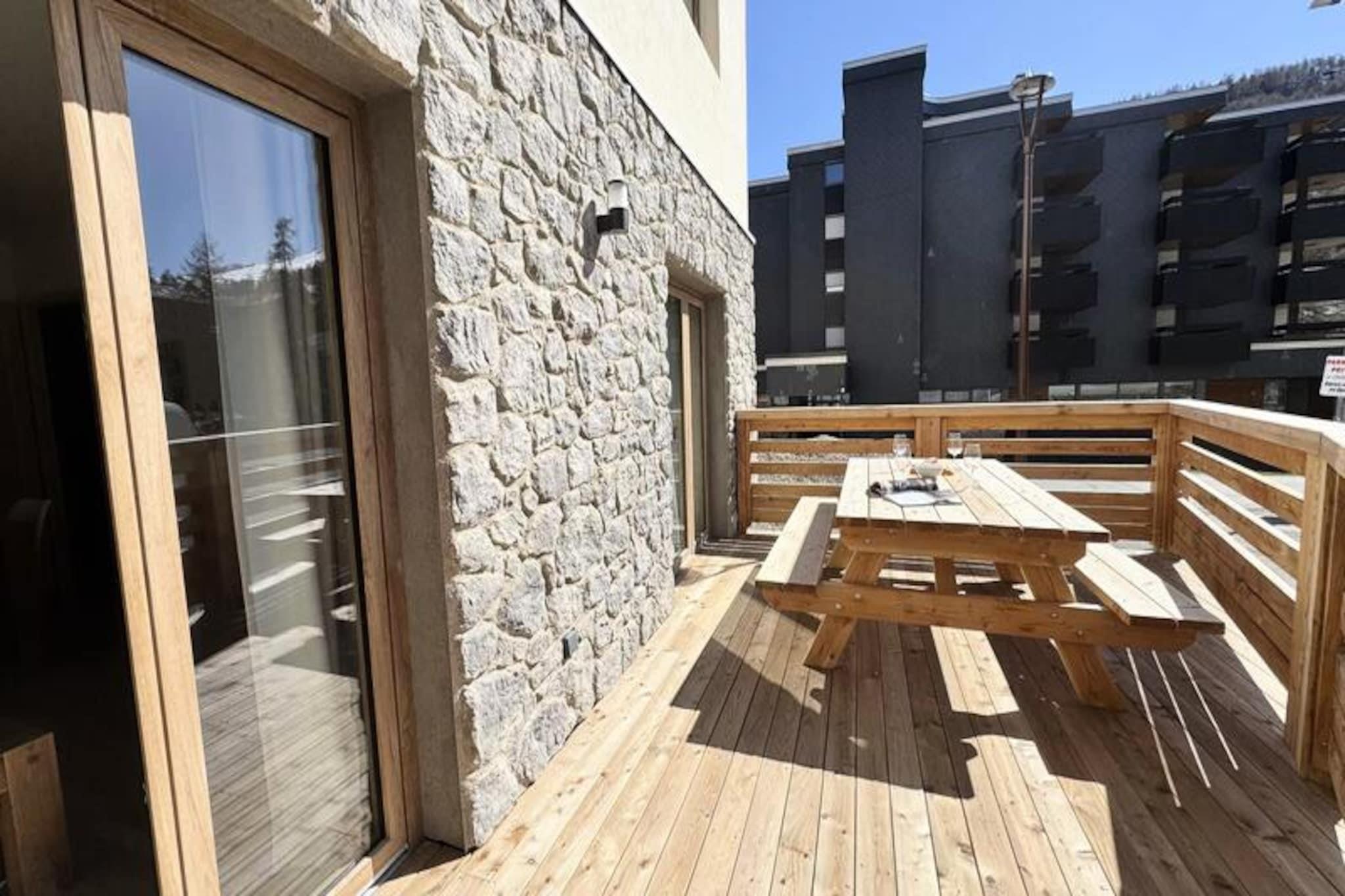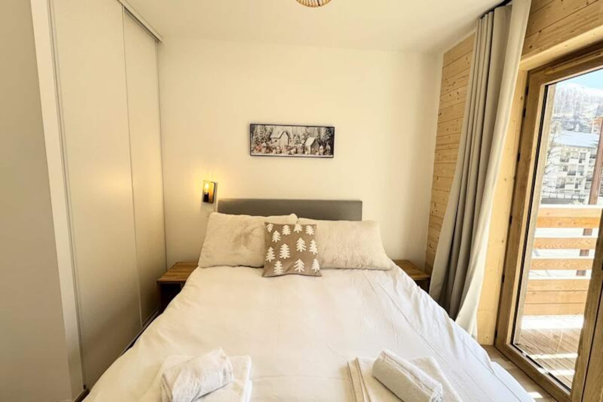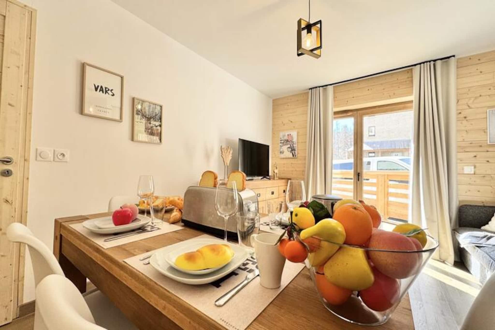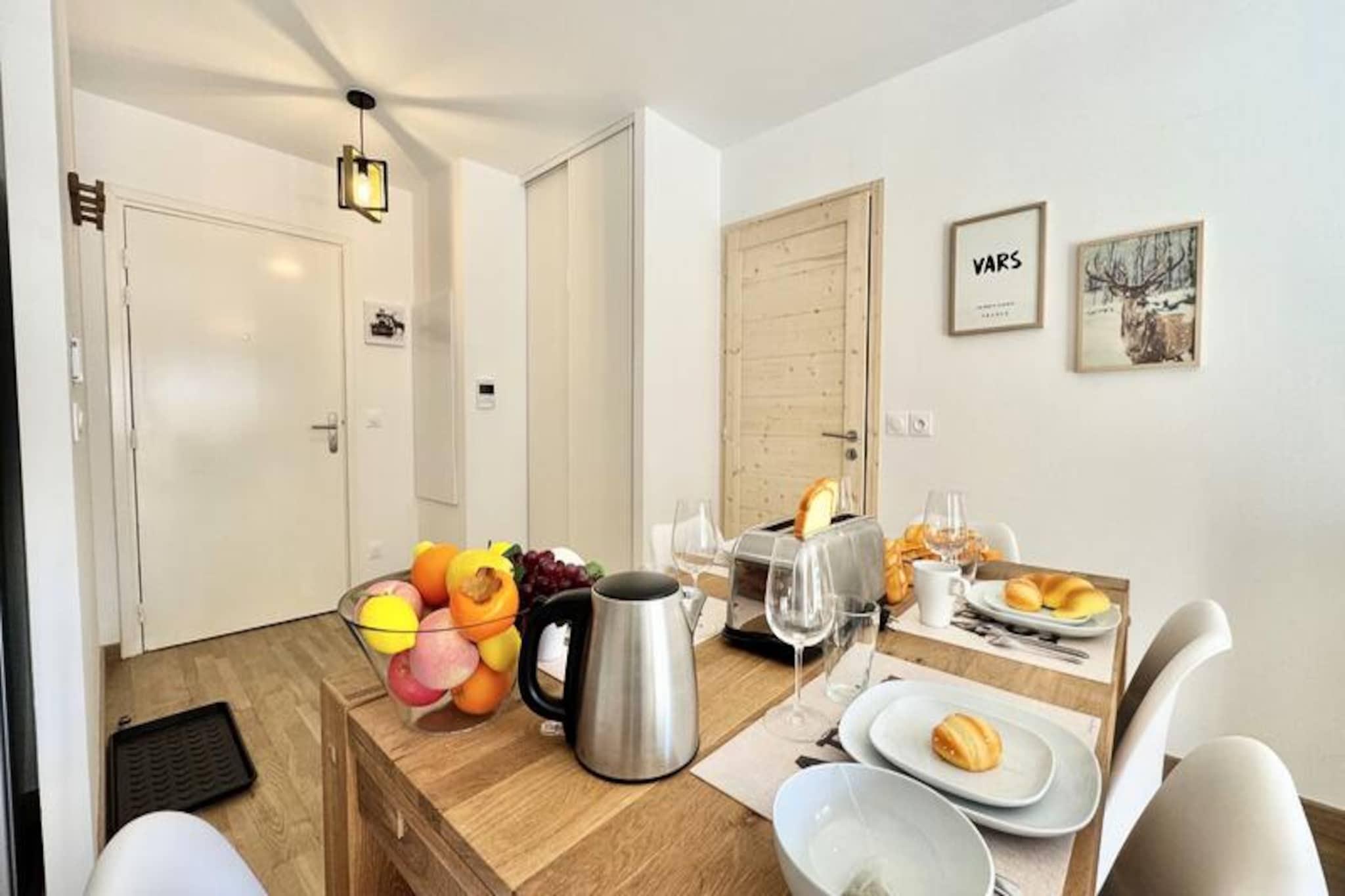 I det pulserende hjerte af Vars Les Claux tilbyder denne nybyggede bolig et exceptionelt alpint tilflugtssted kun få skridt fra butikkerne og blot 150 meter fra skiløjperne. Forestil dig at vågne op til den friske bjergluft og nyde det naturlige lys fra din sydøstvendte terrasse, mens de snedækkede tinder inviterer dig til at udforske. Uanset om du er her for vintersport eller sommervandreture, er denne moderne lejlighed din port til de franske alpers skønhed. \n\nIndenfor kan lejligheden prale af en rummelig og moderne stue udstyret med et tv, der er problemfrit forbundet med et åbent køkken. Køkkenet er en kokkes drøm med avancerede apparater såsom en Nespresso-kaffemaskine, juicer og opvaskemaskine, der sikrer, at hvert måltid er en fornøjelse at tilberede. Sovearrangementet er designet til ultimativ komfort, med et hyggeligt soveværelse med to 120 x 200 cm senge og et andet soveværelse med en luksuriøs 160 x 200 cm dobbeltseng. Et elegant badeværelse og separat toilet fuldender planløsningen, mens den private overdækkede parkeringsplads gør dit ophold mere bekvemt. \n\nResidensens førsteklasses beliggenhed placerer dig i nærheden af ??skiløjperne, hvilket gør den perfekt til ivrige skiløbere og friluftsentusiaster. Om sommeren tilbyder de omkringliggende stier og betagende landskaber uendelige muligheder for eventyr. Nærliggende butikker og restauranter sikrer, at du har alt, hvad du behøver, lige ved hånden, mens Vars charme tilføjer et strejf af magi til din ferie. \n\nMed sengelinned inkluderet, opredte senge ved ankomst og slutrengøring garanterer denne lejlighed et problemfrit og mindeværdigt ophold. Uanset om du søger spændende dage på pisterne eller rolige aftener i bjergene, er denne ejendom dit ideelle hjem væk fra hjemmet i Vars Les Claux.