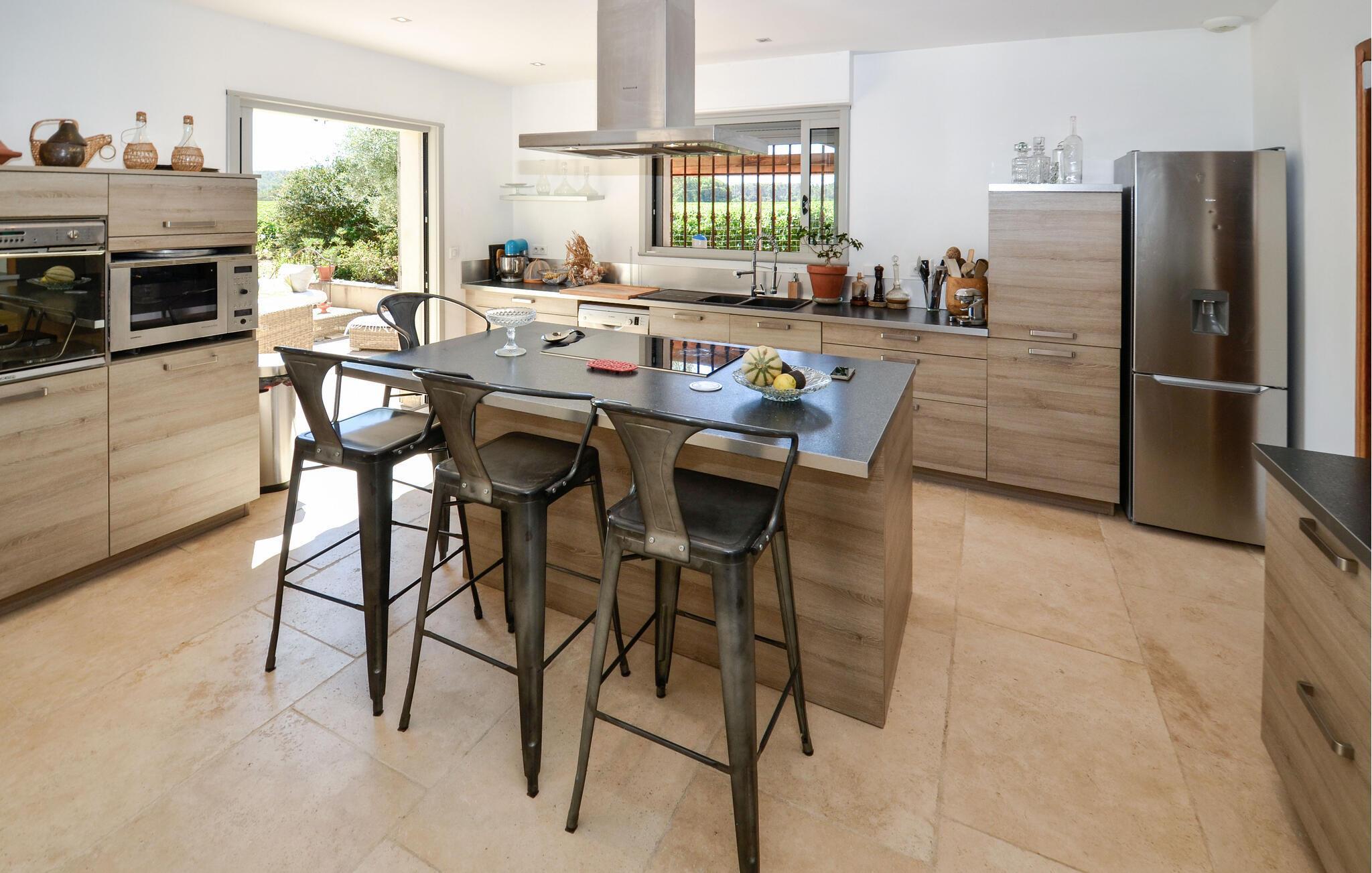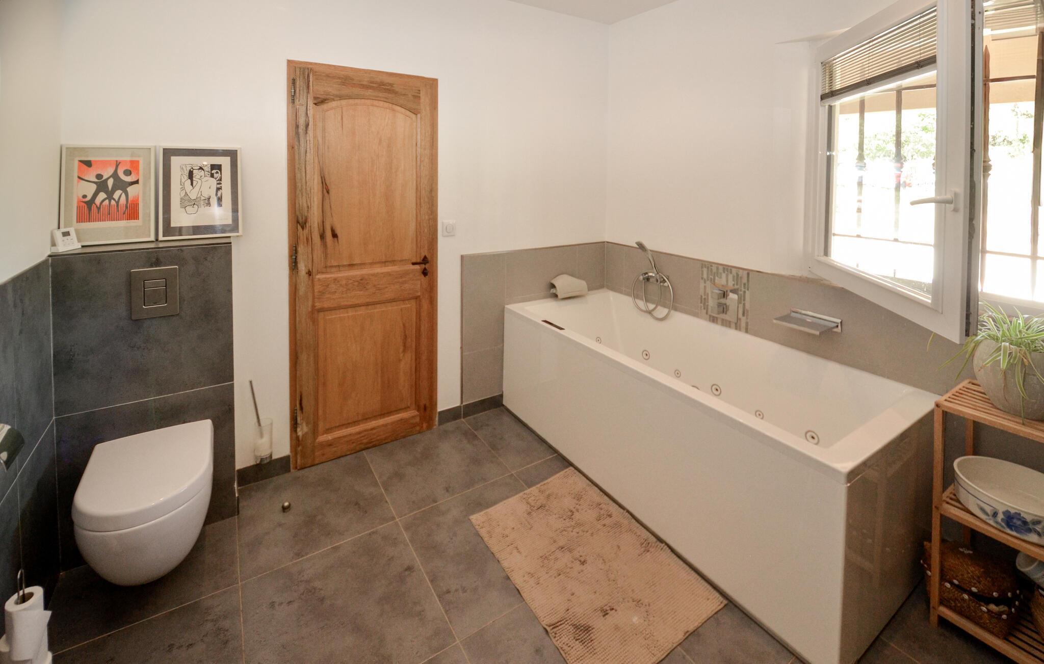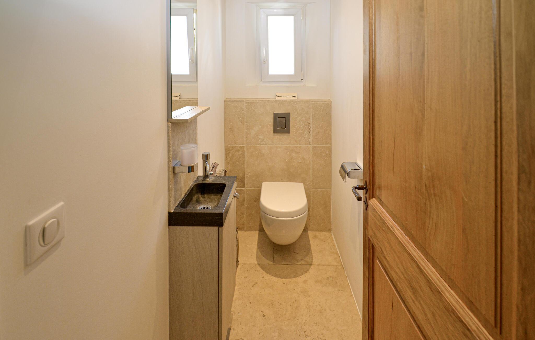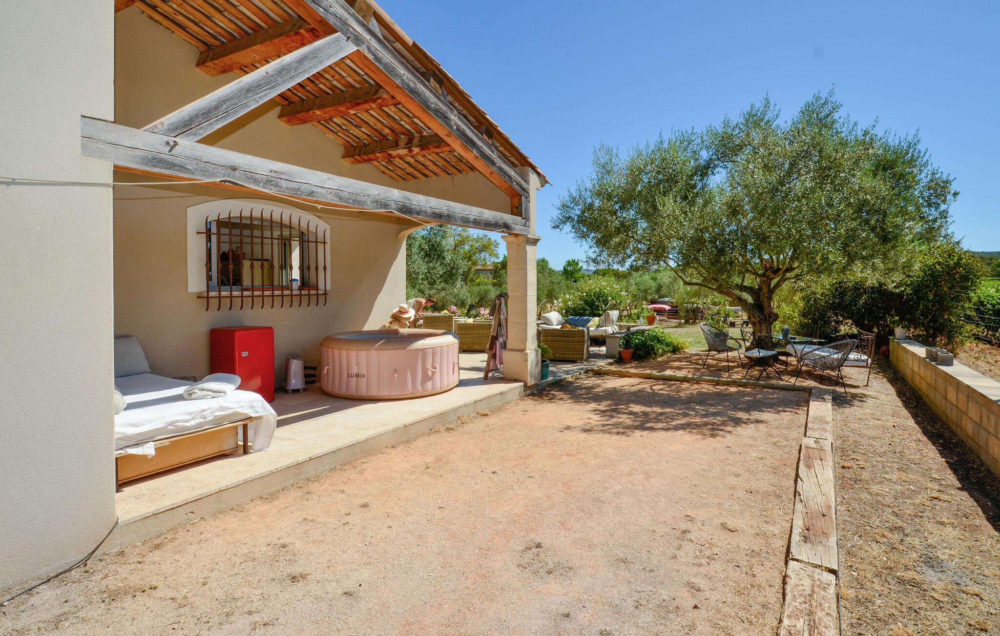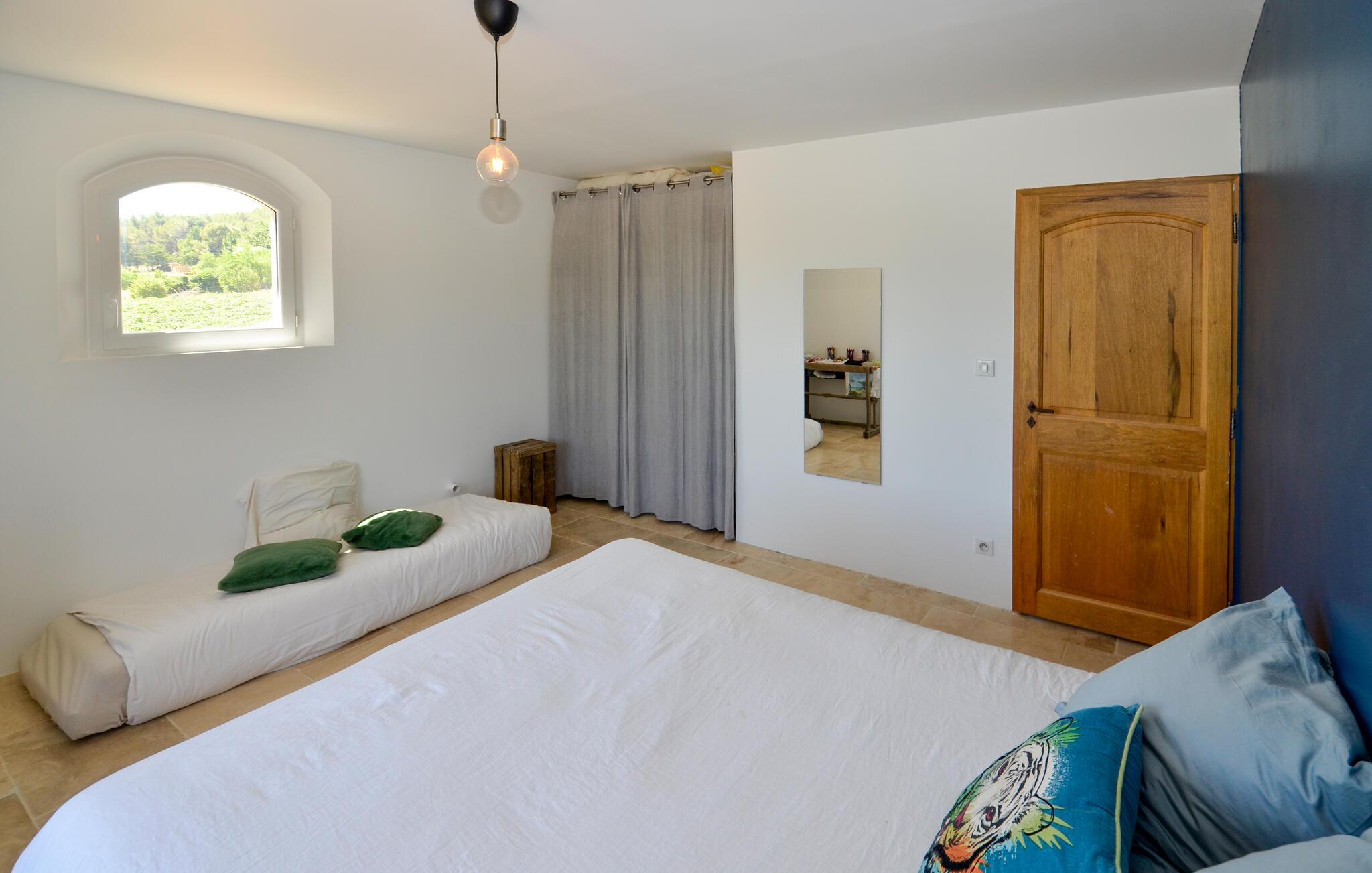 Oplev en drømmeferie i dette fortryllende feriehus med pool i en idyllisk beliggenhed. Beliggende midt i et malerisk, grønt landskab byder denne rummelige og komfortable oase af ro jer velkommen. Her kan I nyde en vidunderlig ferie med hyggelige måltider, sjove madlavningsaftener og hyggelige sammenkomster med familien. Det rummelige, smagfuldt indrettede interiør byder på masser af plads til stimulerende samtaler og harmoniske spilleaftener. Det store, idylliske udendørsområde er perfekt til gæster i alle aldre, der fuldt ud kan nyde det behagelige klima i Provence. Forfrisk jer i poolen mellem oliventræerne, find et hyggeligt sted at læse, snak over et glas vin i skyggen og skab uforglemmelige minder med stemningsfulde grillaftener under stjernehimlen. Gå en tur gennem den gamle bydel i Aix-en-Provence og prøv regionale specialiteter på det farverige marked. Vandr i naturparken Sainte-Victoire eller cykl gennem lavendelmarkerne og vinmarkerne. Besøg Château La Coste eller tag en tur til den turkisblå middelhavskyst.