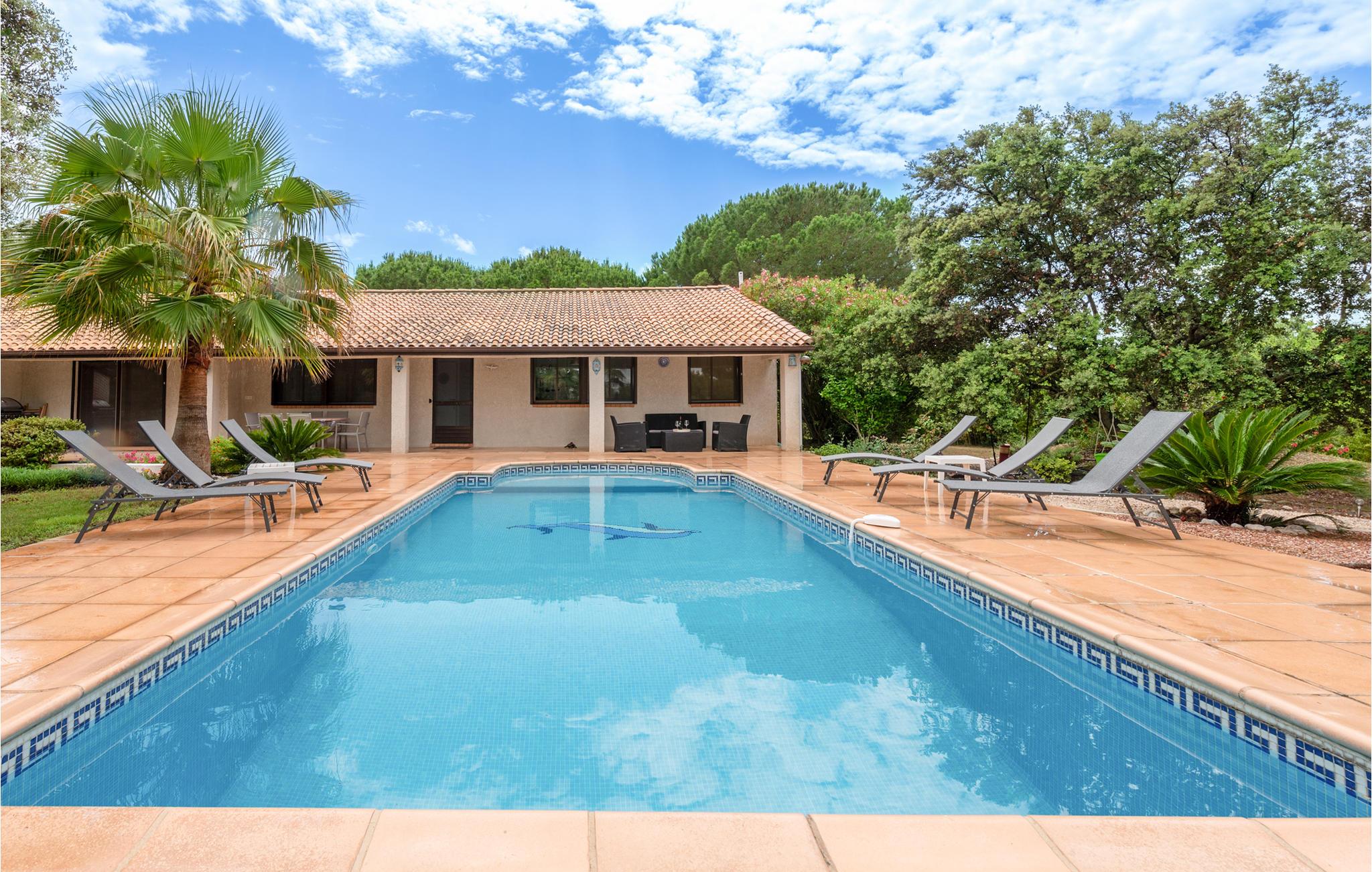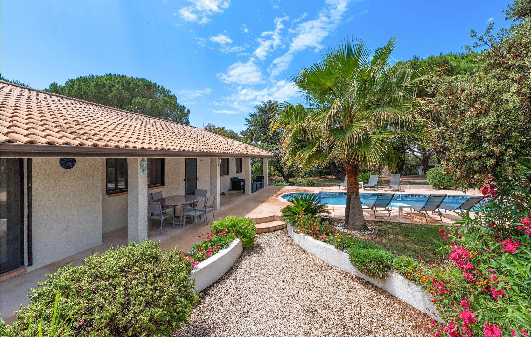 I kommer til at bo 15 km fra Béziers og 3 km fra nærmeste sandstrand. Her er plads til op til otte feriegæster der har både plads og komfort til en skøn ferie. Den store have er én stor legeplads til familiens små, som naturligvis også kan more sig i poolen.