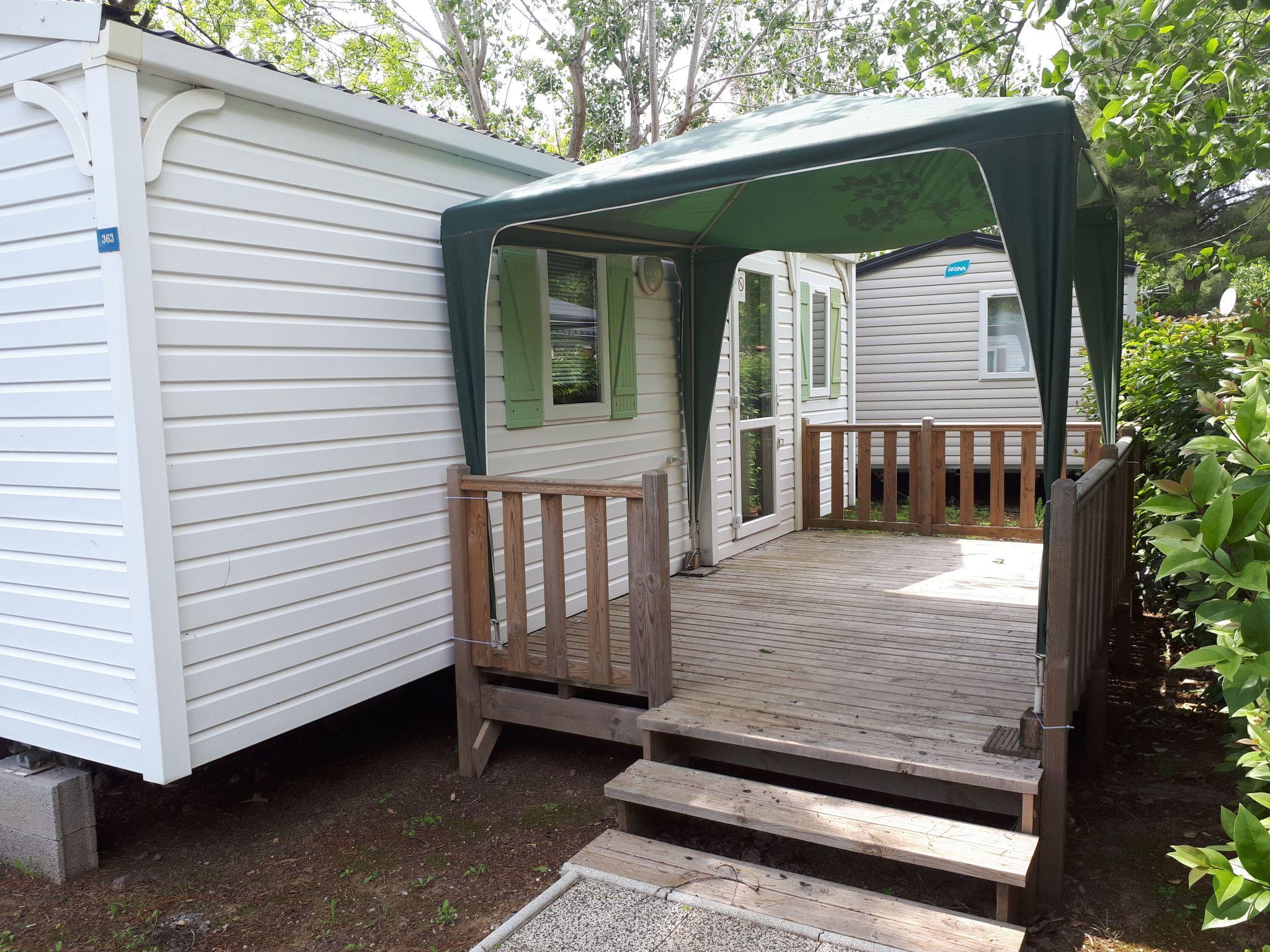 Mobile home IRM 29 m2, air conditioning. 2 bedrooms suitable for 4-5 pers. 1 bedroom with double bed and 1 bedroom with 2 single beds. Lounge area converts into fifth bed. Wooden terrace with garden furniture and party tent.