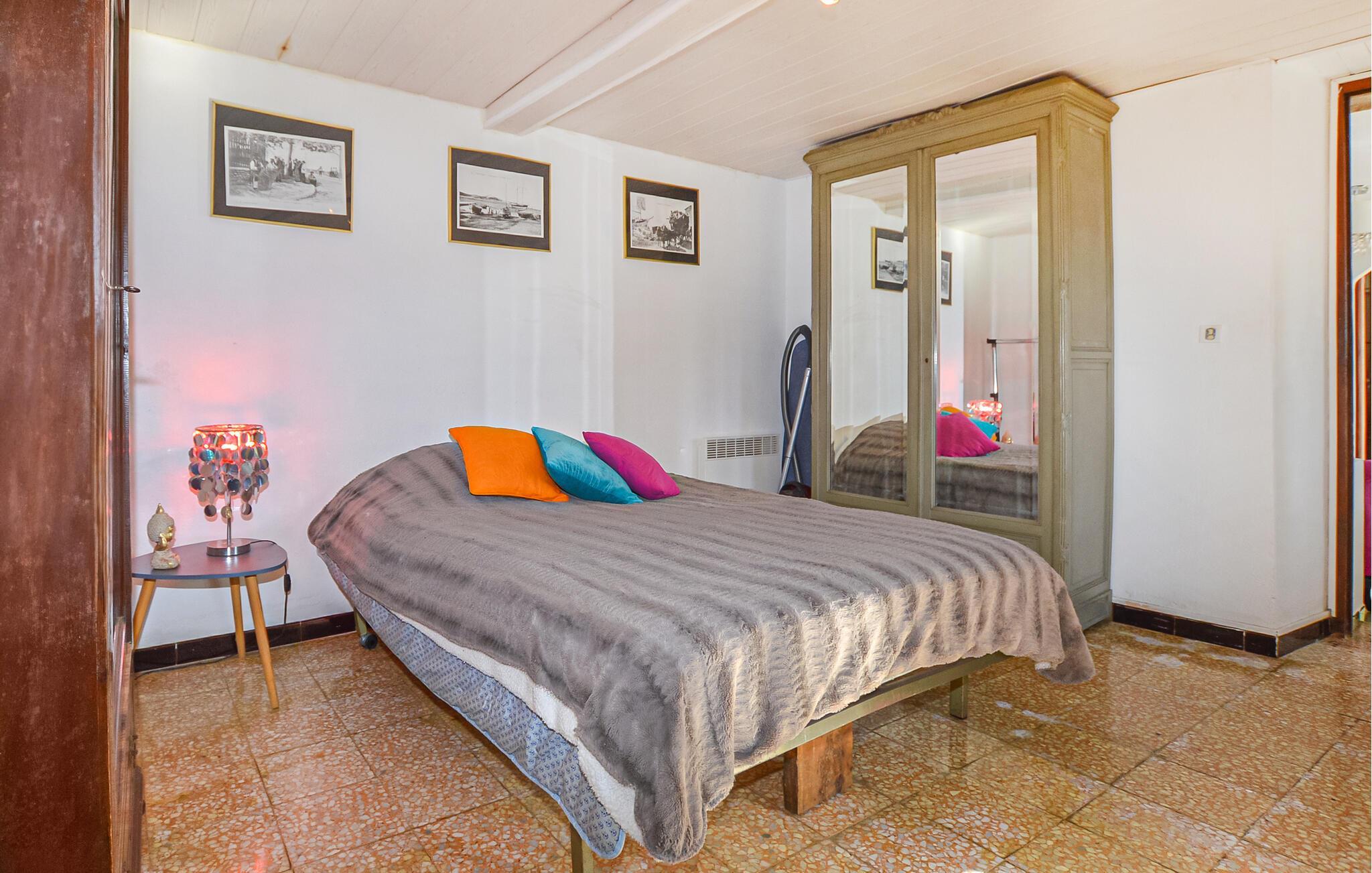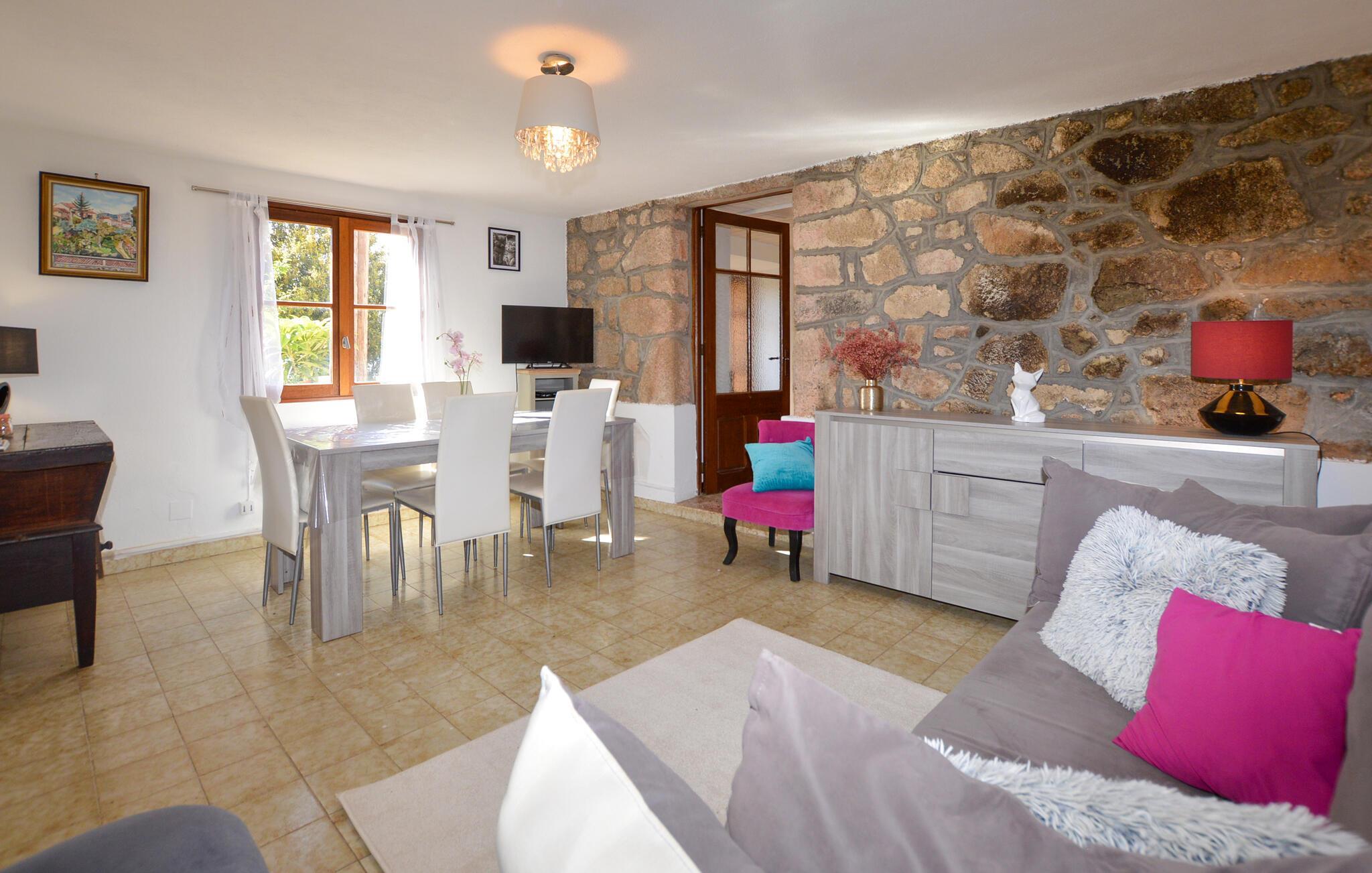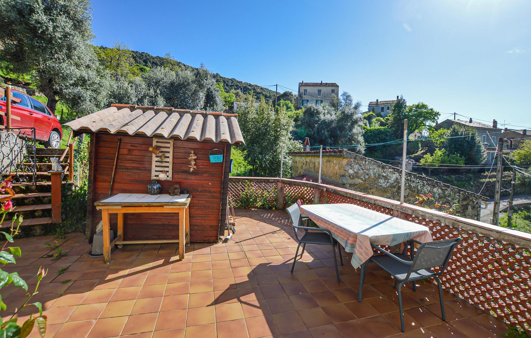 Nyd en afslappende ferie med middelhavsatmosfære og panoramaudsigt over de korsikanske bjerge. Den rolige beliggenhed i jeres ferielejlighed og den direkte adgang til en rummelig terrasse gør den ideel til dem, der søger natur, afslapning og korsikansk stil. Gør jer til rette i den lyse opholdsstue med direkte adgang til køkkenet, som er udstyret med omhyggeligt udvalgte møbler og et spisebord. Værelset er behageligt møbleret med individuelle naturstensvægge, der skaber en traditionel atmosfære. Tilbered jeres måltider i det lille, funktionelle køkken og nyd korsikanske specialiteter i hyggeligt selskab. Brug terrassen til morgenmad eller aftensmad udendørs. Omgivet af det smukke landskab kan I nyde afslappende timer og en spektakulær udsigt, der strækker sig helt til bjergene. Besøg historiske Vico med dens smalle gader og oplev den romanske kirke Saint-François. Tag på vandretur gennem den nærliggende Liamone-dal eller kør til Korsikas vestkyst, hvor smukke strande, bugter og turkisblåt vand venter på jer i Sagone eller Cargèse.