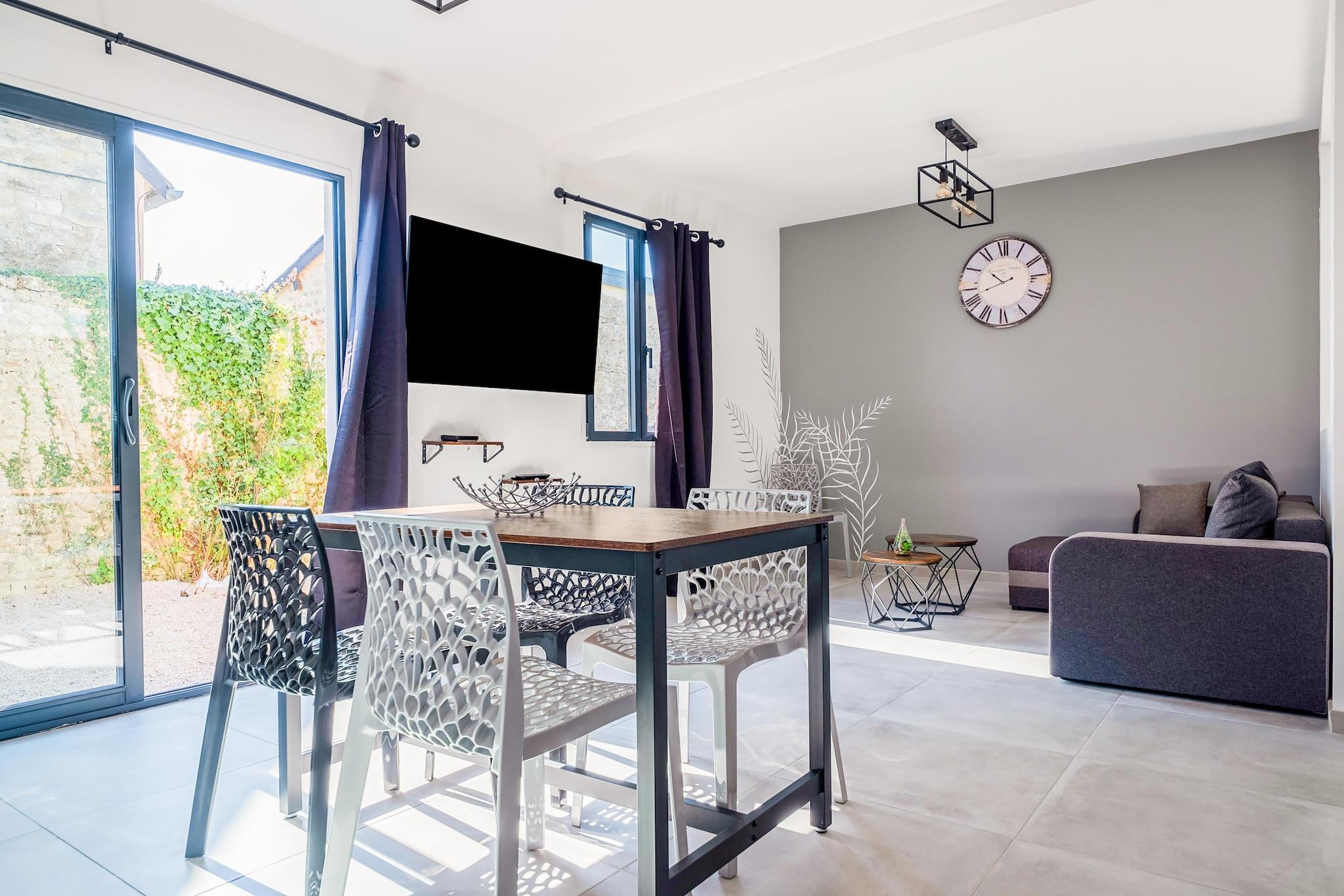 Beliggende i Vierville-sur-Mer, dette charmerende feriehus til 6 gæster har moderne interiør og en rummelig have med grill - perfekt til sommeraftener med drinks og grin. Kun en kort gåtur fra Omaha Beach er den ideel til solbadning, gåture ved havet og udforske Normandiets kystnære skønhed. Restauranter er kun 2 km væk, og tilbyder masser af lokale smagsoplevelser at prøve. Boligens åbne stue fører til et fuldt udstyret køkken, hvor du kan piske lækre måltider sammen og nyde dem omkring spisebordet med venner eller familie. Afslut din dag med en afslappende drink på terrassen, hvor du nyder den fredfyldte atmosfære. Soveværelserne er gennemtænkt designet til at sikre en afslappende søvn, og parkering på stedet tilføjer bekvemmelighed til dit ophold. Adresse: 5 rue des Rauchers, 14710 Vierville-sur-Mer, Normandiet En perfekt blanding af komfort, stil og nærhed til Normandiets ikoniske strand.