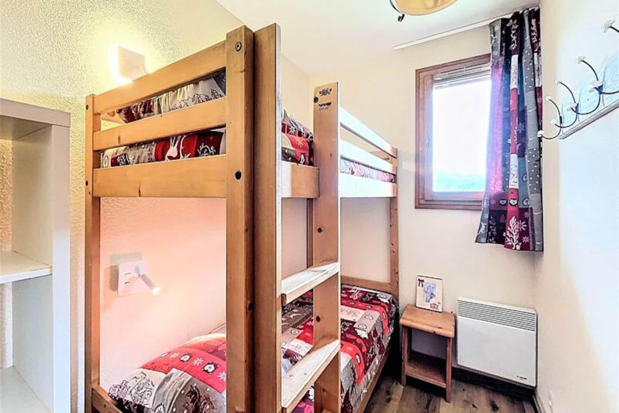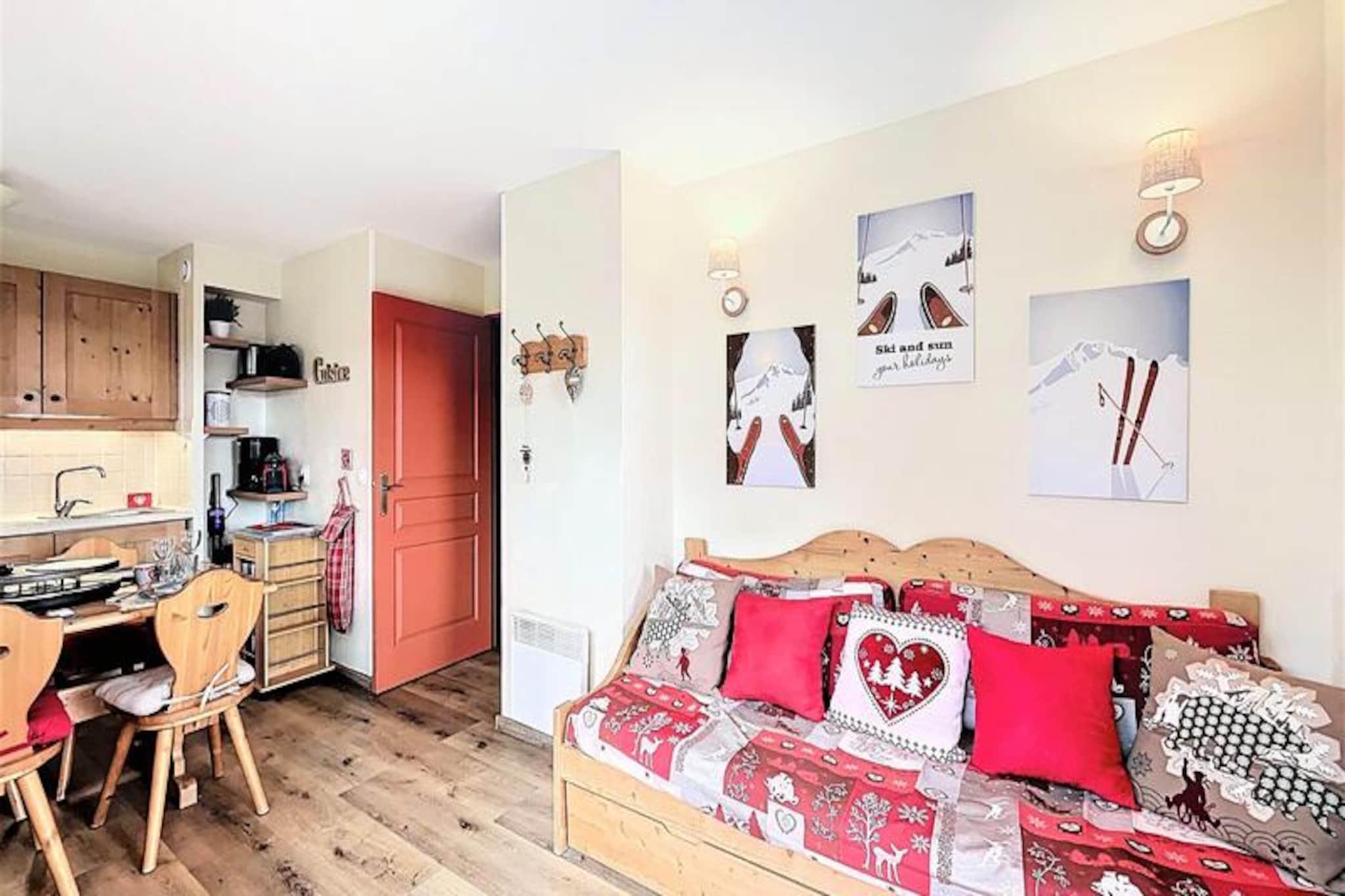 Højt oppe i de fredfyldte franske alper, hvor frisk bjergluft og betagende landskaber sætter tonen, tilbyder denne charmerende lejlighed i Les Alpages du Corbier et perfekt tilflugtssted for både skientusiaster og naturelskere. Forestil dig at vågne op til en fantastisk udsigt over bjergtoppene og boligens opvarmede udendørs pool fra din private balkon, med dobbelt øst- og sydvestvendt udsigt, der bader rummet i naturligt lys. Uanset om du er her for spændingen ved pisterne eller roen i alpelivet, lover denne ejendom et uforglemmeligt ophold. \n\nLejligheden er designet til at rumme op til seks gæster og kan prale af en hyggelig stue med en udtrækssovesofa, et storskærms-tv og et veludstyret tekøkken med alt fra keramisk kogeplade til en Nespresso®-maskine. De to soveværelser tilbyder komfortable sovepladser, herunder en dobbeltseng og køjesenge, mens badeværelset tilbyder både et badekar og et separat brusebad for ekstra bekvemmelighed. En privat overdækket parkeringsplads og et stort skiskab sikrer praktisk og bekvemmelighed under dit ophold. \n\nMed ski-in/ski-out-adgang via Saut-pisten og La Voie Lactée-stoleliften kun 50 meter væk, begynder dine alpine eventyr lige uden for døren. Ejendommen har også en opvarmet udendørs pool, en sauna og et fitnessområde, der tilføjer afslapning og velvære til din rejseplan. I nærheden finder du butikker og restauranter inden for en kort gåtur på 300 meter, mens den gratis shuttle-service sikrer problemfri udforskning af feriestedet. \n\nUanset om du nyder en raclette tilberedt i dit tekøkken eller slapper af i saunaen efter en dag på pisterne, kombinerer denne lejlighed komfort, bekvemmelighed og bjergenes magi for en virkelig mindeværdig ferieoplevelse.