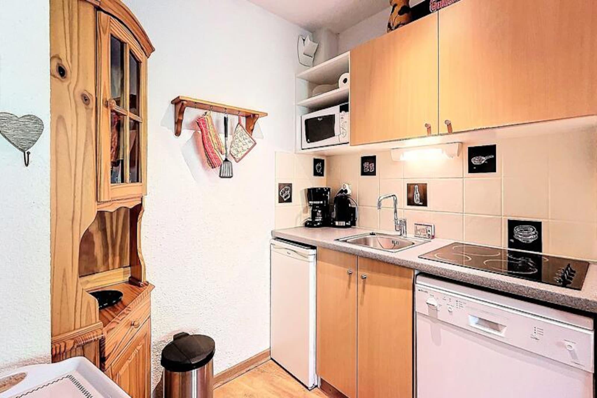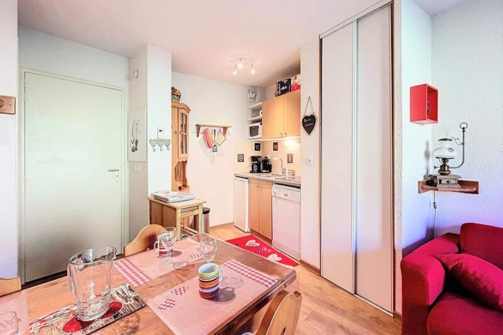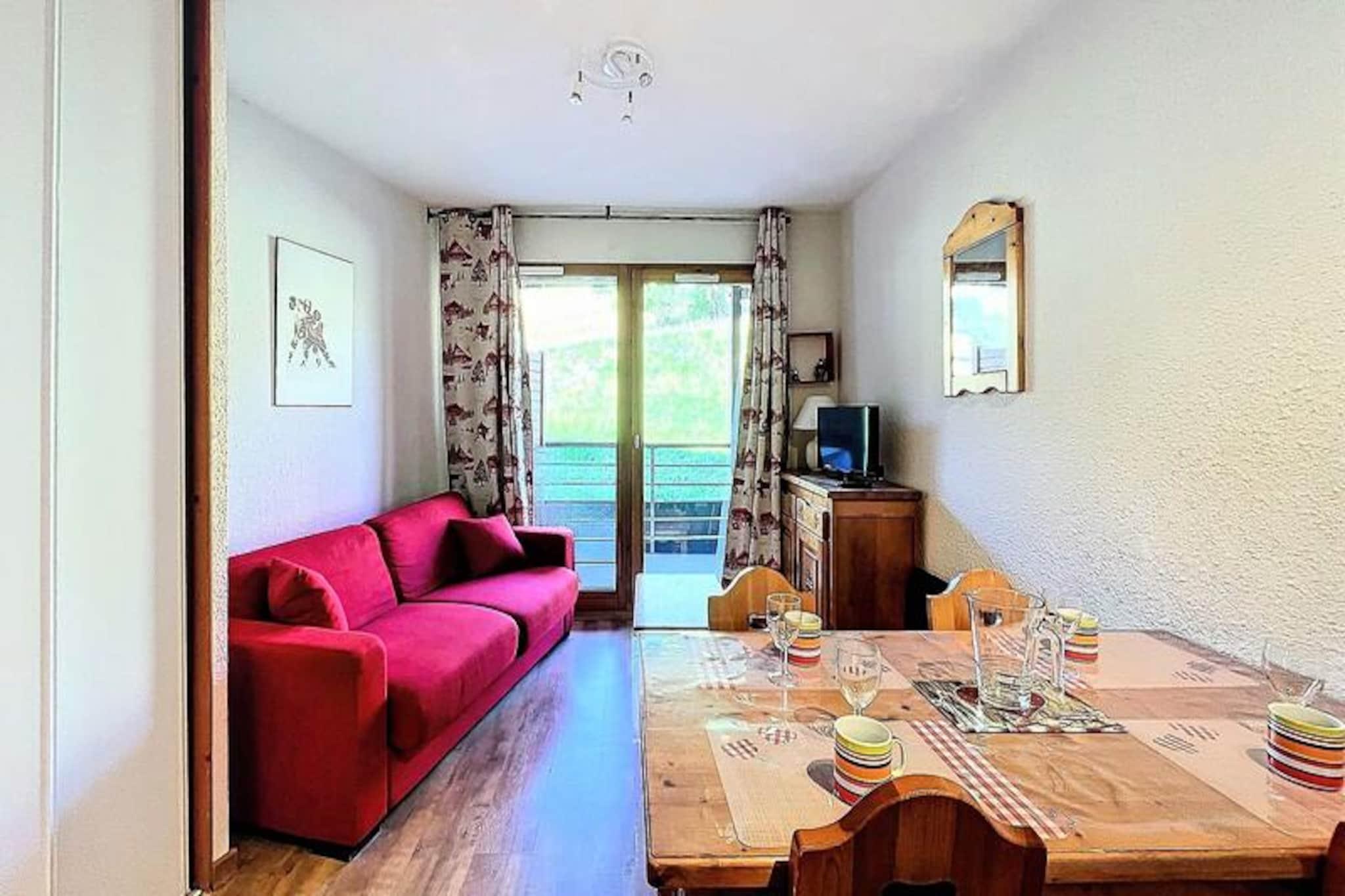 Højt over det travle feriested Les Pistes inviterer denne charmerende lejlighed dig til at opleve roen ved et alpint liv med direkte adgang til pisterne kun 50 meter væk. Forestil dig at vågne op til panoramaudsigt over snedækkede tinder fra din private sydvendte balkon, mens du nipper til din morgenkaffe, mens solen bader bjergene i gyldent lys. Uanset om du er her for at grave dig gennem frisk puddersne eller blot nyde den rolige atmosfære, tilbyder dette tilflugtssted den perfekte blanding af komfort og bekvemmelighed. \n\nIndenfor er lejligheden omhyggeligt designet til op til fire gæster. Den hyggelige stue har en komfortabel sovesofa, et fladskærms-tv og en spiseplads til fire personer, der åbner ud til balkonen, hvor du kan slappe af med et glas vin efter en dag med eventyr. Det veludstyrede tekøkken kan prale af moderne apparater, herunder keramisk kogeplade, mikrobølgeovn, opvaskemaskine og endda raclette- og fondue-sæt for en ægte smag af Alperne. Et separat soveværelse med to enkeltsenge, der kan sættes sammen, sikrer afslappende nætter, mens badeværelse og toilet er bekvemt adskilt. \n\nTræd udenfor, og du finder alt, hvad du behøver, inden for rækkevidde. Skiskolen ligger kun 250 meter væk, og de nærliggende butikker, restauranter og gratis shuttle-service gør det nemt at udforske feriestedet. Efter en dag på pisterne kan du slappe af i den opvarmede swimmingpool, som er tilgængelig for gæster over tre år, og tilføje et strejf af luksus til dit ophold. \n\nUanset om du søger spændende skieventyr eller fredelige bjergture, tilbyder denne lejlighed en uforglemmelig alpin oplevelse. Med ski-in/ski-out adgang og betagende udsigt er det et paradis for både vintersportsentusiaster og naturelskere. Lad charmen ved Les Pistes og de franske alpers skønhed skabe minder, du vil værdsætte for evigt.