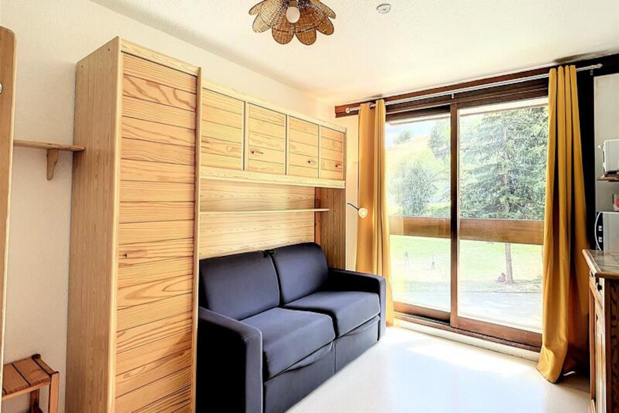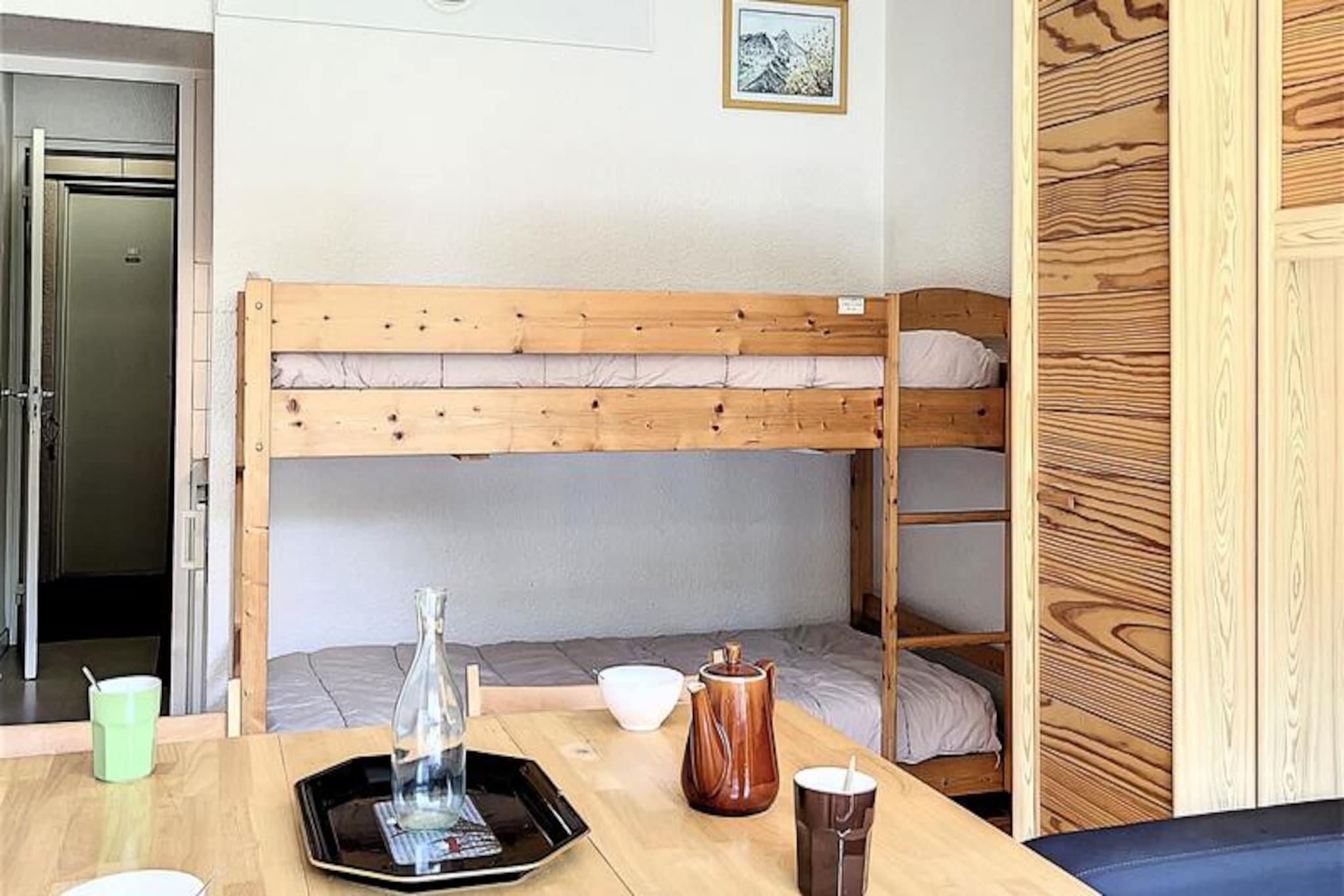Forestil dig at vågne op til synet af snedækkede pister lige uden for dit vindue, med den livlige summen fra en legeplads i nærheden og bekvemmeligheden ved et supermarked og en delikatesseforretning kun få skridt væk. Denne hyggelige studiolejlighed i Soyouz Residence tilbyder den perfekte base for dine alpine eventyr, beliggende ved foden af ??pisterne i hjertet af de franske alper. Uanset om du er her for spændingen ved skiløb eller den rolige bjergatmosfære, sikrer denne bolig et mindeværdigt ophold for alle. Det 22 m² store studiolejlighed, der er omhyggeligt designet til at rumme op til fire gæster, har en varm og indbydende planløsning. Opholdsstuen indeholder en komfortabel sovesofa, to køjesenge og et fladskærms-tv, hvilket skaber et hyggeligt tilflugtssted efter en dag på pisterne. Tekøkkenet er udstyret med keramiske kogeplader, mikrobølgeovn/grill og elektrisk kaffemaskine, hvilket gør det nemt at tilberede måltider. Et velholdt badeværelse med vaskemaskine bidrager til bekvemmeligheden. Selvom der ikke er nogen balkon, giver de sydvendte vinduer en fantastisk udsigt over pisterne og legepladsen og fylder rummet med naturligt lys. Familier vil sætte pris på nærheden til ESF-skiskolen, kun 200 meter væk, og børnepasningen kun 50 meter fra boligen. Ski-in/ski-out-adgang og et skirum i stueetagen gør det nemt at komme ud på pisterne. Efter en aktiv dag kan du slappe af i den opvarmede swimmingpool, gratis for gæster over tre år. Gratis Wi-Fi sikrer, at du holder dig forbundet under hele dit ophold. Med sin uovertrufne beliggenhed, moderne faciliteter og familievenlige atmosfære er denne studiolejlighed det perfekte valg til en bjergferie. Uanset om du søger eventyr eller afslapning, tilbyder Soyouz Residence en problemfri blanding af komfort og bekvemmelighed i maleriske alpine omgivelser.