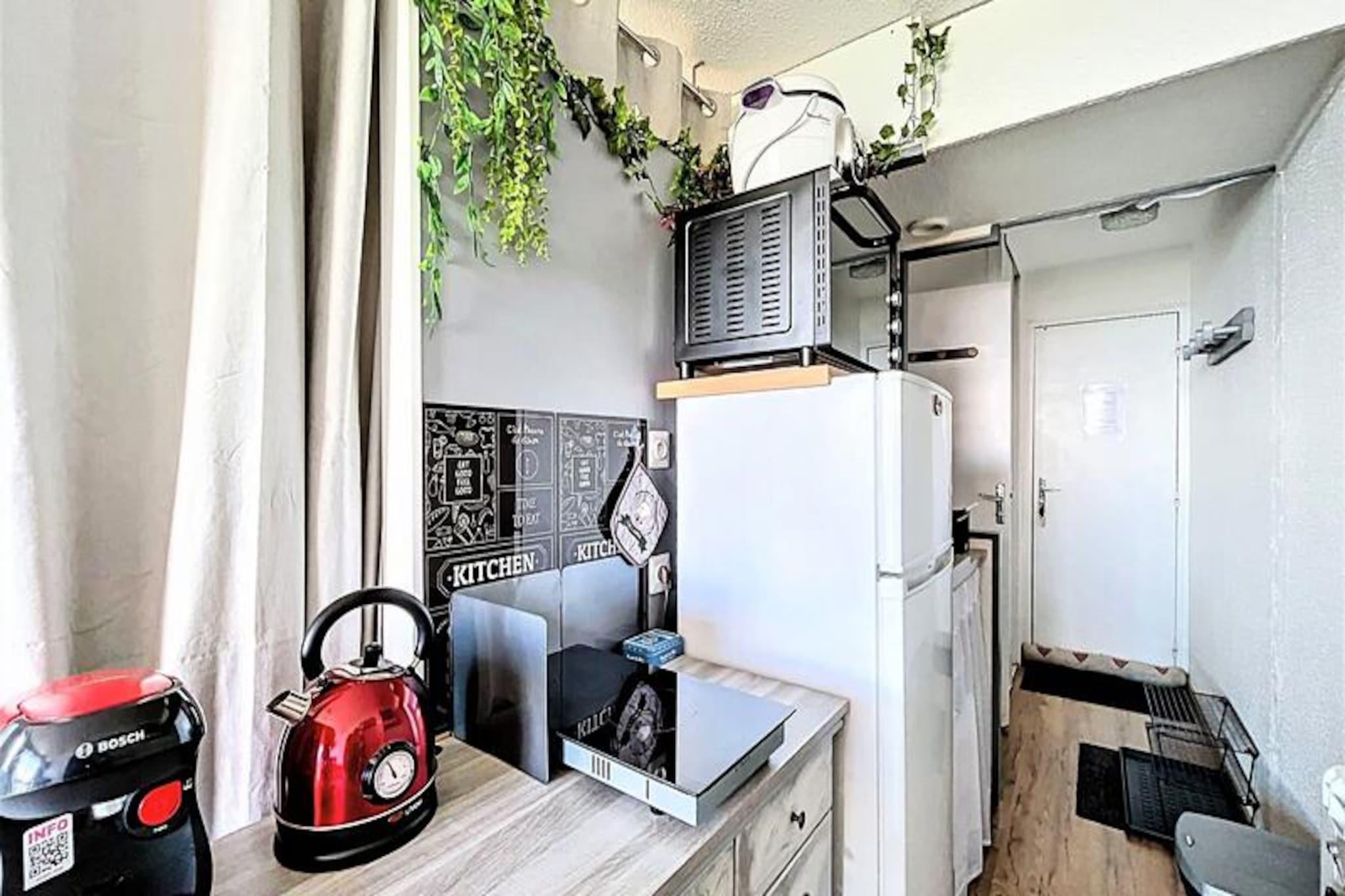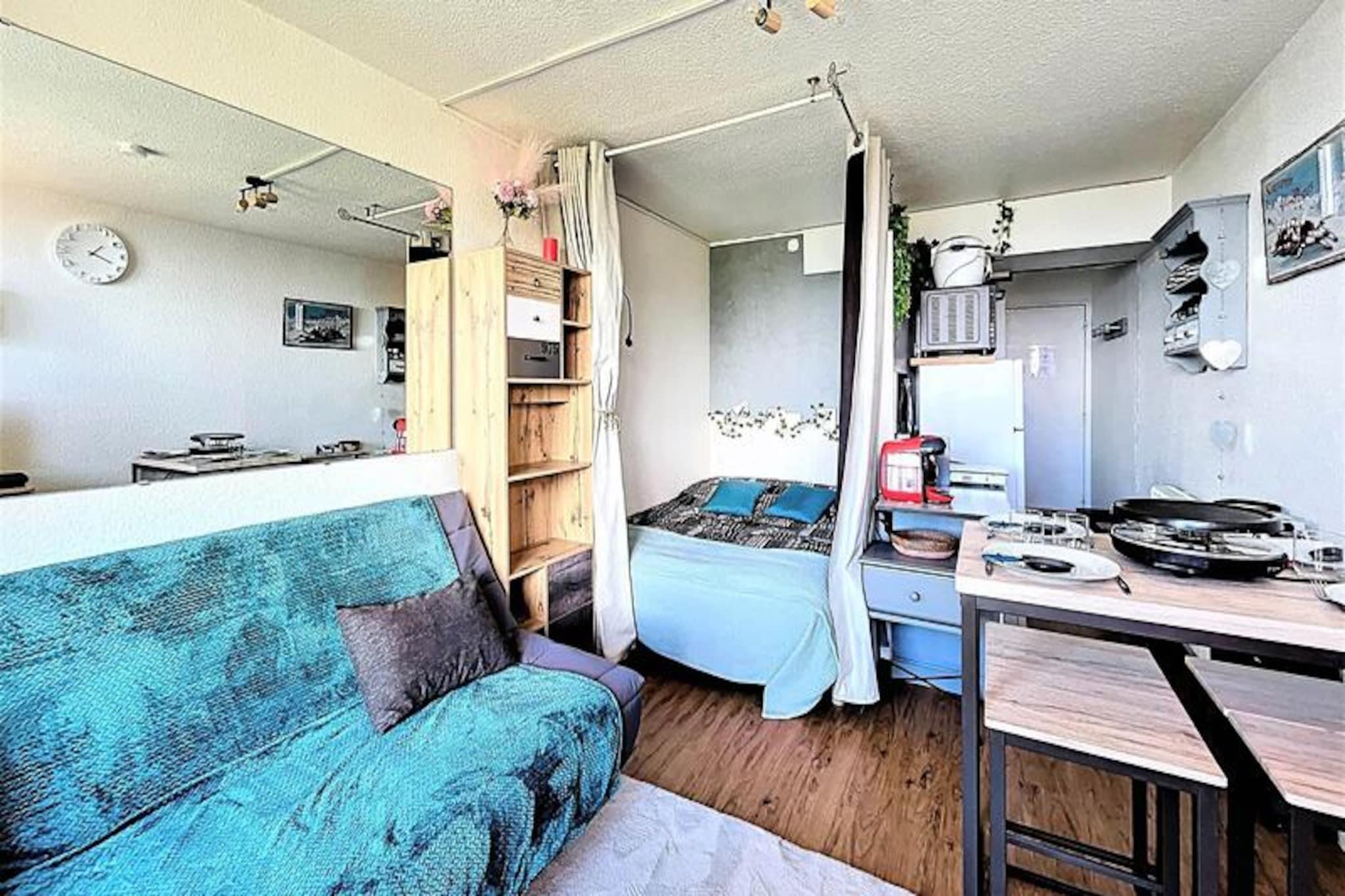 Højt over den maleriske Tarentaise-dal tilbyder dette charmerende studie et hyggeligt alpint tilflugtssted, perfekt til par eller små familier, der søger en ski-in/ski-out-oplevelse. Studiet, der ligger i Le Vanguard-residensen, ligger på 18. sal og tilbyder en betagende udsigt over bjergene fra den nordvendte balkon. Uanset om du er her for at slentre gennem pudrede pister eller blot slappe af i den fredfyldte atmosfære i de franske alper, lover denne ejendom et uforglemmeligt ophold. \n\nStudioet er nyrenoveret og smagfuldt indrettet og strækker sig over 22 m² og har komfortabel plads til op til fire gæster. Det gennemtænkte designede rum inkluderer en alkove med forhæng, en dobbeltseng, en sovesofa i den primære opholdsstue og et højt bord til måltider. Tekøkkenet er fuldt udstyret med moderne apparater såsom keramisk kogeplade, mikrobølgeovn, miniovn og endda en raclettegrill for en ægte Savoyard-oplevelse. Et brusebad med vaskemaskine og hårtørrer øger bekvemmeligheden, mens gratis Wi-Fi sikrer, at du forbliver forbundet under hele dit ophold. Gæsterne har også gratis adgang til den opvarmede swimmingpool, hvilket gør det til et dejligt valg for familier med børn over tre år. \n\nResidensen er ideelt beliggende ved foden af ??pisterne med et skirum i stueetagen for nem adgang. I nærheden finder du et minimarked, en cateringvirksomhed og ESF børneskiskole kun 200 meter væk, hvilket gør denne beliggenhed perfekt for både familier og skientusiaster. Derudover er der en legeplads og en børnepasning inden for gåafstand, hvilket sikrer bekvemmelighed for forældre, der rejser med små børn. \n\nUanset om du er her for vintersport eller sommervandreture, kombinerer denne studiolejlighed komfort, praktisk anvendelighed og en fantastisk udsigt for at skabe den perfekte alpine ferie. Med sin førsteklasses beliggenhed og gennemtænkte faciliteter er det et sted, hvor minder skabes, og eventyr begynder.