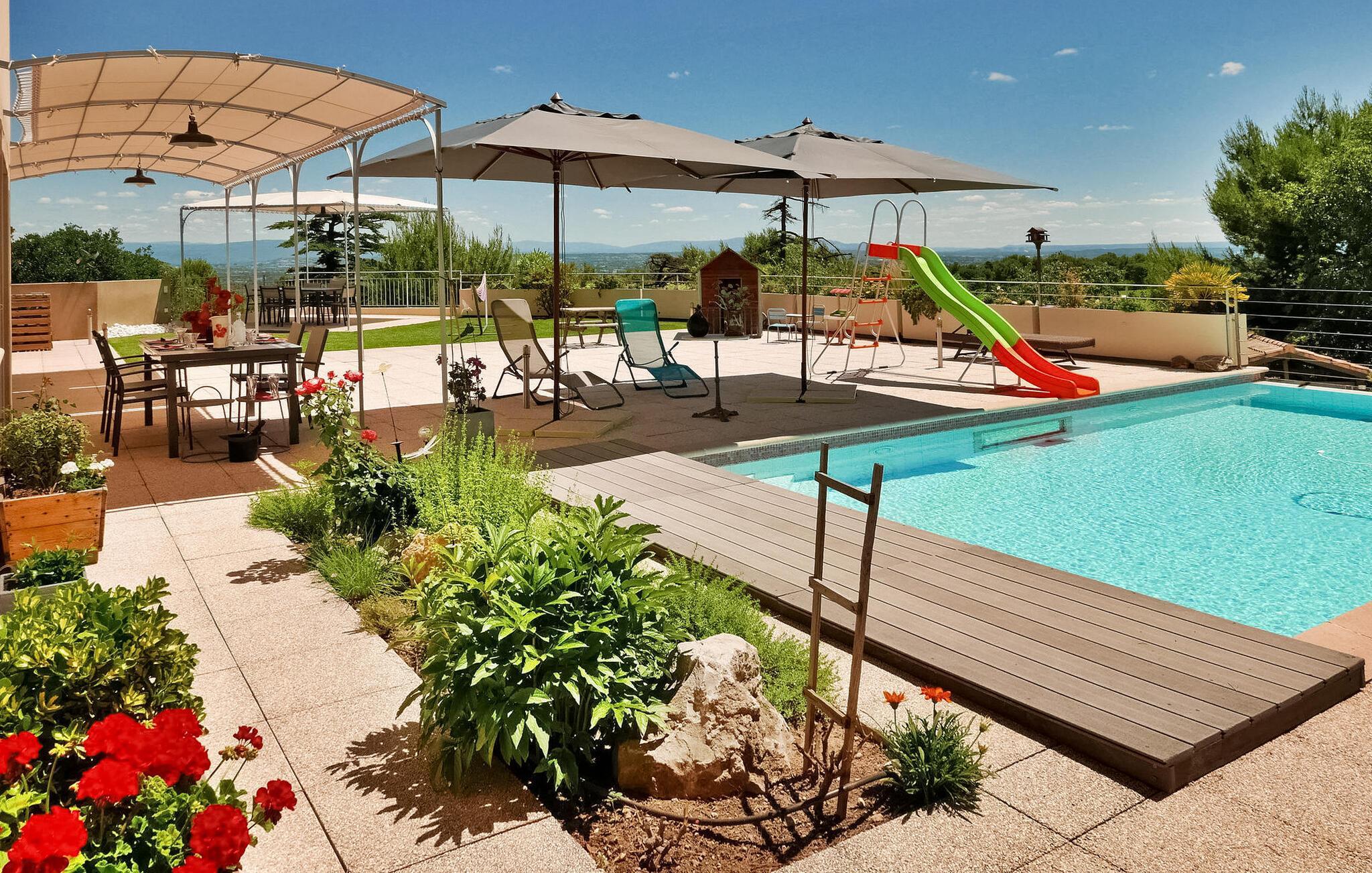 Denne ferievilla i Villeneuve lez Avignon tilbyder panoramaudsigt fra Ventoux til Alpilles-bjergkæden. Ejendommen består af et hovedhus med tre soveværelser (6 sovepladser) og en uafhængig lejlighed med aircondition (2 til 4 sovepladser). Hovedhuset har en rummelig stue, der åbner til terrassen og swimmingpoolen. Det omfatter et fuldt udstyret åbent køkken, spiseplads og opholdsområde. Ovenpå er der tre soveværelser med aircondition, et badeværelse og et separat toilet. Haveniveauet rummer et stort legeområde i garagen og vaskefaciliteter. Den selvstændige lejlighed ligger i haveniveau og kan rumme op til 4 gæster. Det har en opholdsstue med aircondition med sofa, spiseplads, åbent køkken og et soveværelse med aircondition og en dobbeltseng. Udenfor ligger villaen på en uindhegnet grund med forskellige niveauer af jord. Den ekspansive terrasse har udsigt over den fantastiske udsigt og omfatter en pergola, børnespil og en infinity-pool. Villaen er beliggende på højderne af Villeneuve lez Avignon, i et roligt boligområde. De nærmeste butikker ligger ca. 1 km væk. Det historiske centrum af Villeneuve er omkring 3 km og den berømte middelalderby Avignon er omkring 5 km.