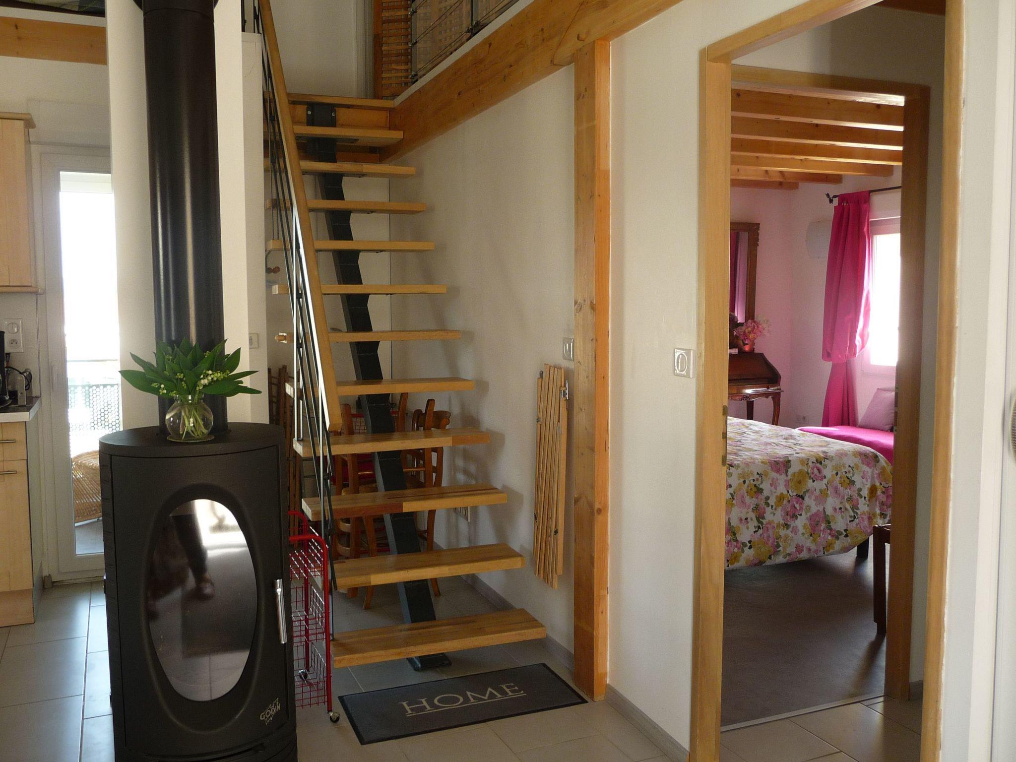 The flat comprises - on the first floor: a main room with a fully-equipped kitchen and a living room opening onto a loggia, which itself overlooks the valley, a bedroom (with a 160 x 200 cm bed), a shower room and a separate WC - on the second floor: a mezzanine bedroom (20 m2) with shower room and WC.