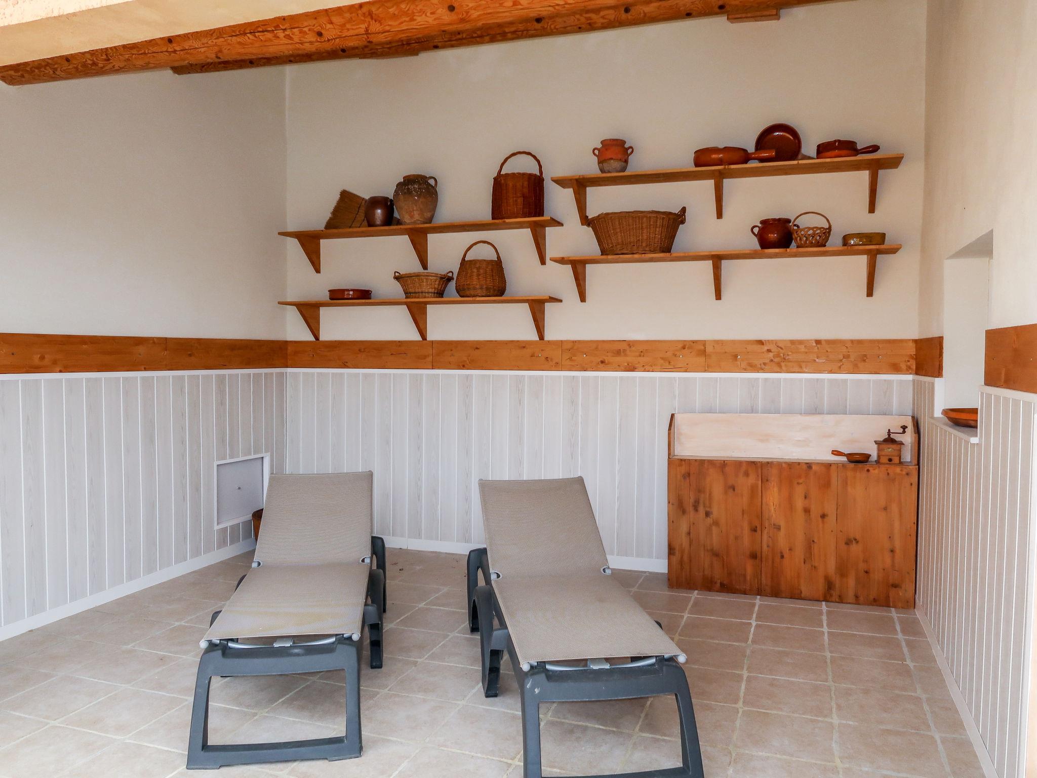 On a vinyard "Domaine de Majobert", surrounded by fields and vineyards. 5 km from the centre of Visan, 3 km from the centre of Valréas, 40 km from the centre of Montélimar. For shared use: property 40 ha. Private: swimming pool (10 x 4 m, depth 120 - 150 cm, seasonal availability: 01.Jan. - 31.Dec.). WC in the pool area, parking on the premises. Shop 3 km, bus stop "Richerenches Centre" 7.7 km. Please note: the owner lives on the same property.