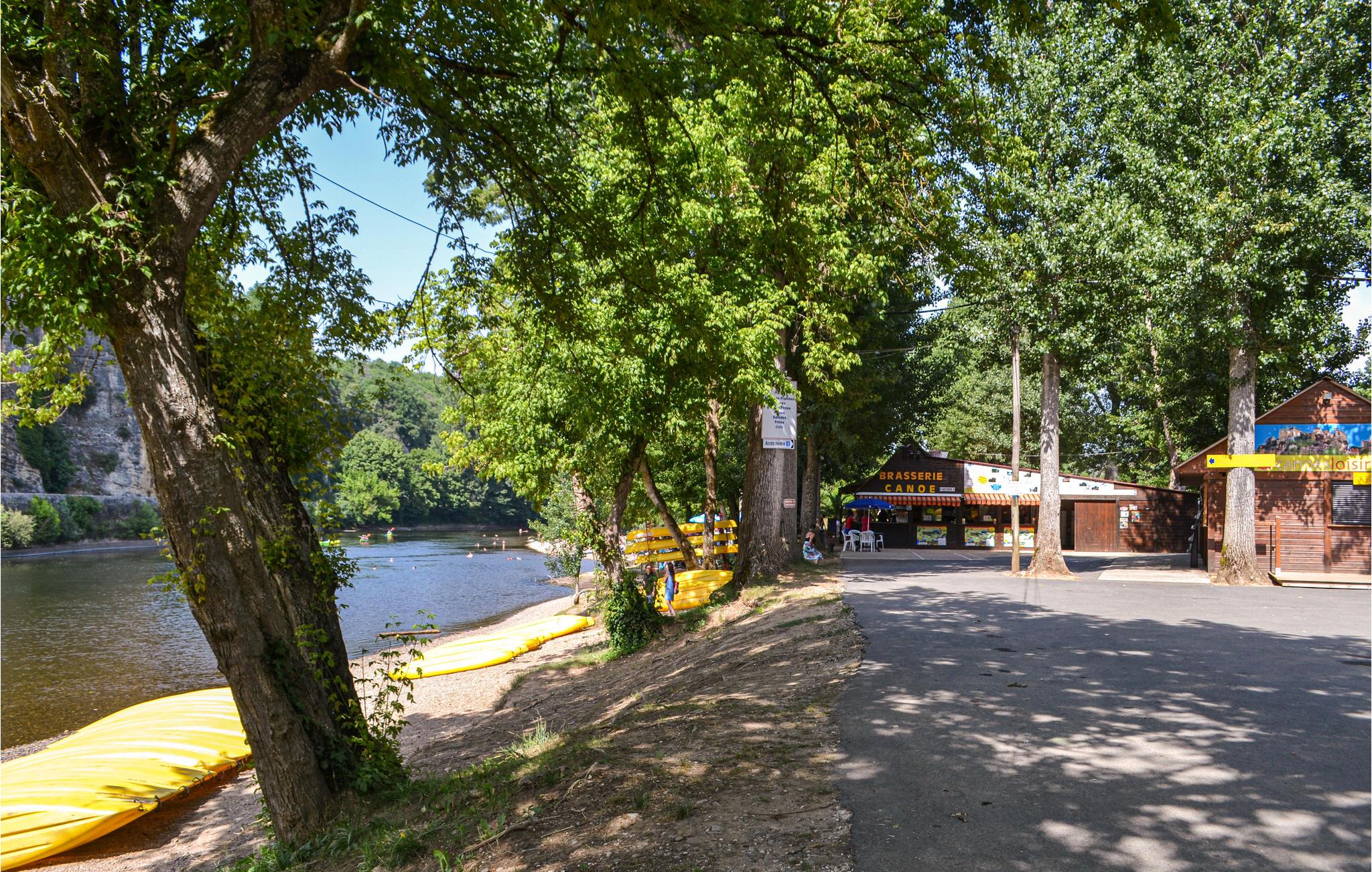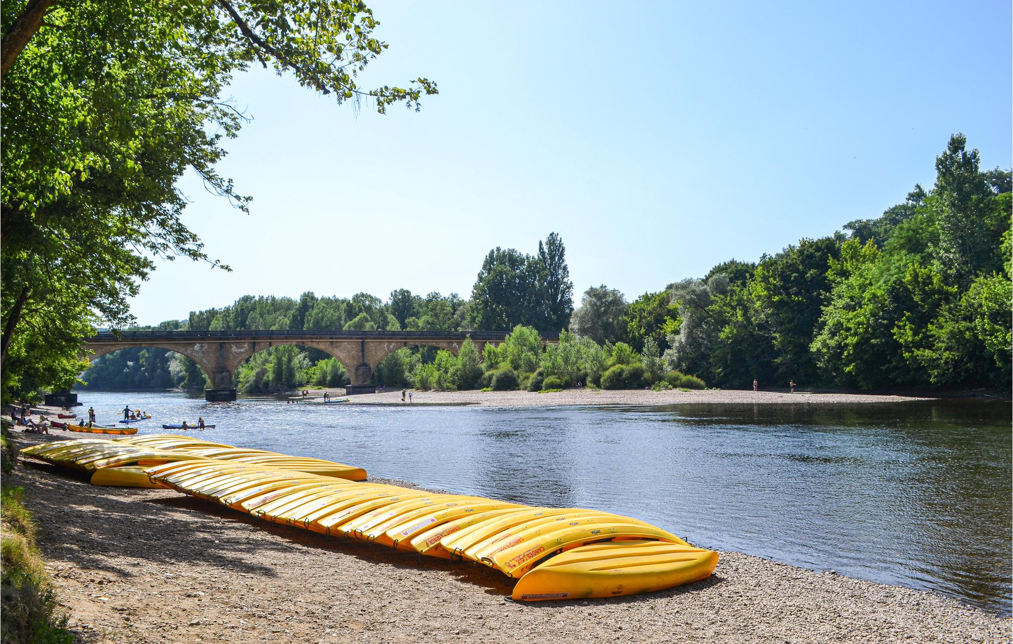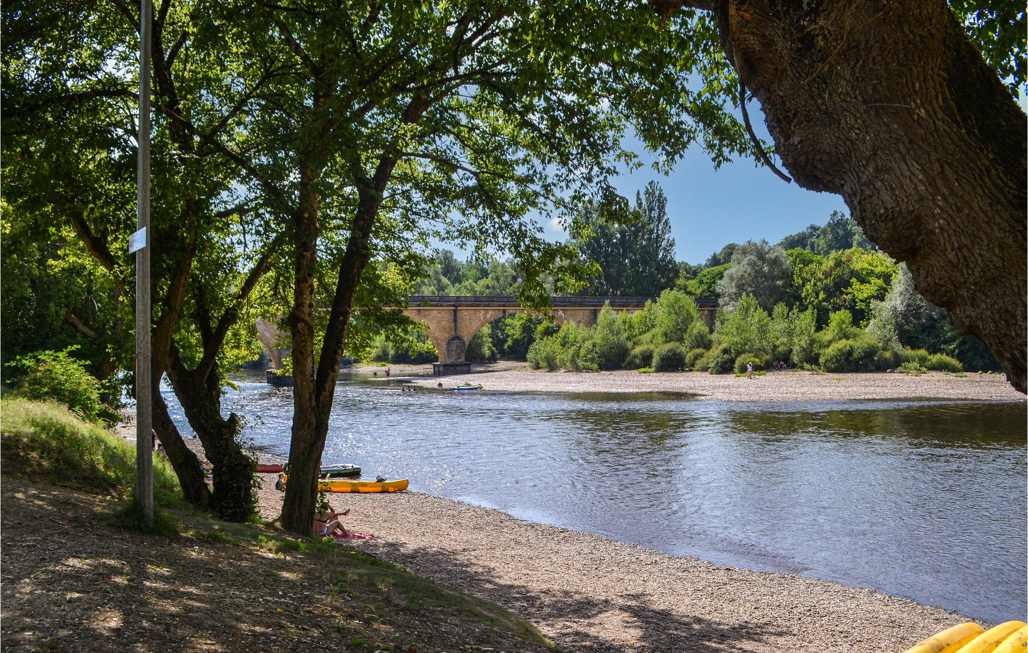 Den store strand ved Vitrac-broen er ideel til svømning, kanosejlads og fisketure.