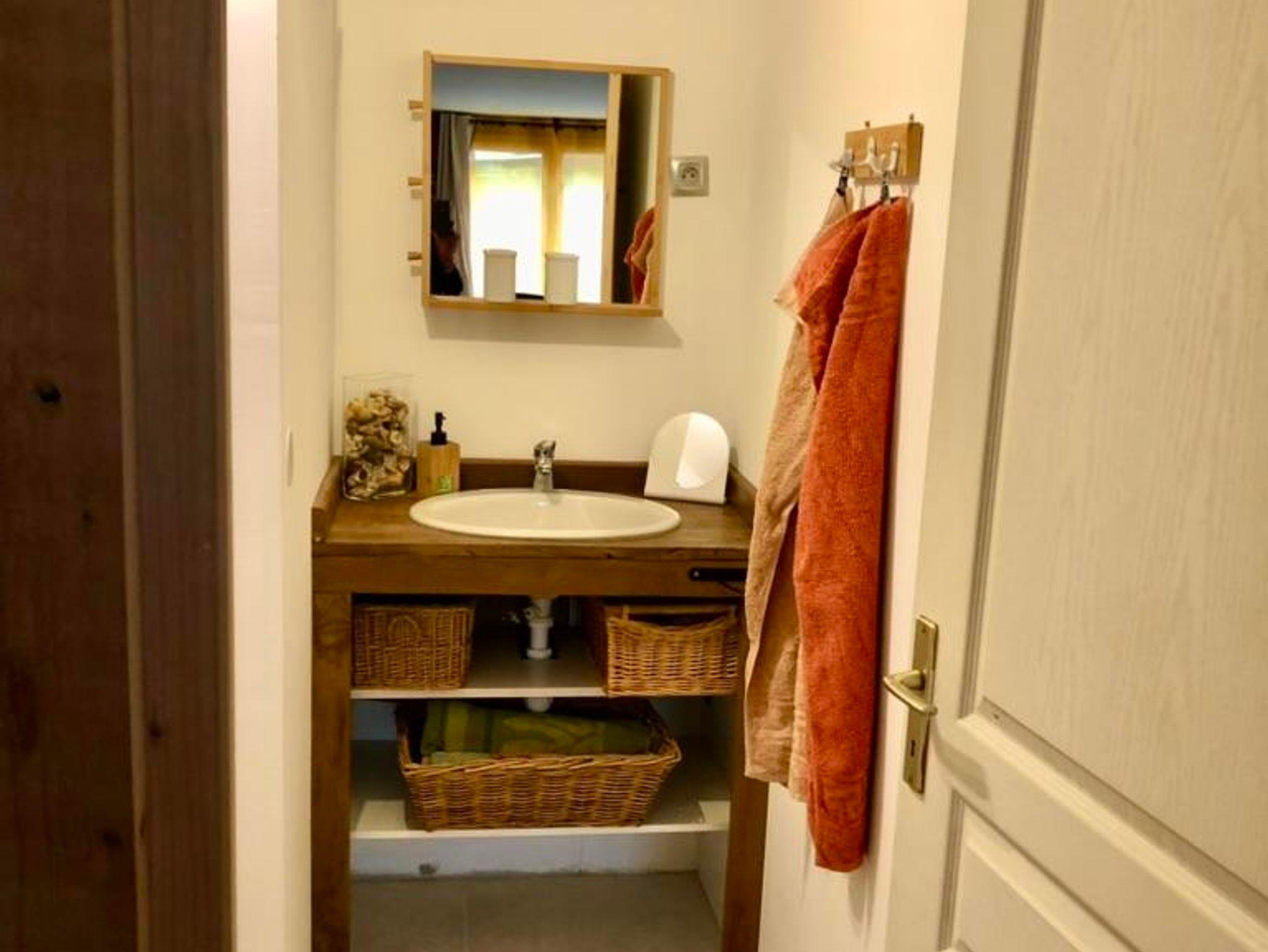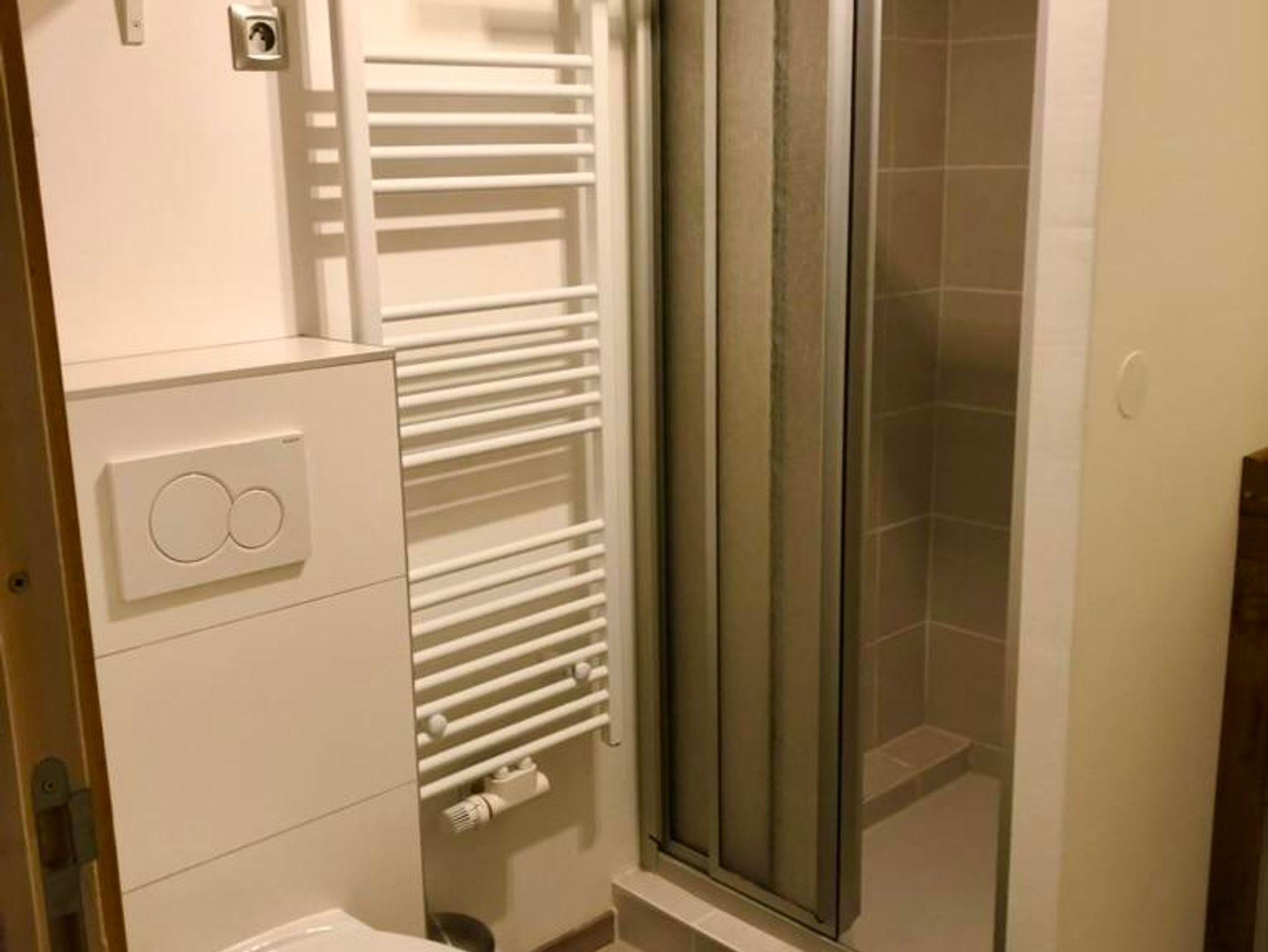 Ferner gibt es ein Duschbad, Handtücher und Föhn.