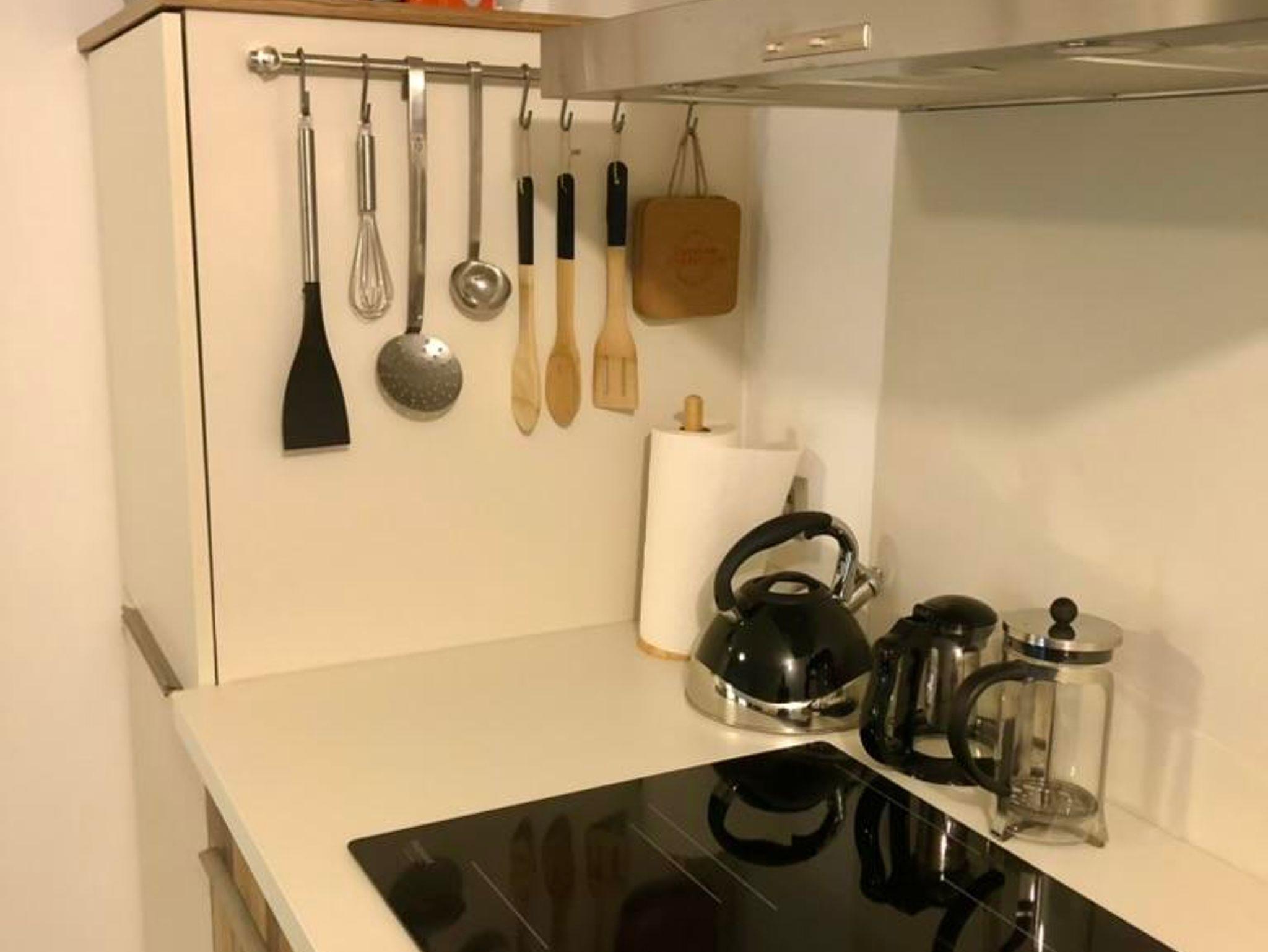 Es gibt eine Küche mit Induktionsherd, Kühlschrank und allem was man zum kochen braucht.