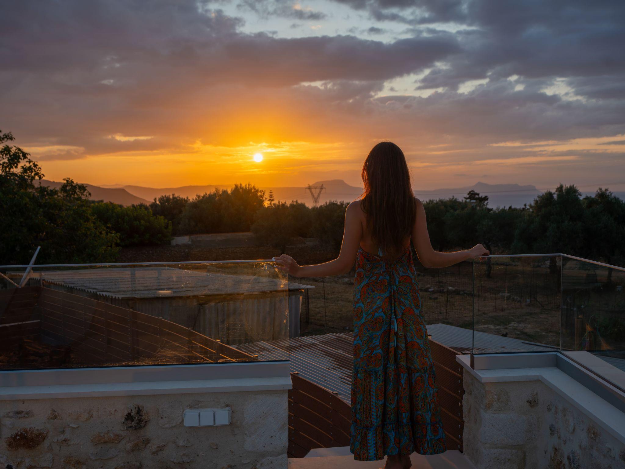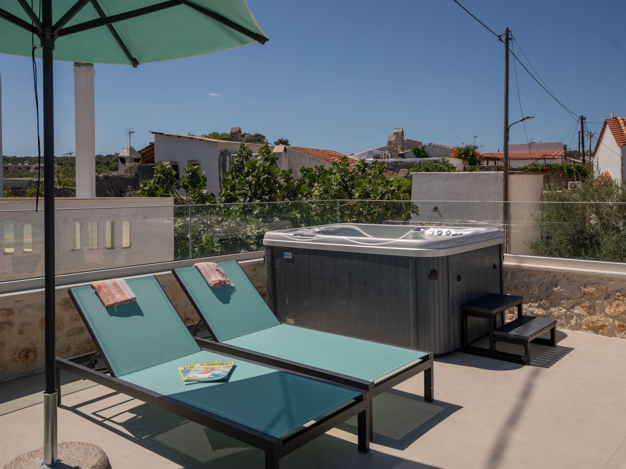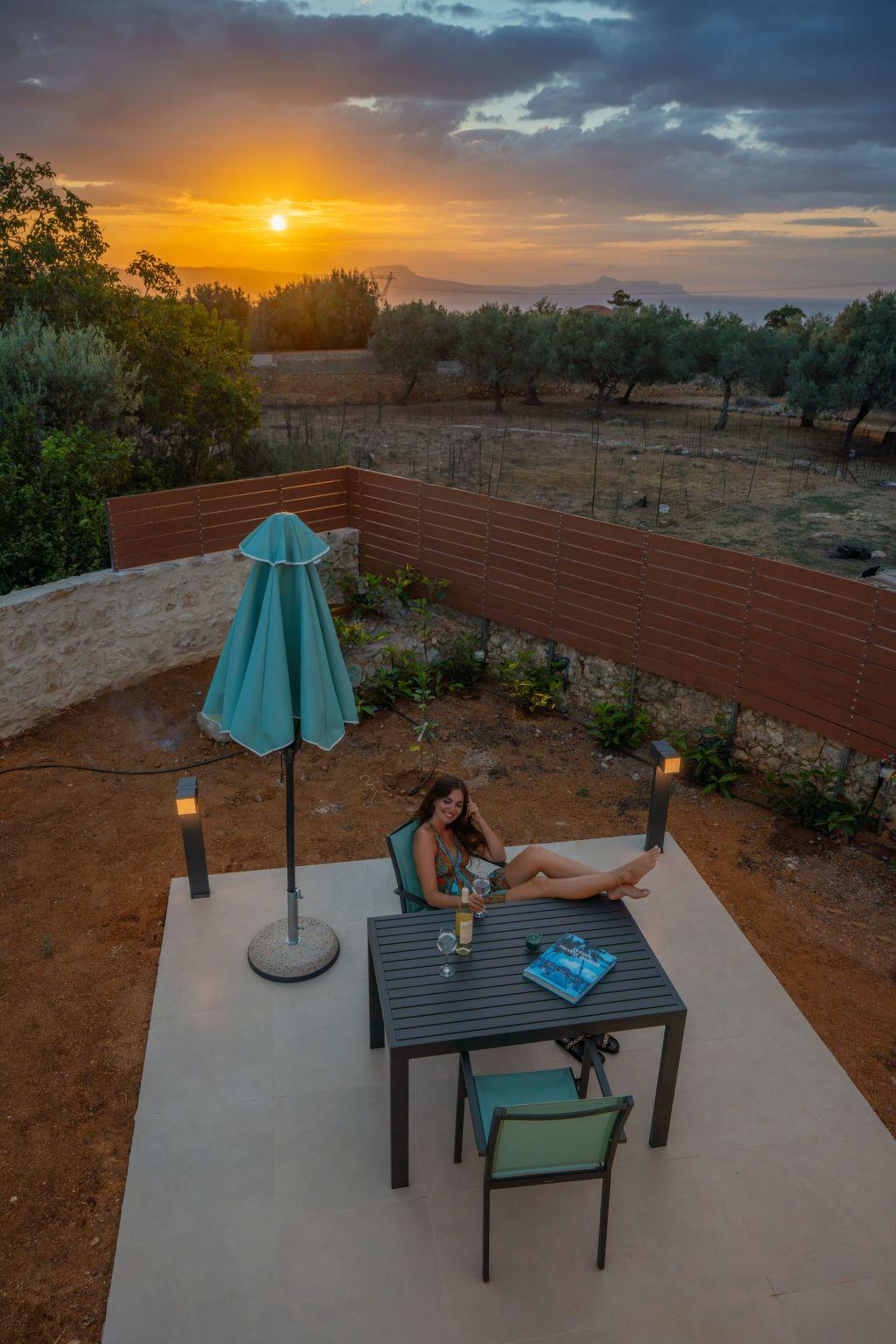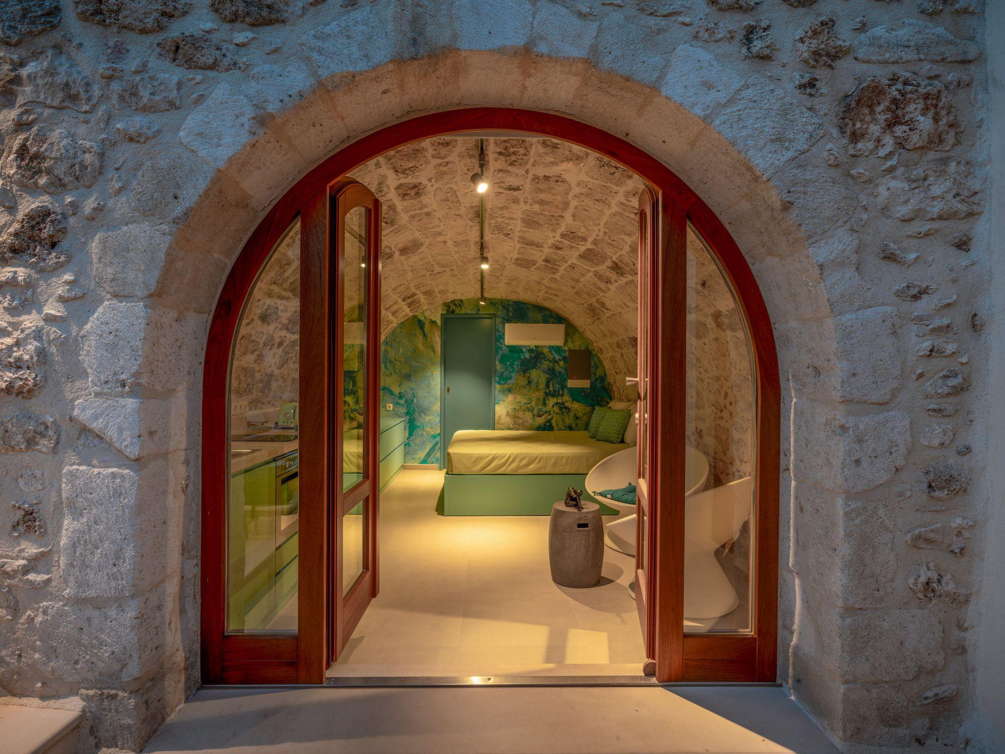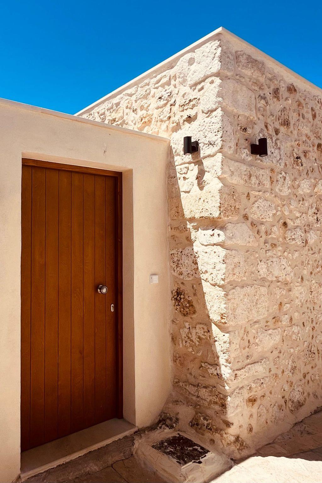 Our house is a small old stone house in the form of a vault with 1 metre thick stone walls. We have renovated this house with great attention to detail, preserving the stone construction and unique architecture and combining it with modern green and blue colours. All the furniture is handmade and customised for this rare architecture. LG Smart TV, SAT-TV, internet connection complete the technical comfort of this small house. It is a detached house for 2 people and is therefore a very rare property, as most holiday homes on Crete have 3 or more bedrooms. A property for couples who want to enjoy their togetherness. On the roof terrace there is a heated whirlpool from which you can enjoy a marvellous view of the sea and the White Mountains, the sunset from here is a real dream! A small garden with a terrace rounds off the outdoor area. Here we have planted a banana, lemon, orange and mandarin tree instead of palm trees. The house is located in a very quiet lane in the village of Prines. The village centre is only 100m away. Here you will find three tavernas, a small grocery shop, a pharmacy and the bus stop, from where you can easily reach the city of Rethymno in less than 10 minutes.