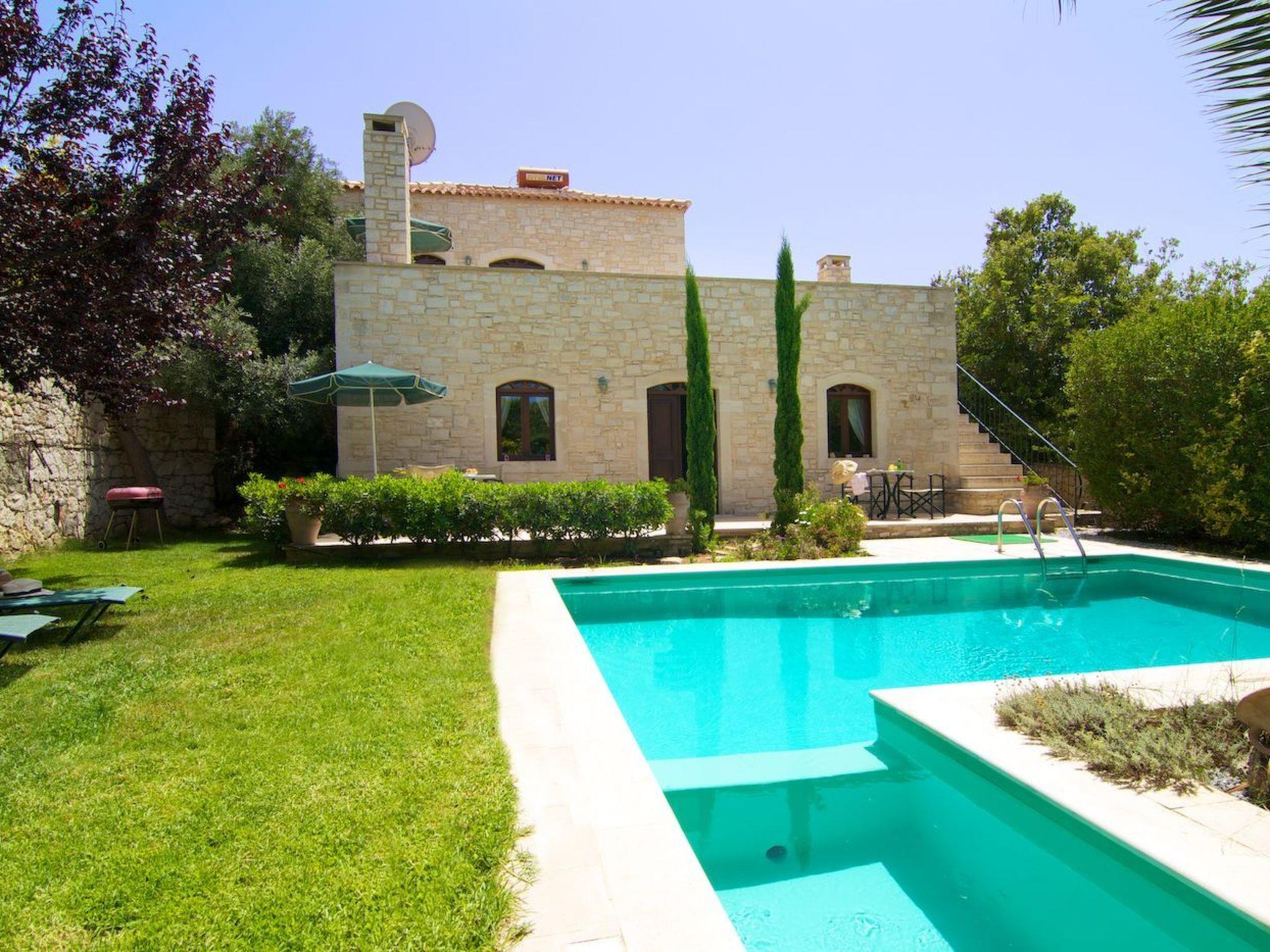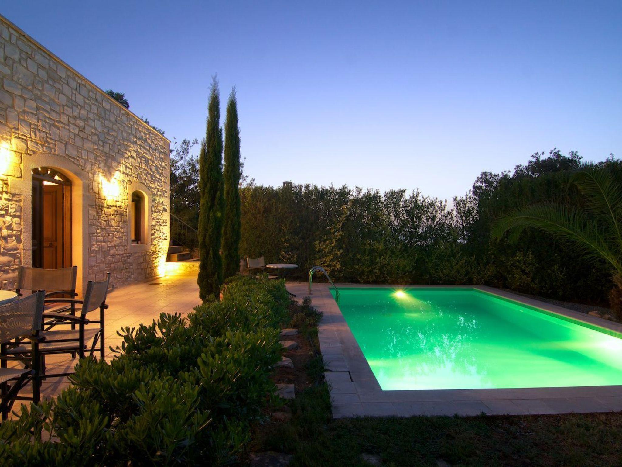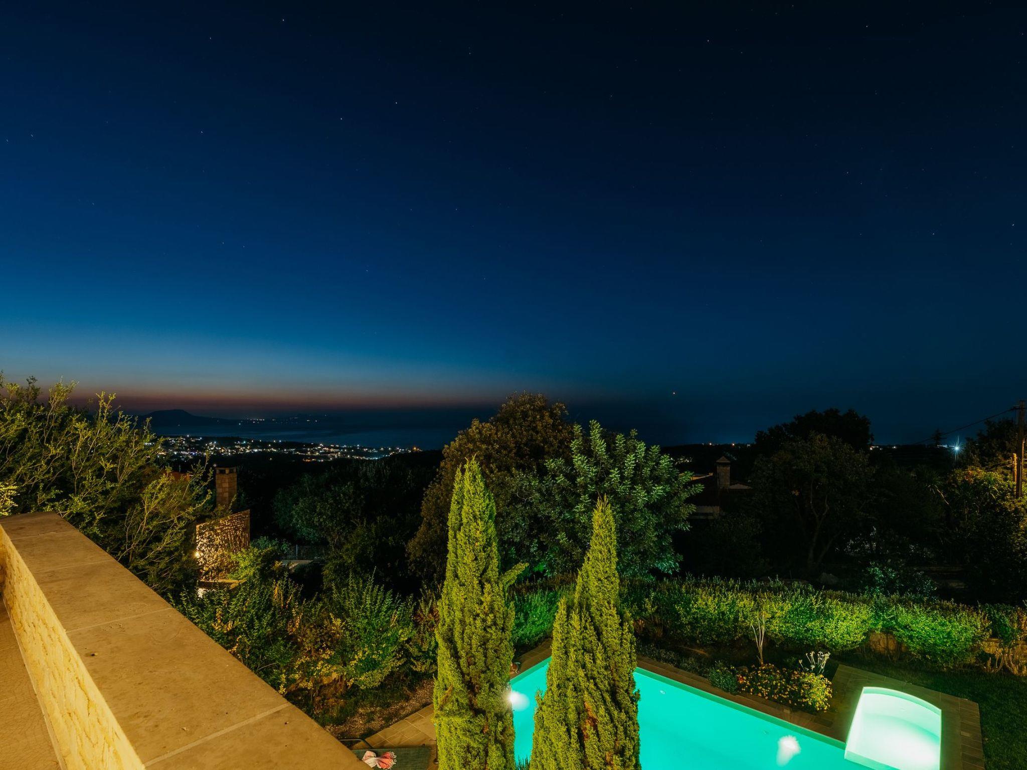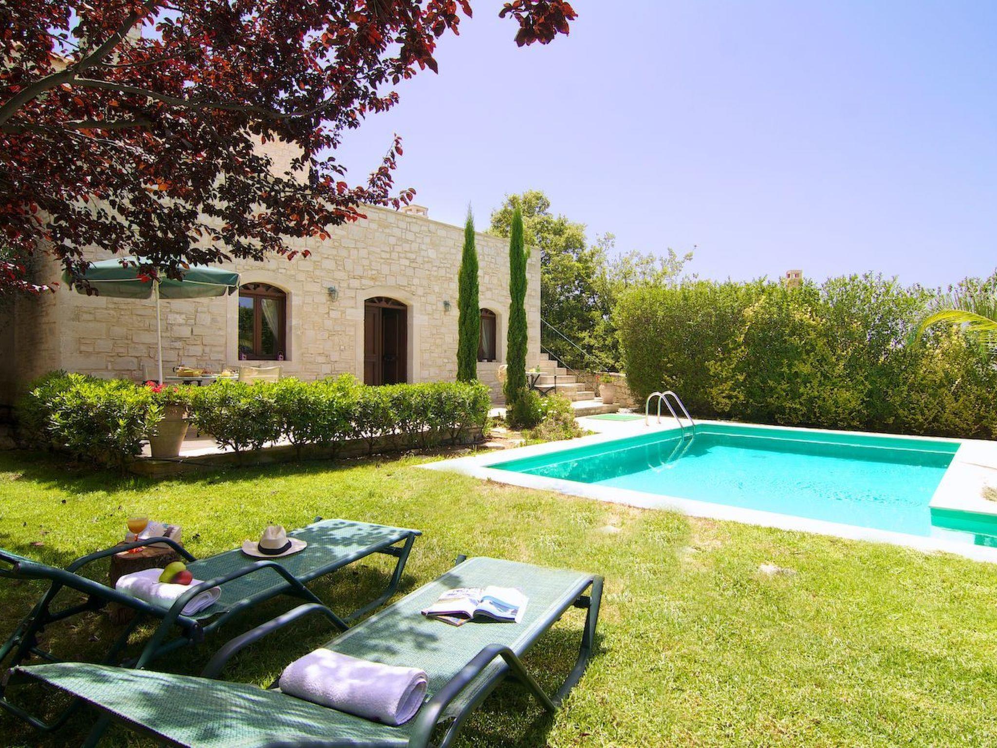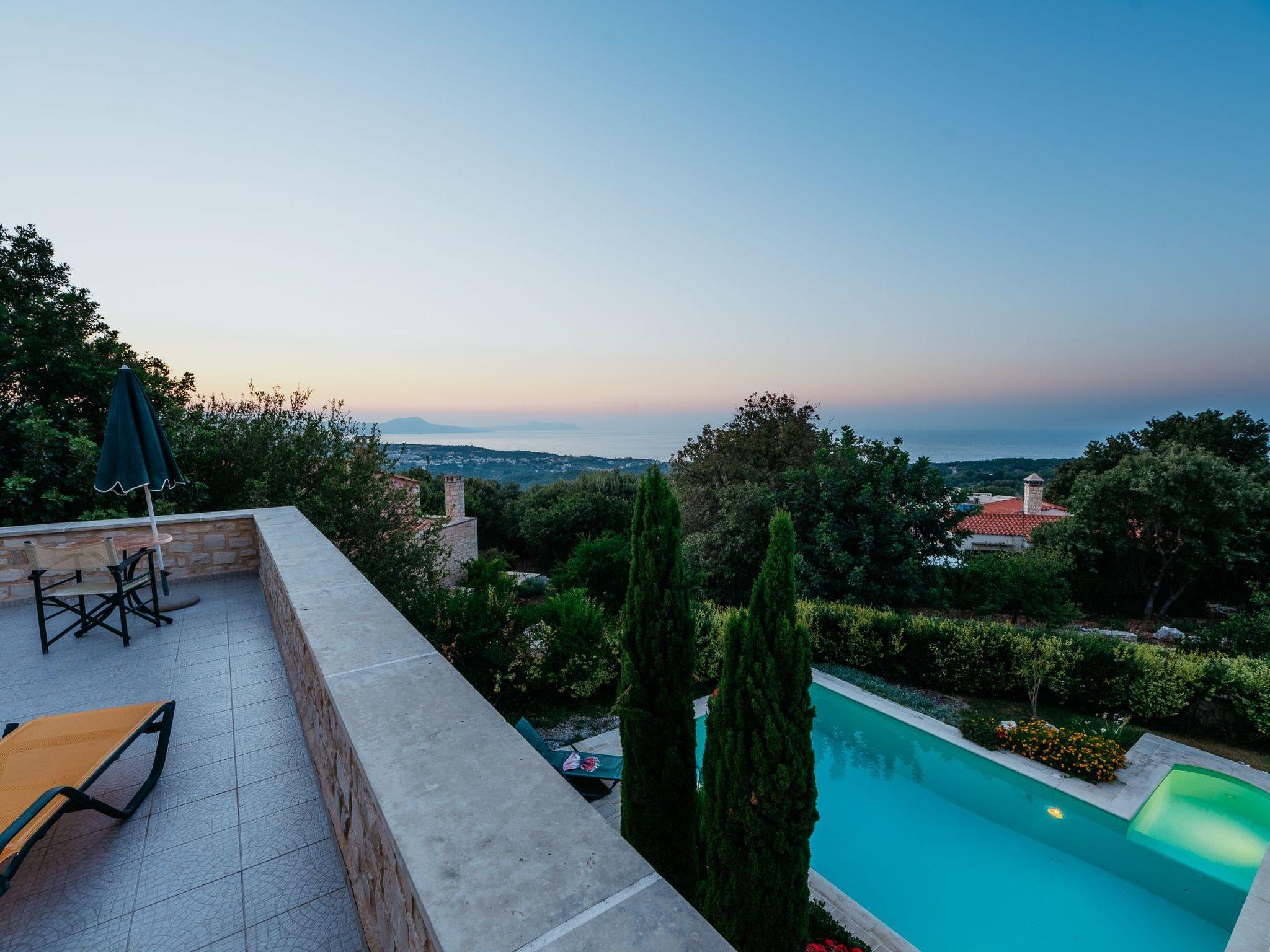 Outside the stone villa Olympia there is a terrace on the ground floor with direct access to the private swimming pool in the garden. On the upper floor there is a very large veranda, which can be reached both via an external staircase and an internal staircase. From this veranda there is a truly fantastic view of the sea and the White Mountains (2,500 metres above sea level and covered in snow from November to May). Here you can enjoy a wonderful sunset in the evening hours. The garden area has a lawn.