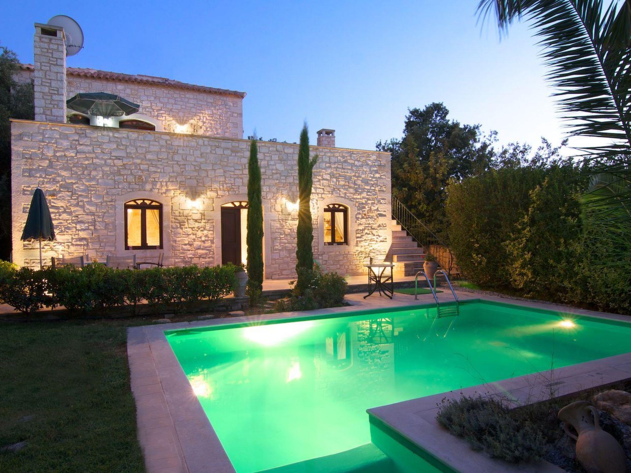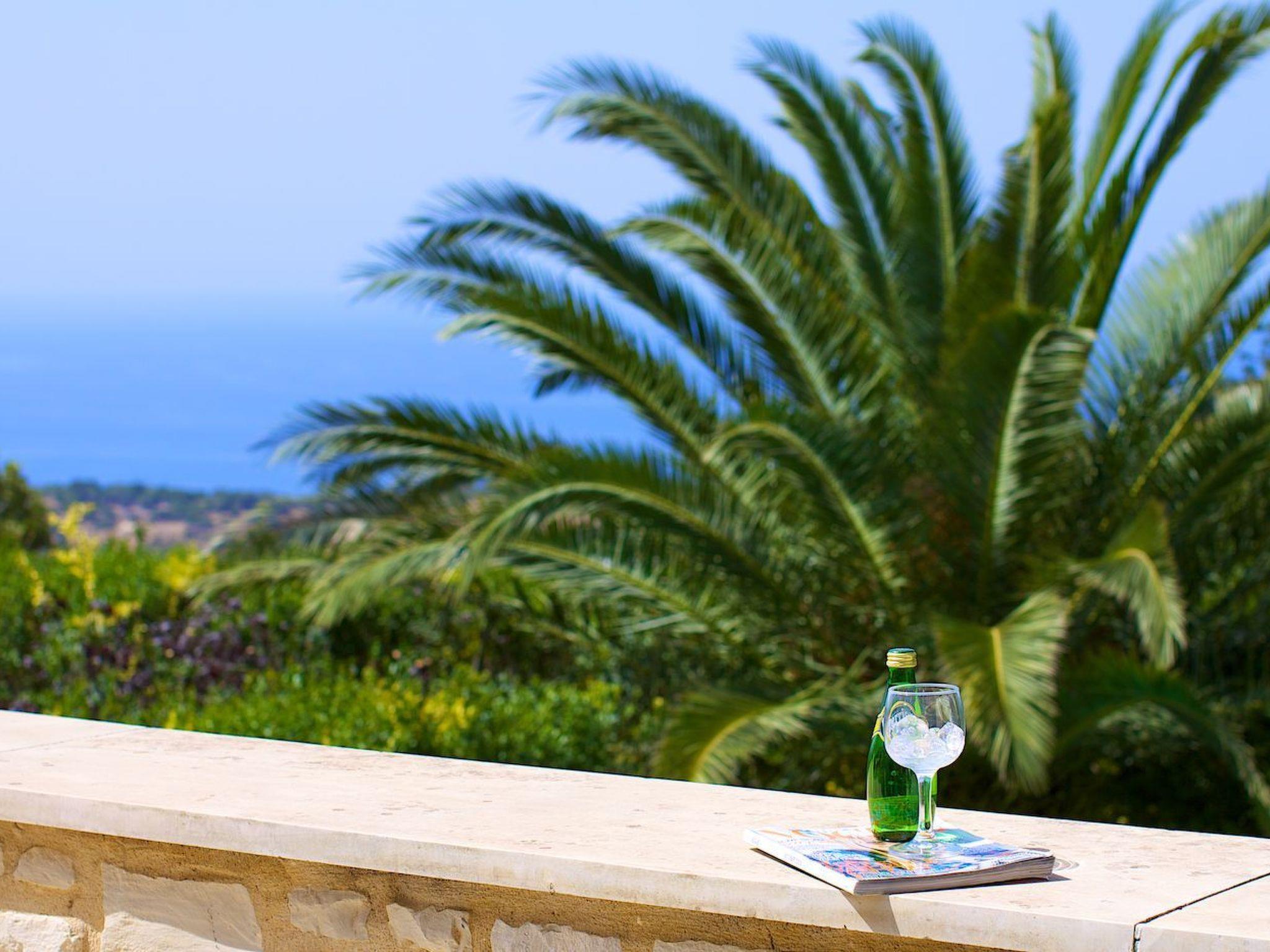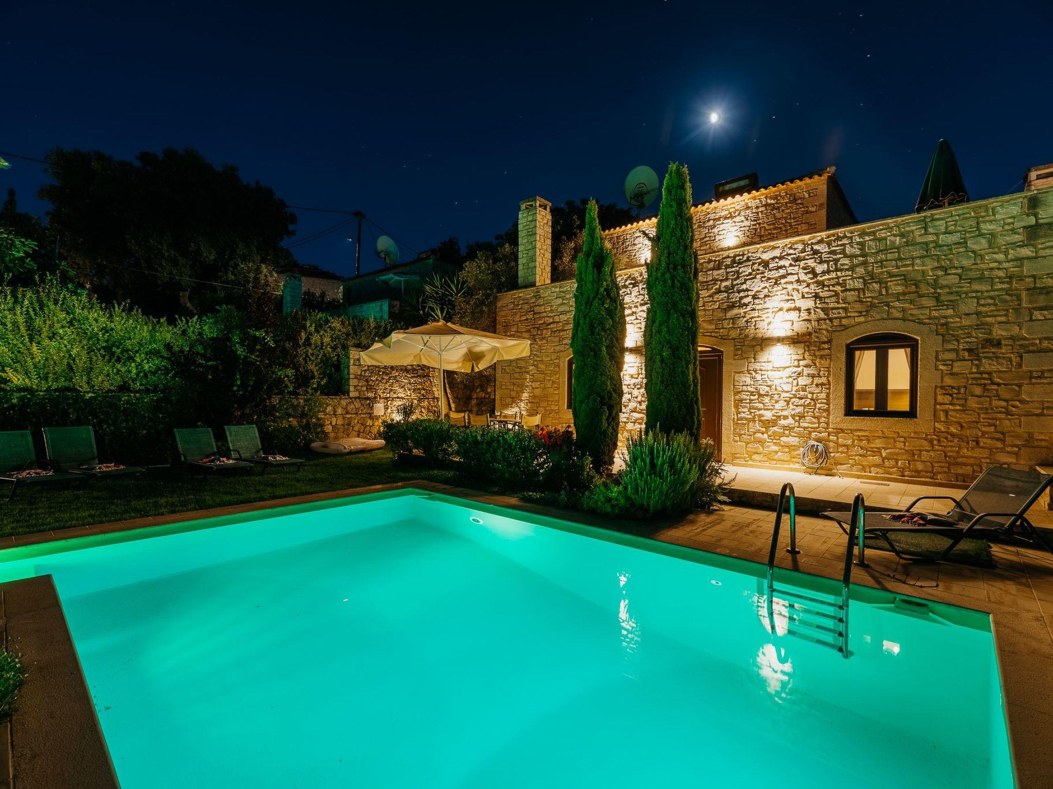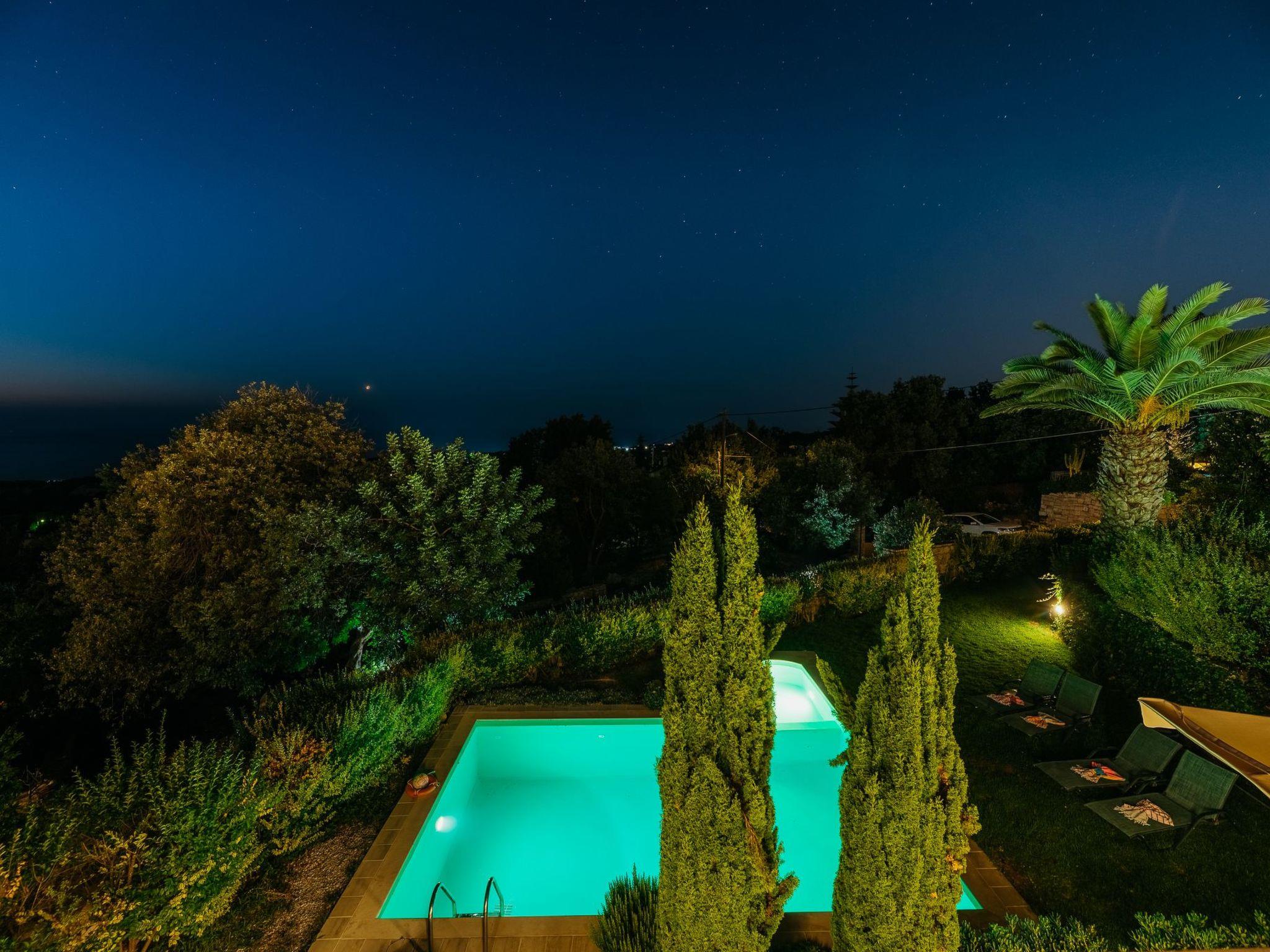 Outside the stone villa Olympia there is a terrace on the ground floor with direct access to the private swimming pool in the garden. On the upper floor there is a very large veranda, which can be reached both via an external staircase and an internal staircase. From this veranda there is a truly fantastic view of the sea and the White Mountains (2,500 metres above sea level and covered in snow from November to May). Here you can enjoy a wonderful sunset in the evening hours. The garden area has a lawn.