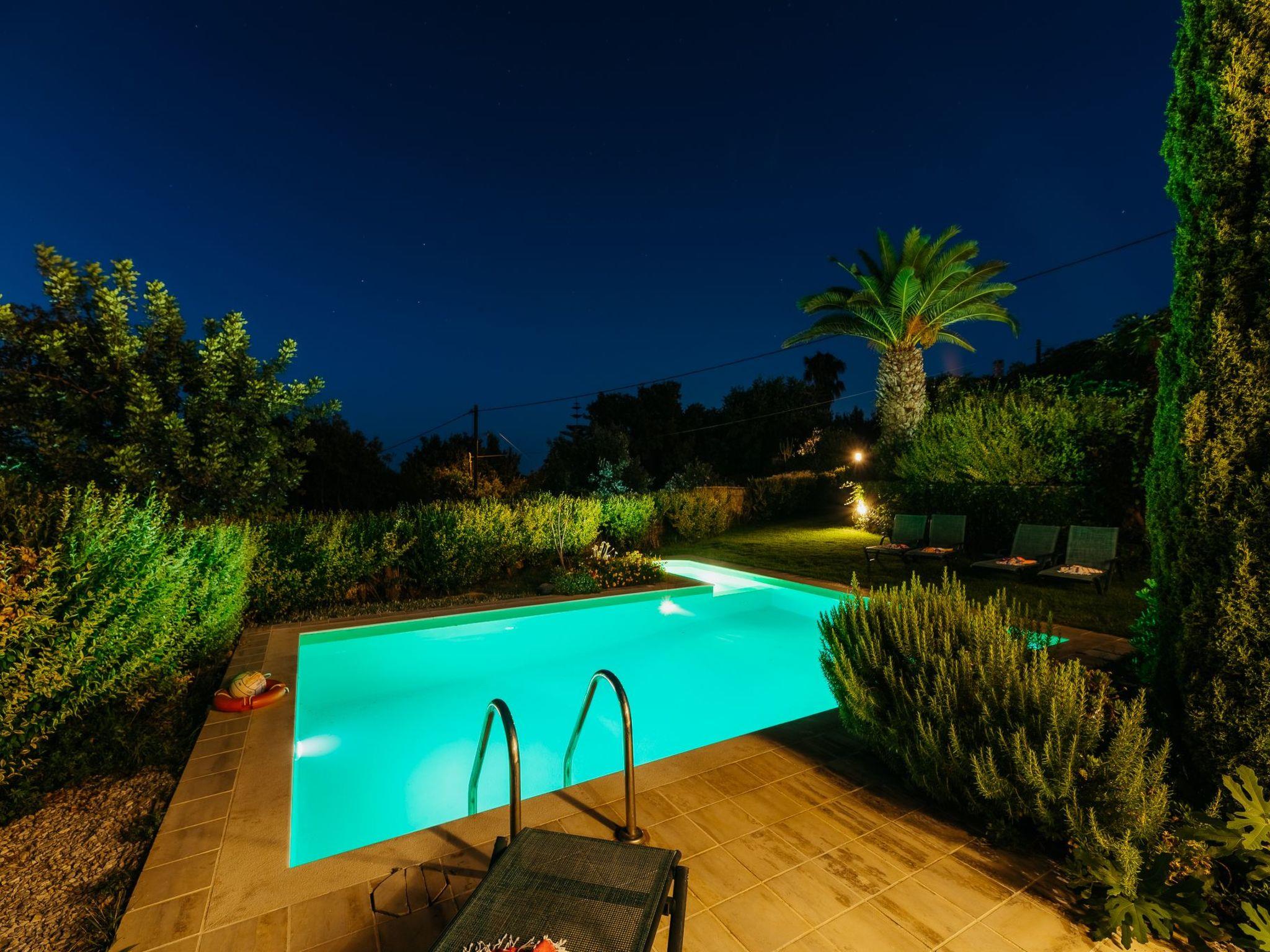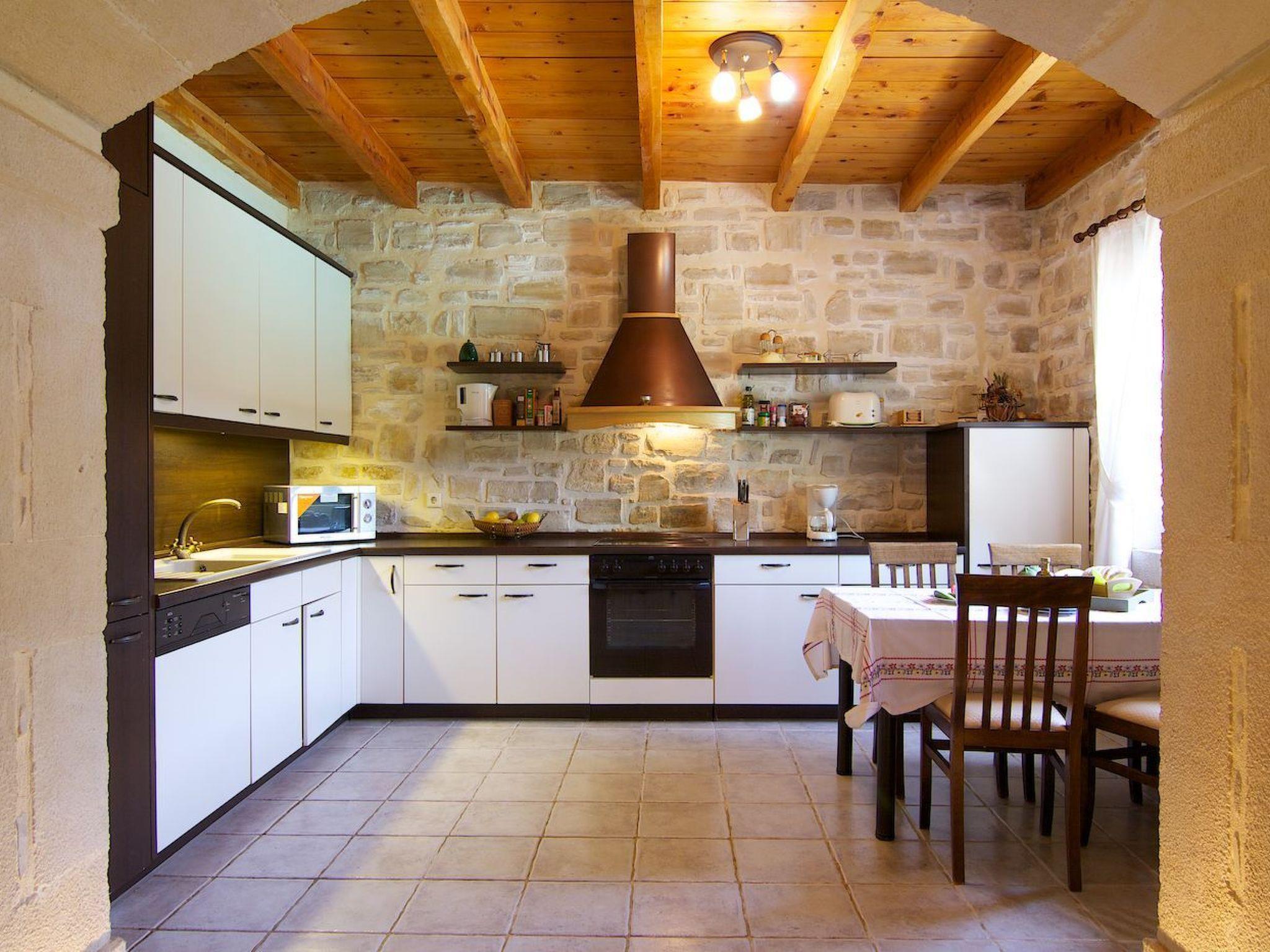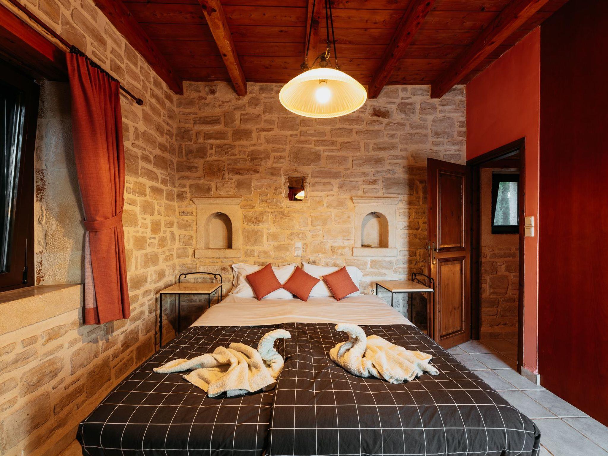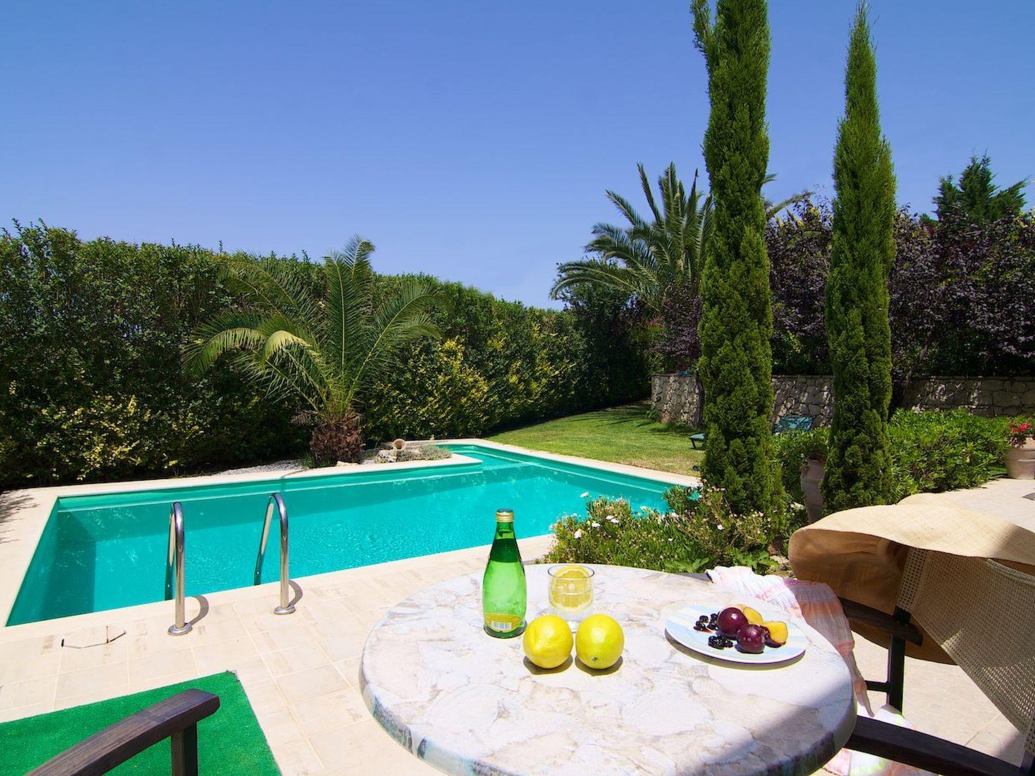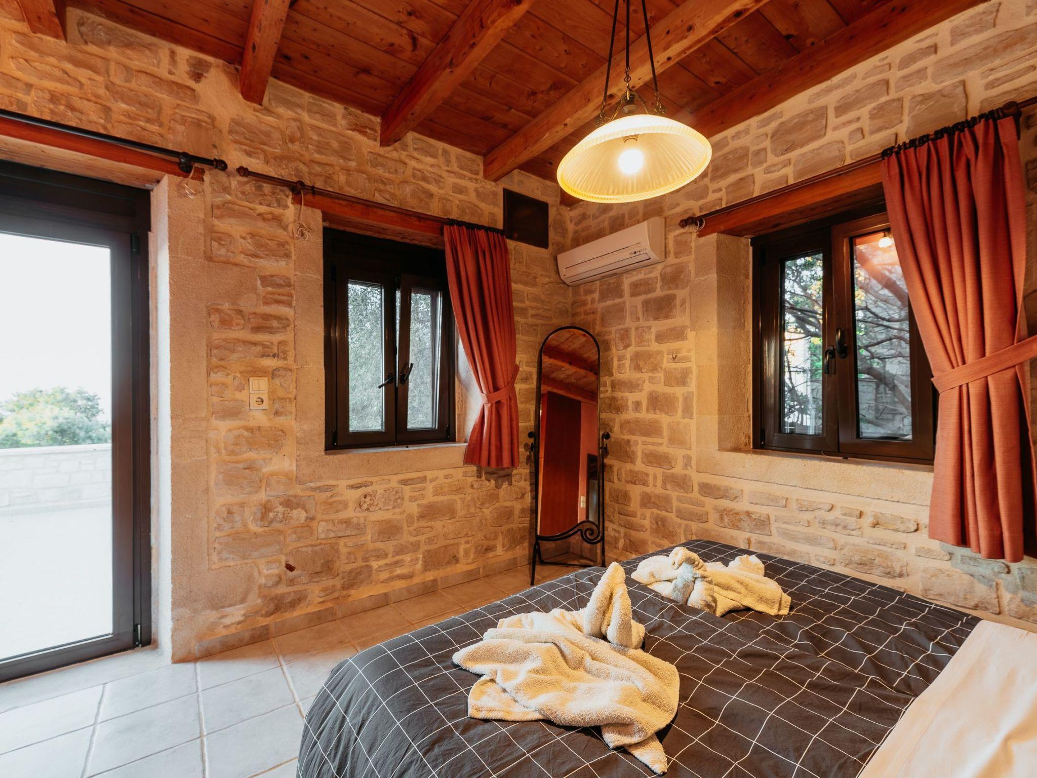 Outside the stone villa Olympia there is a terrace on the ground floor with direct access to the private swimming pool in the garden. On the upper floor there is a very large veranda, which can be reached both via an external staircase and an internal staircase. From this veranda there is a truly fantastic view of the sea and the White Mountains (2,500 metres above sea level and covered in snow from November to May). Here you can enjoy a wonderful sunset in the evening hours. The garden area has a lawn.