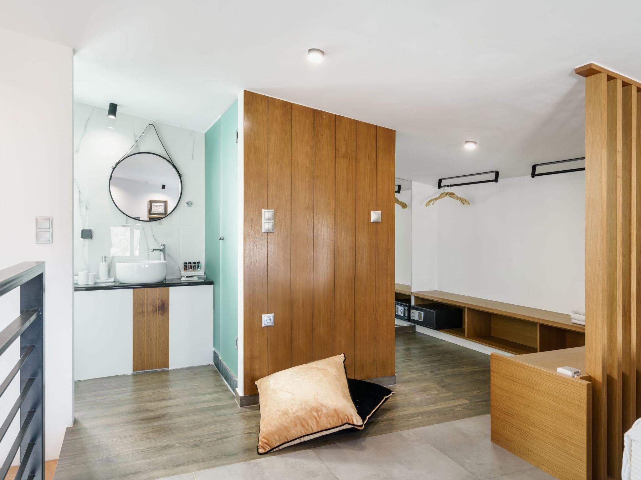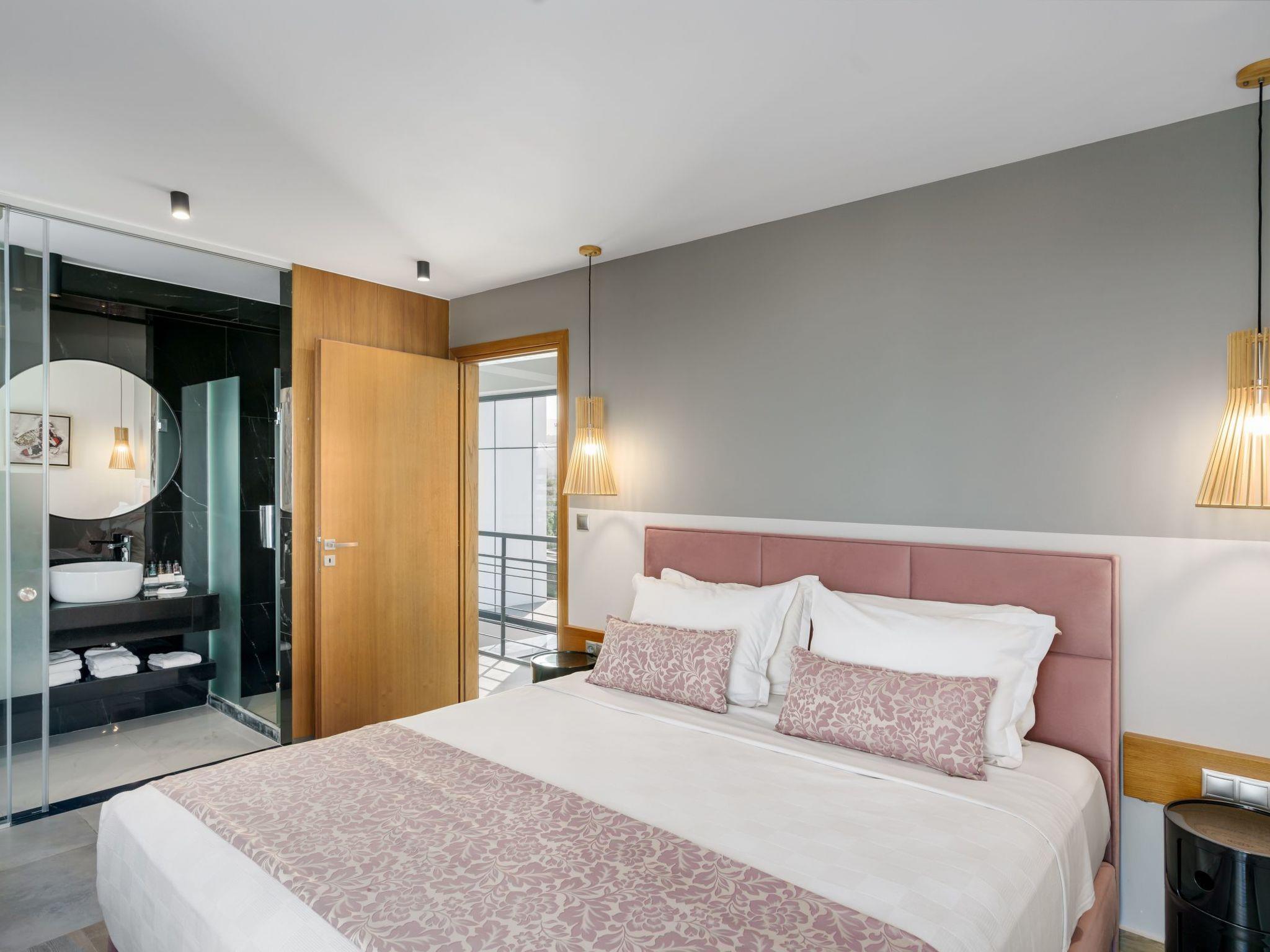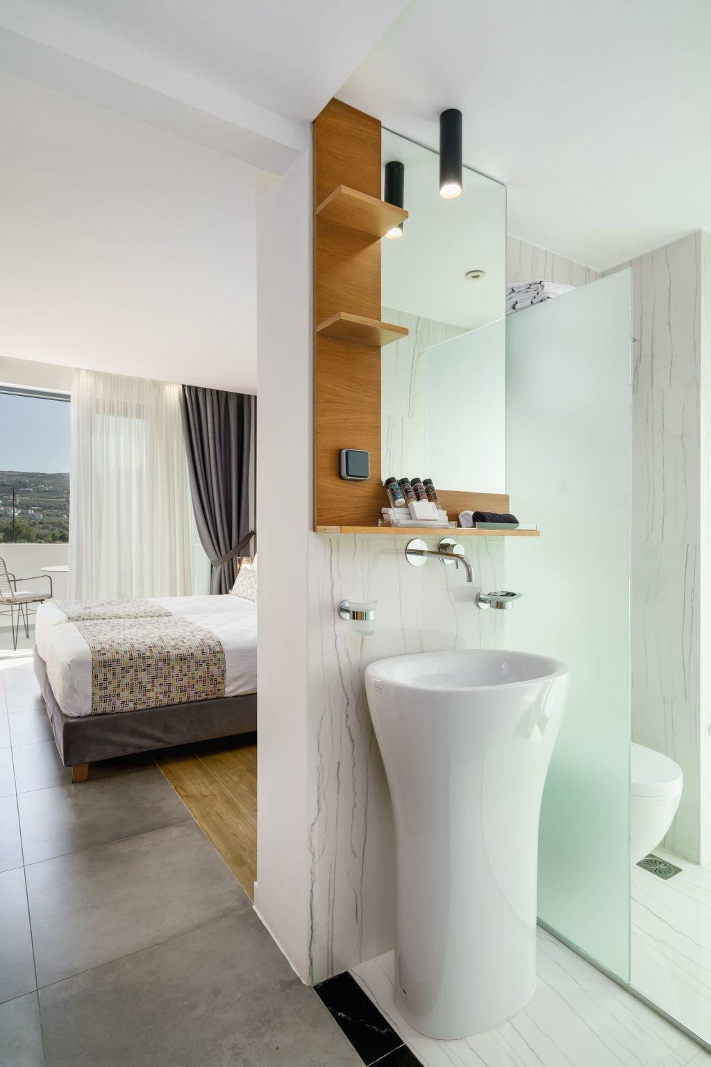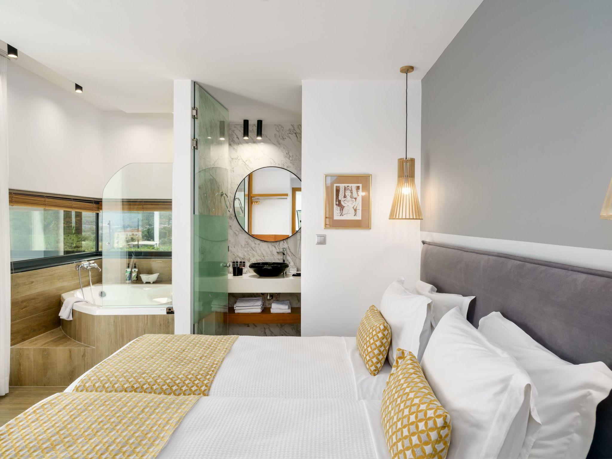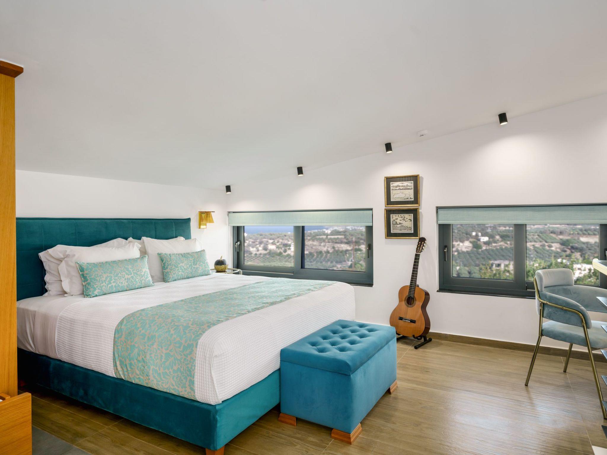 The attic bedroom offers a luxurious retreat with panoramic views of the Cretan Sea and Psiloritis Mountain. This special space includes a dedicated workspace (desk), an en-suite bathroom, and even a guitar for creative moments.
