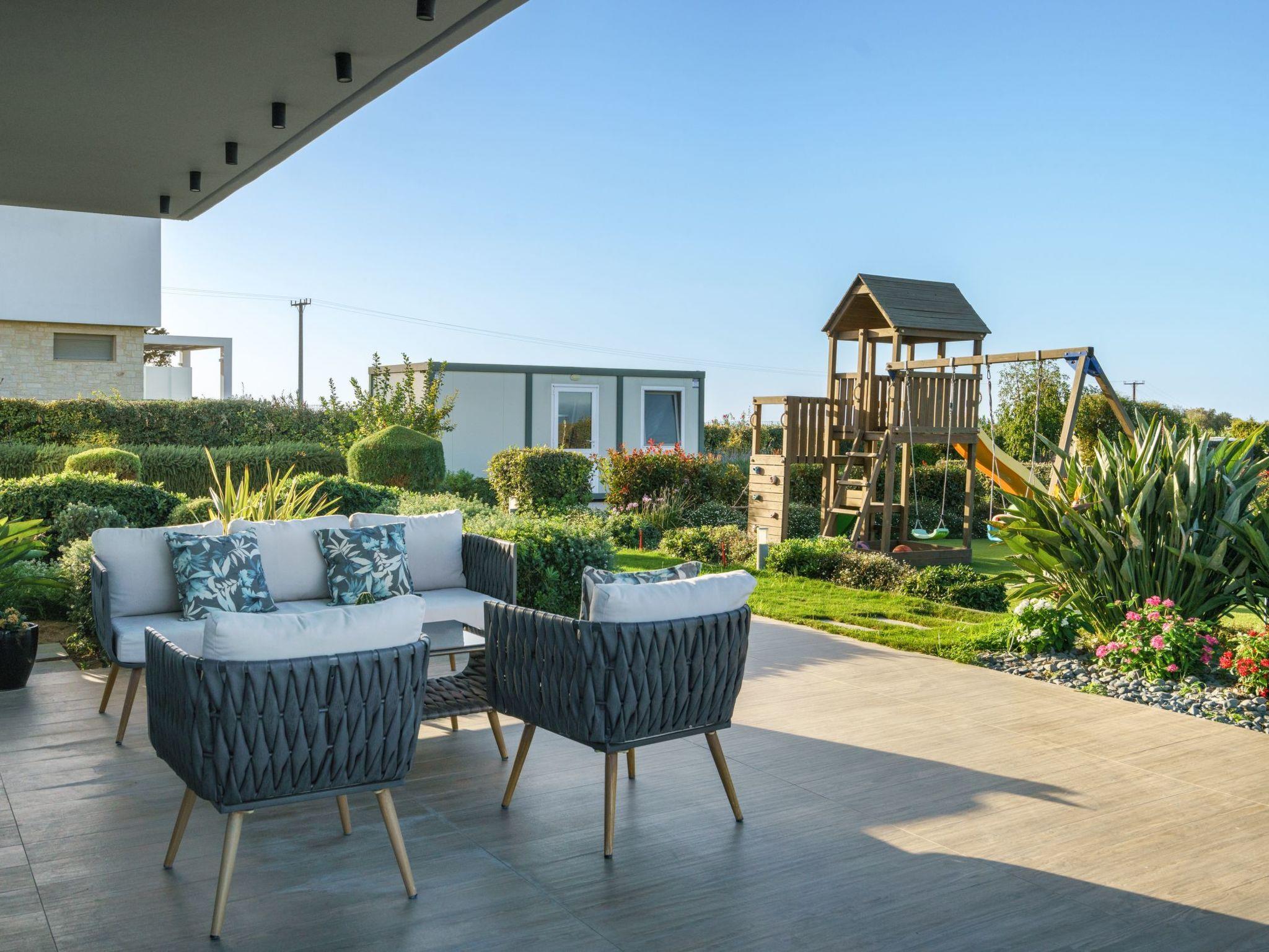 Step outside to enjoy the private infinity pool and hottub, surrounded by a fully fenced 4-acre garden for privacy. A BBQ area and comfortable seating make al fresco dining effortless, while a children’s playground make this villa ideal for families. Shaded lounge areas and sunbeds invite you to unwind, and the comfortable outdoor seating area surrounding a modern fire pit is perfect for cosy evenings under the Cretan sky.