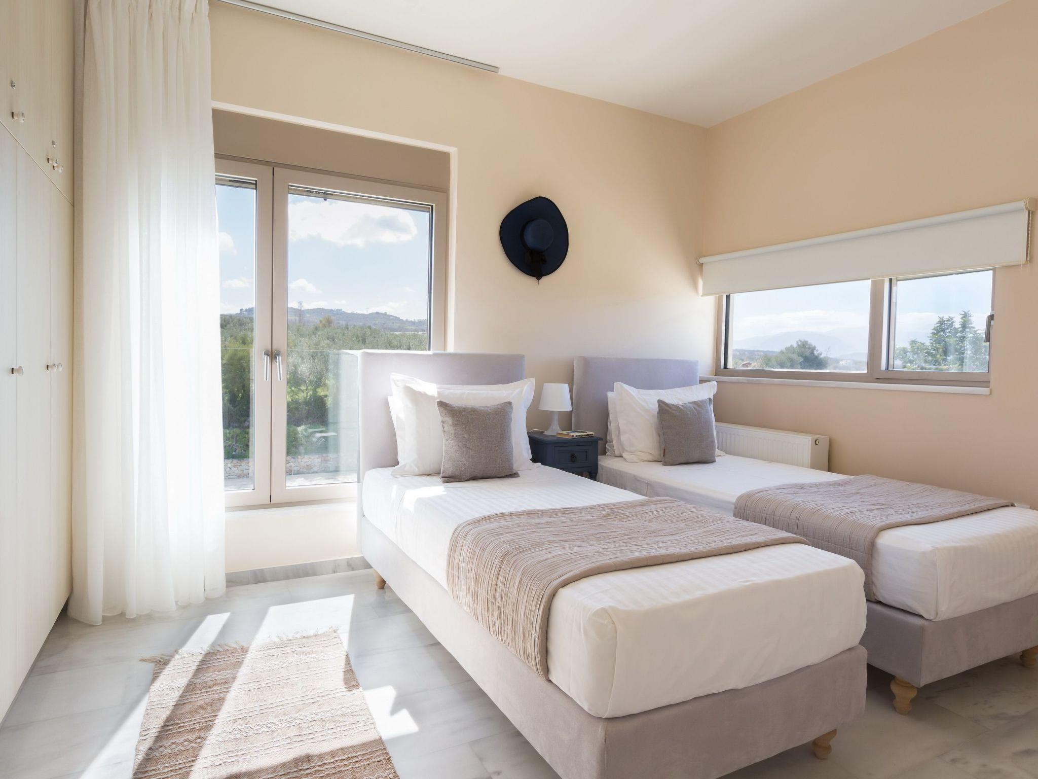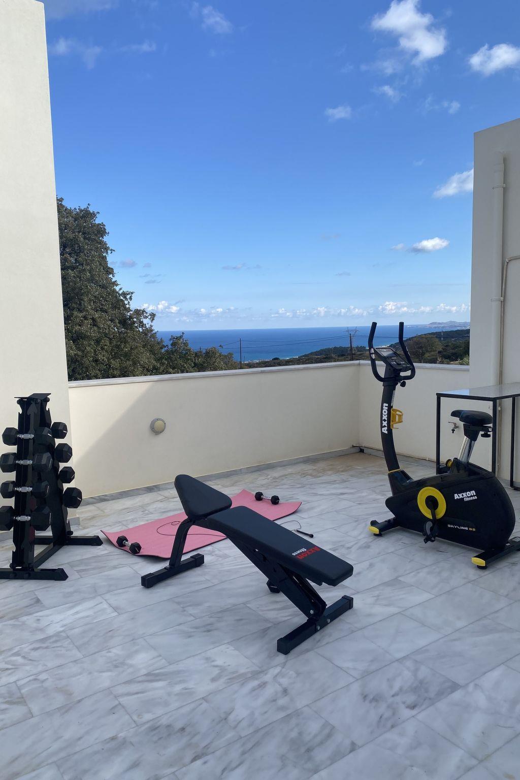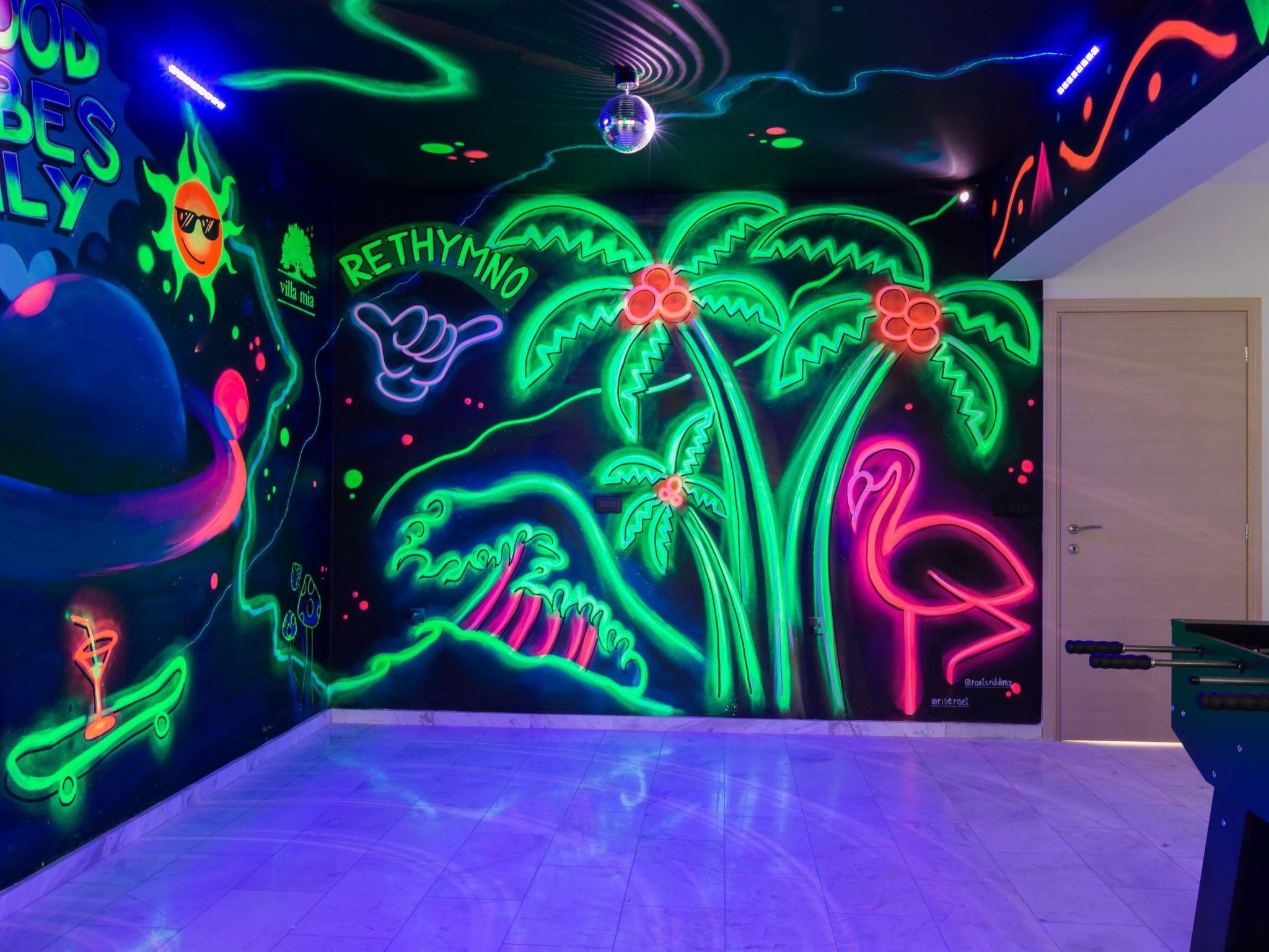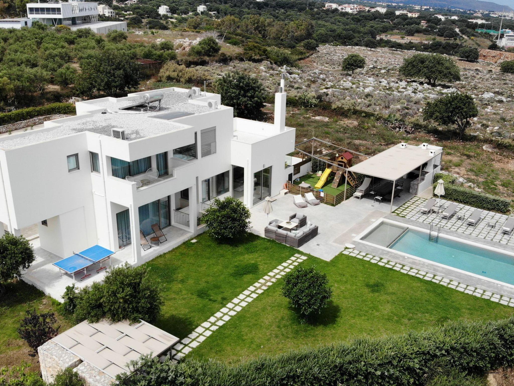 Welcome to our villa, located at Tria Monastiria at the outskirts of the lively town of Rethymno ! Amazing holidays are guaranteed in a beautiful villa, just 3km from the sandy beach of Rethymno, restaurants and shops. The fully renovated, five bedroom villa blends harmoniously with the beautiful landscape and offers gorgeous views of the Cretan sea, the city lights and the mountains. The classic and elegant decoration promises days and nights of relaxation.The villa is a three storey house and its interior occupies a space of 350 m2. It accommodates up to 11 guests and is ideal for families and groups of friends who seek relaxation and memorable family moments. Villa features five lovely bedrooms (two double, and three with twin beds), one of which is on the ground floor, one on the lower ground floor and the other three on the first floor . The eleventh person can sleep in a folding bed in one of the rooms. Furthermore, all bedrooms are sunny and airy. Bedrooms on the first floor both open to a large balcony with breathtaking views. On the ground floor, is the fully equipped kitchen & the dining area with direct access to the pool where a beautiful garden and olive trees are. A comfortable living room, with a fireplace located on this floor as well. In the lower ground floor there is a play room 85m2 which includes a pool table, wooden football table, arcade with 5000 games, card table and Black Light Disco corner. The villa also provides 4 bathrooms & 1 wc in all floors and an exterior wc next to the pool.The design on both floors creates a cozy atmosphere and relaxing environment. In most areas you can enjoy the fantastic unobstructed view of the area and the sea! Dining outdoors is an experience you should definitely try and you most certainly will love it!The outdoor space of the villa provides everything you need for a memorable family holiday, including a 50 m2 private swimming pool (1.50 m deep for adults & 0,60 m for the children) in a beautiful terrace, equipped with sun beds, umbrellas, where you’ll love spending your time, just enjoying the sun and the summer breeze! Furthermore, an outdoor shaded sitting area, where you can treat yourself to a nice glass of wine or just prepare a homemade meal in the BBQ facilities for the whole family, while your kids play right next to you, at the children’s playground, in the ping pong, or in the half basketball court!Spend some quality time with your loved ones and make the most out of your stay!