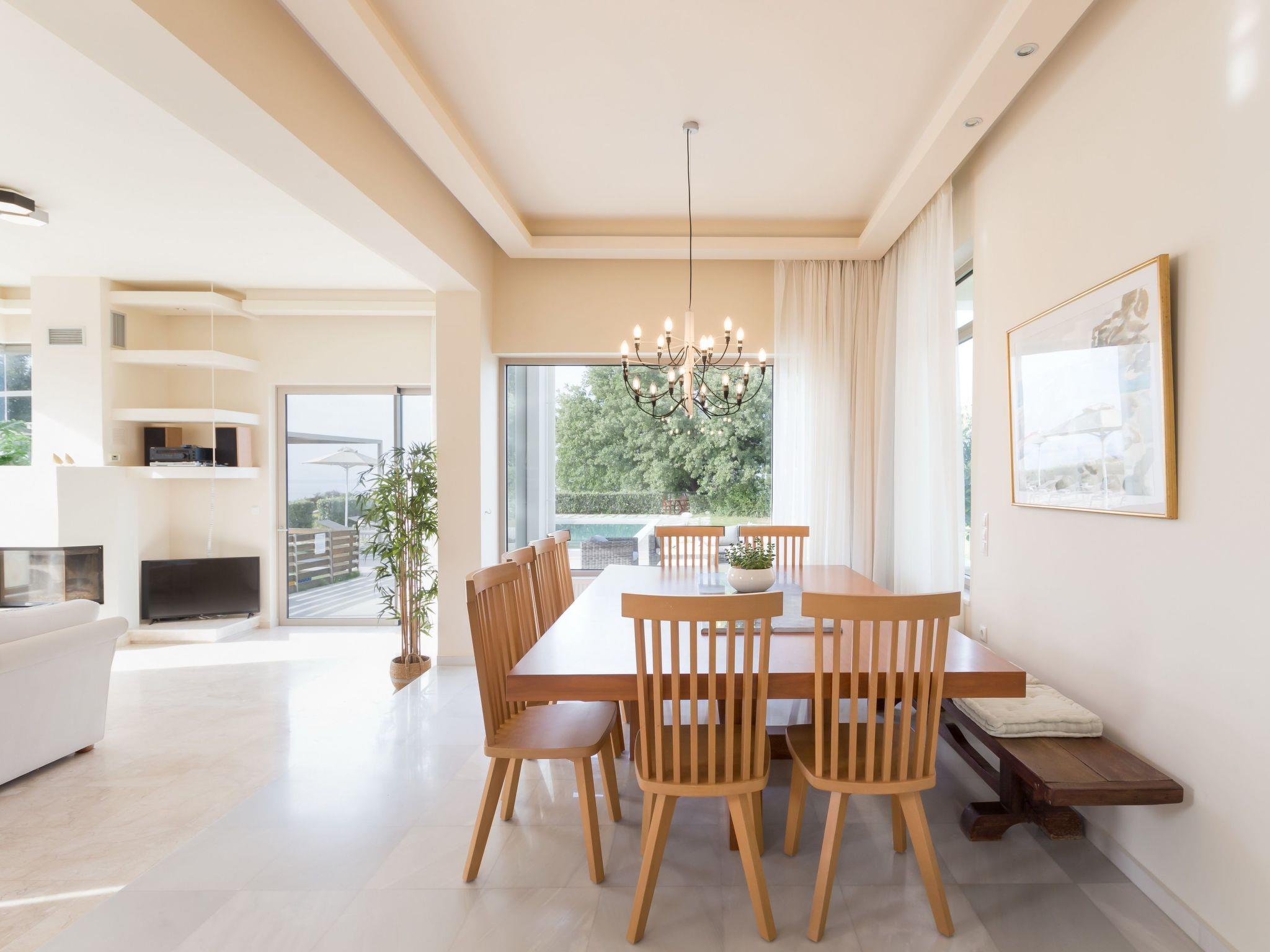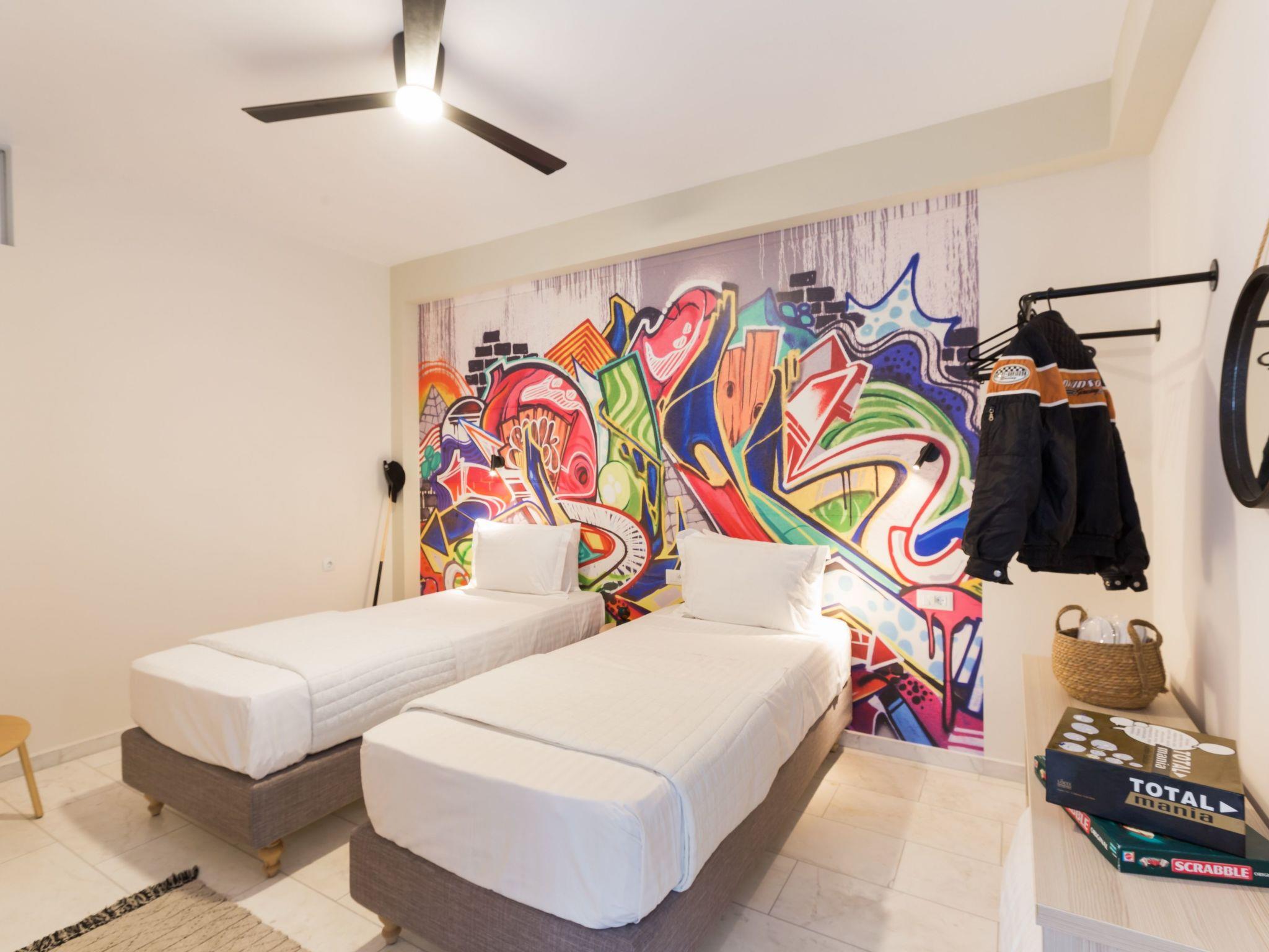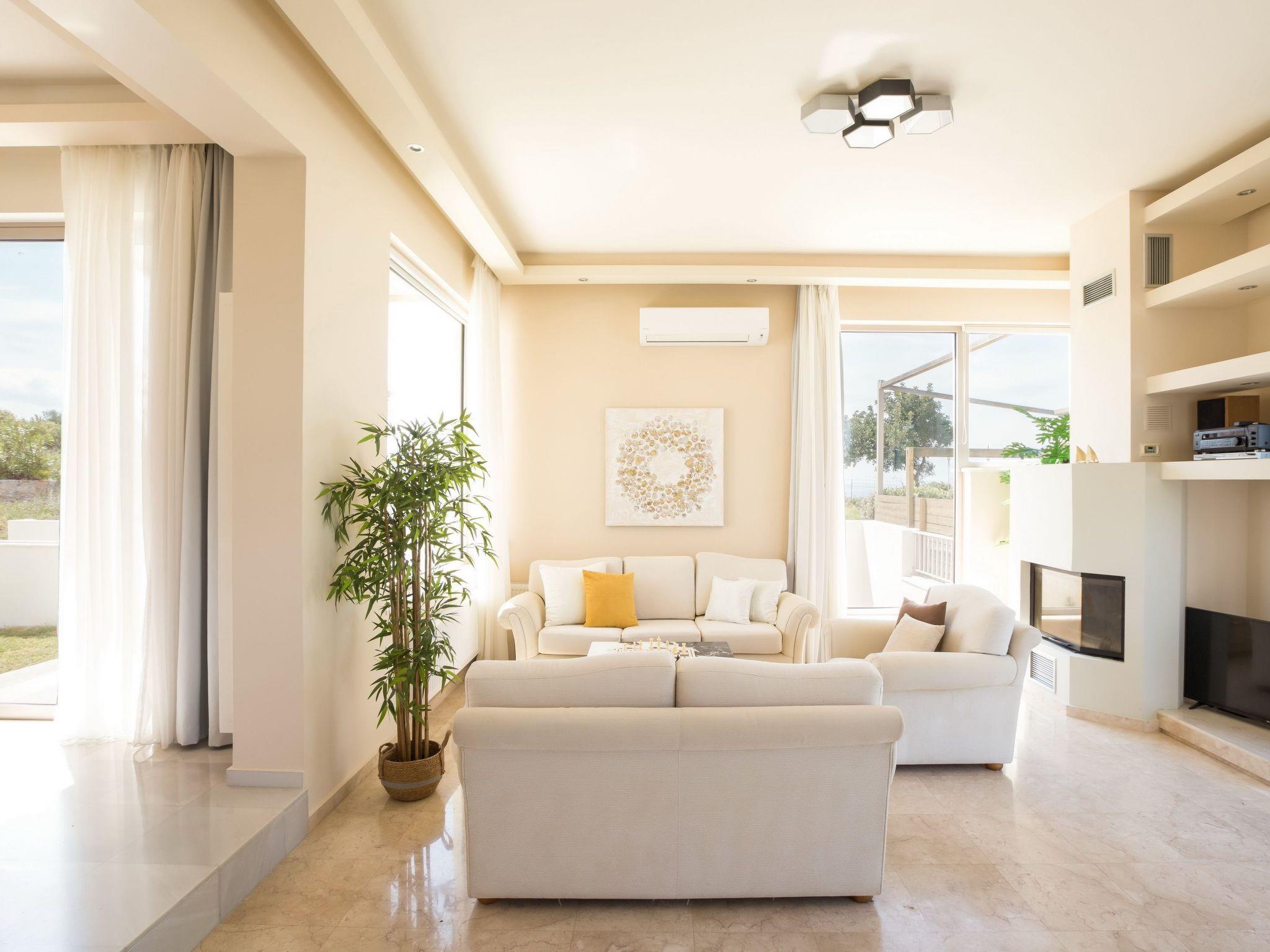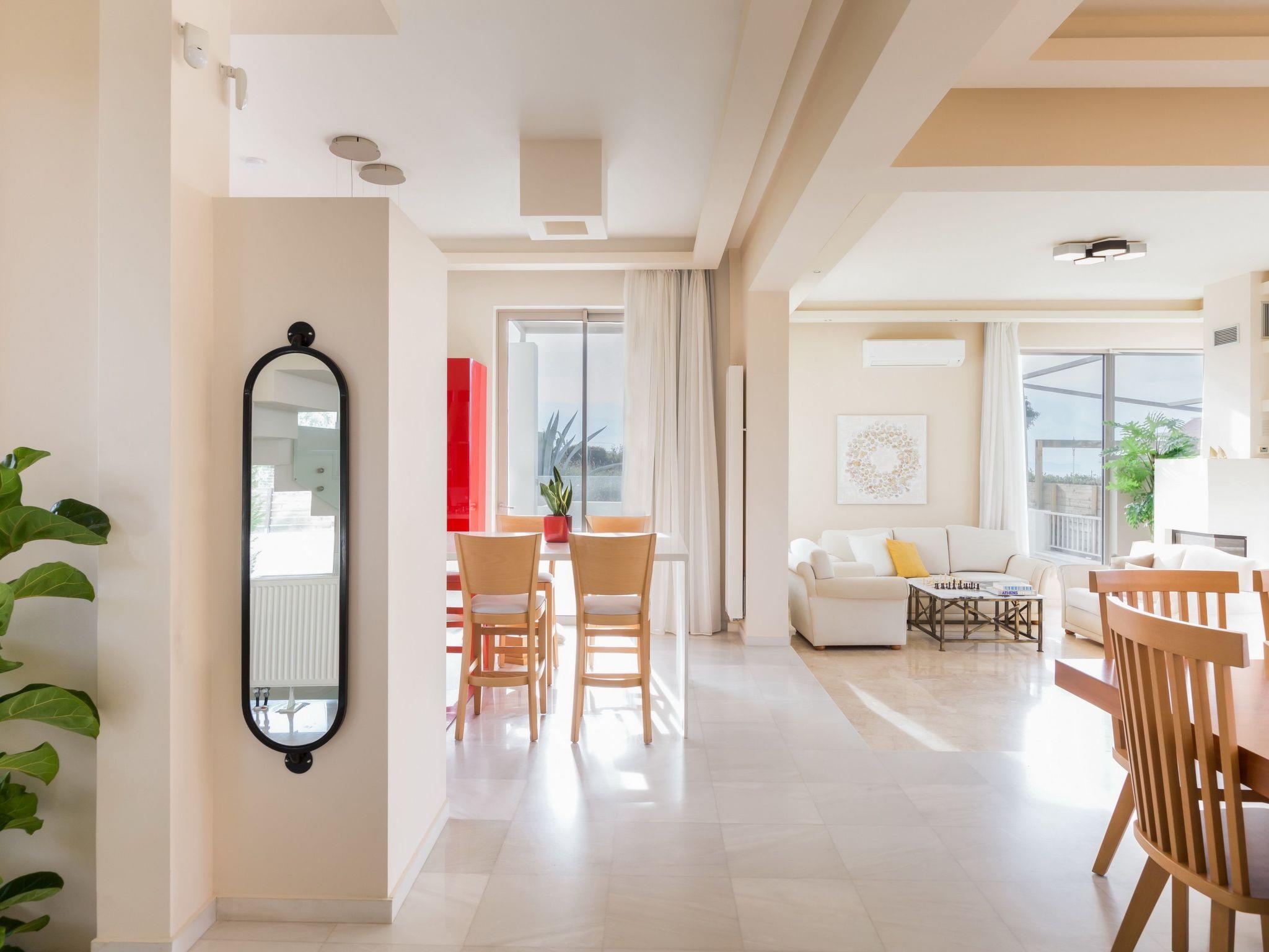Welcome to our villa, located at Tria Monastiria at the outskirts of the lively town of Rethymno ! Amazing holidays are guaranteed in a beautiful villa, just 3km from the sandy beach of Rethymno, restaurants and shops. The fully renovated, five bedroom villa blends harmoniously with the beautiful landscape and offers gorgeous views of the Cretan sea, the city lights and the mountains. The classic and elegant decoration promises days and nights of relaxation.The villa is a three storey house and its interior occupies a space of 350 m2. It accommodates up to 11 guests and is ideal for families and groups of friends who seek relaxation and memorable family moments. Villa features five lovely bedrooms (two double, and three with twin beds), one of which is on the ground floor, one on the lower ground floor and the other three on the first floor . The eleventh person can sleep in a folding bed in one of the rooms. Furthermore, all bedrooms are sunny and airy. Bedrooms on the first floor both open to a large balcony with breathtaking views. On the ground floor, is the fully equipped kitchen & the dining area with direct access to the pool where a beautiful garden and olive trees are. A comfortable living room, with a fireplace located on this floor as well. In the lower ground floor there is a play room 85m2 which includes a pool table, wooden football table, arcade with 5000 games, card table and Black Light Disco corner. The villa also provides 4 bathrooms & 1 wc in all floors and an exterior wc next to the pool.The design on both floors creates a cozy atmosphere and relaxing environment. In most areas you can enjoy the fantastic unobstructed view of the area and the sea! Dining outdoors is an experience you should definitely try and you most certainly will love it!The outdoor space of the villa provides everything you need for a memorable family holiday, including a 50 m2 private swimming pool (1.50 m deep for adults & 0,60 m for the children) in a beautiful terrace, equipped with sun beds, umbrellas, where you’ll love spending your time, just enjoying the sun and the summer breeze! Furthermore, an outdoor shaded sitting area, where you can treat yourself to a nice glass of wine or just prepare a homemade meal in the BBQ facilities for the whole family, while your kids play right next to you, at the children’s playground, in the ping pong, or in the half basketball court!Spend some quality time with your loved ones and make the most out of your stay!