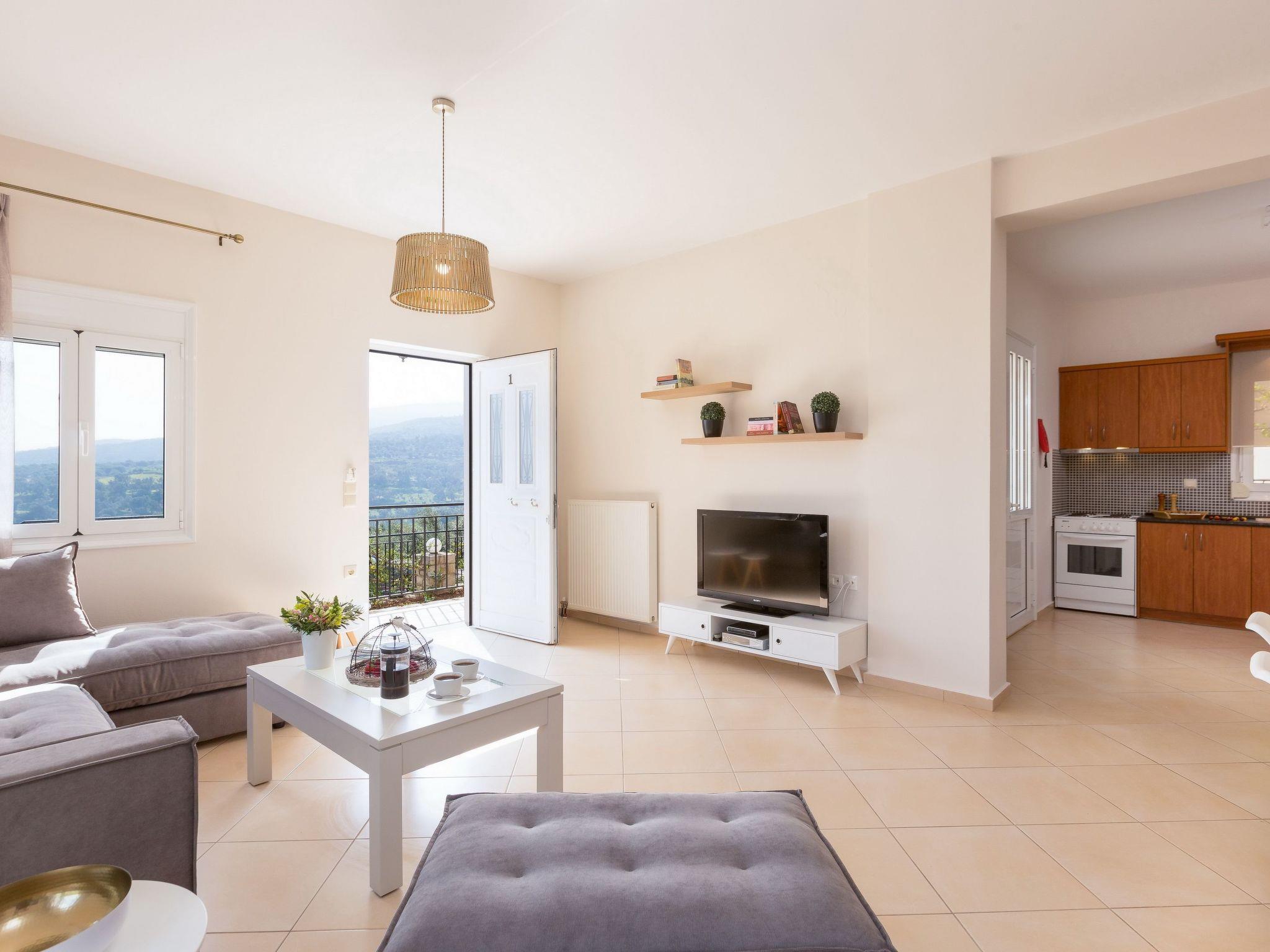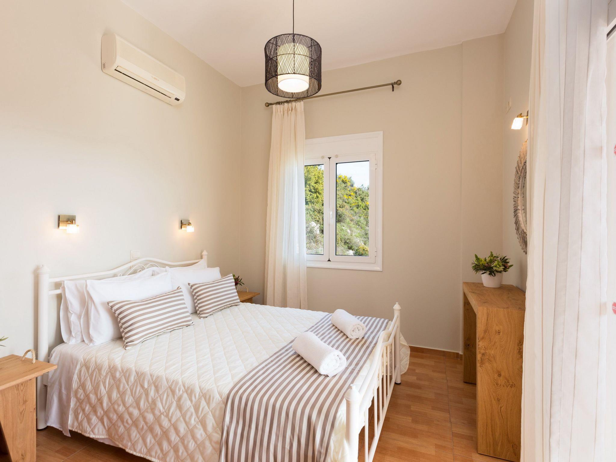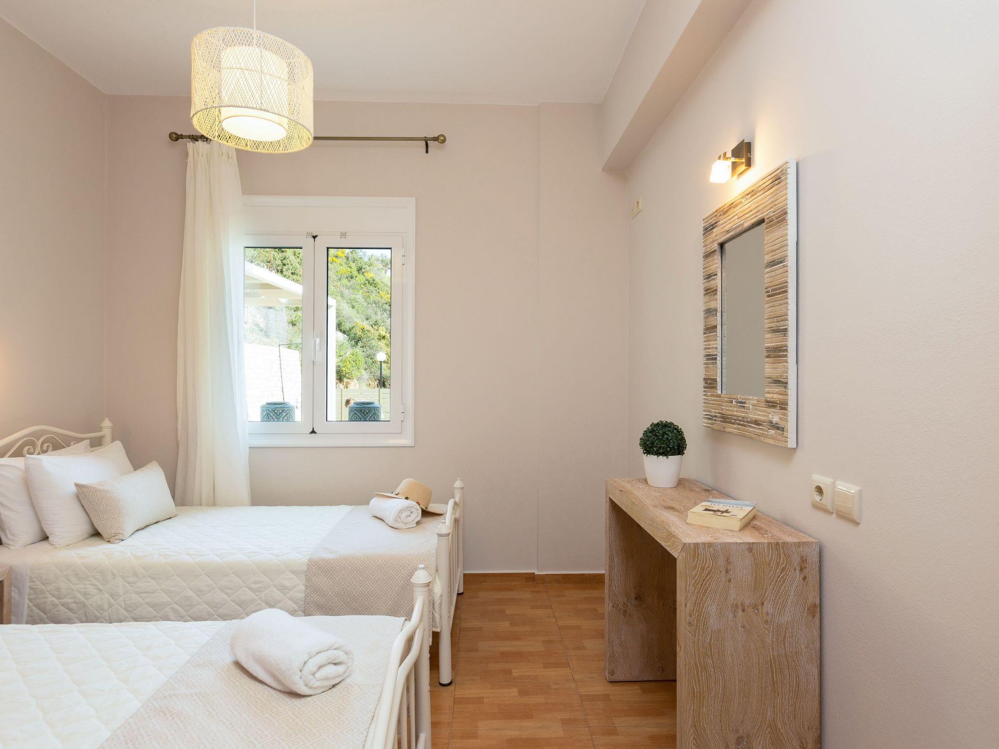 Villa Morfeas is a recently built holiday villa that reflects a relaxing local atmosphere, due to its position, construction and service. It’s the villa’s amazing views and the private pool that visitors remember most, as they take a seat on the shady terrace where you’re likely to be distracted from your lunch by the views of the high mountains and the vast sea. Divided in two levels, Villa Morfeas can accommodate in comfort up to 8 guests in three decent bedrooms with views across the countryside to the sea. The open plan living area, which consists of a living room with a fireplace and a fully equipped with a dining table, offers direct access to the pool terrace. Outdoors, Villa Morfeas has a 25 m2 private swimming pool with comfortable sun beds is commanded by the awesome views while at night time, its amazing lighting creates a romantic, almost magical atmosphere. The fenced gardens are perfect for children to roam free and play around the terrace, while the lawns a great for athletic purposes or activities such as yoga and games. Additionally, next to the pool terrace you will find the BBQ facilities, as well as outdoor dining table for the whole family, giving you the chance to enjoy your homemade meals in the fresh air while gazing the stunning sea views and enjoy al fresco dining!