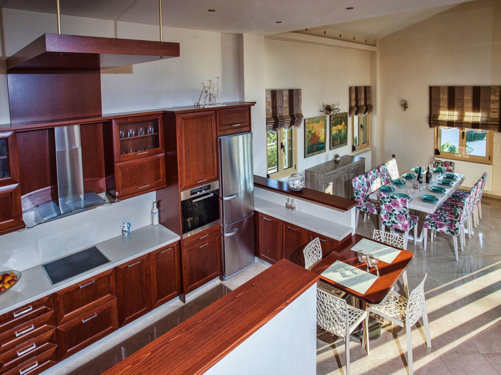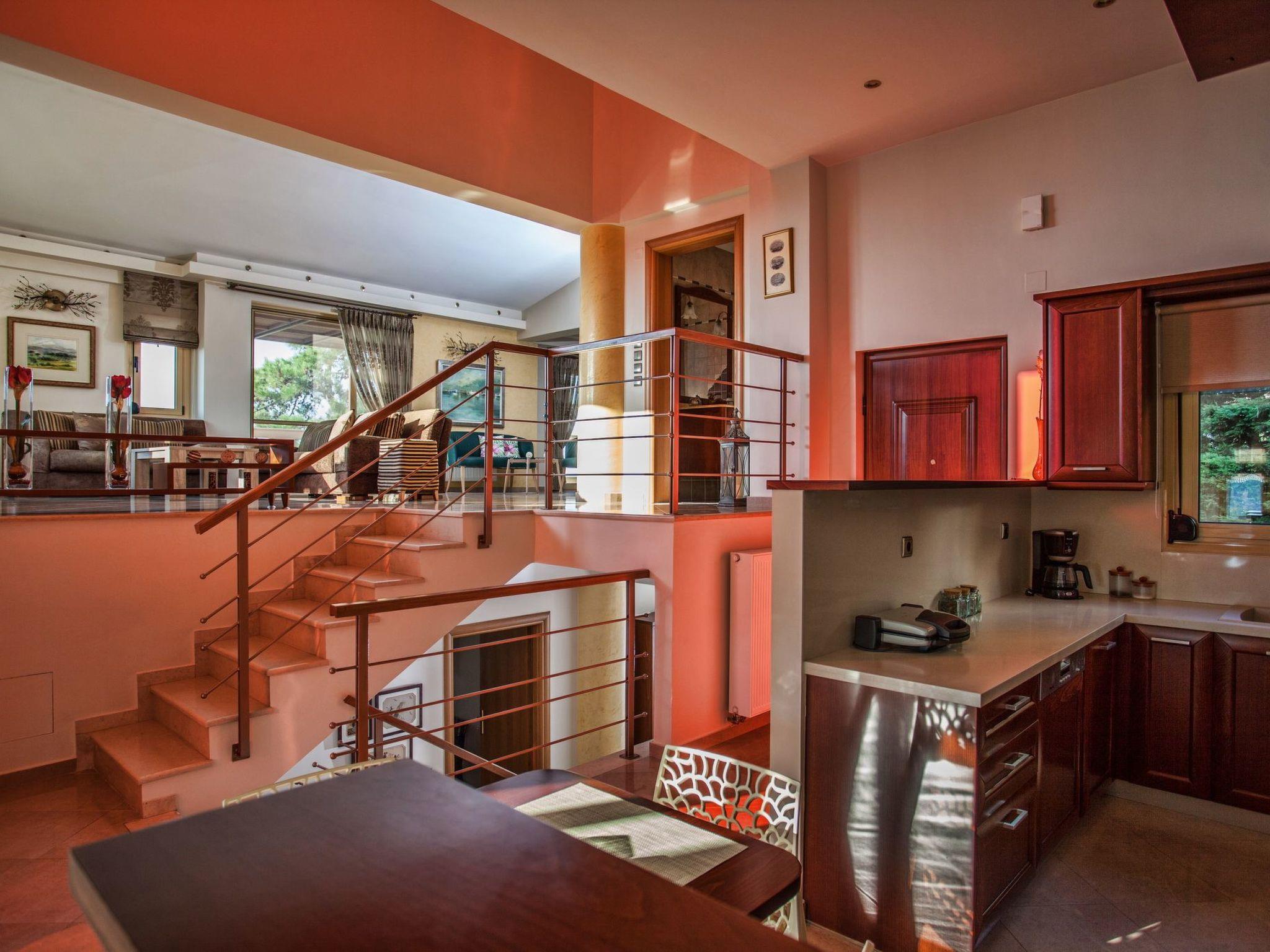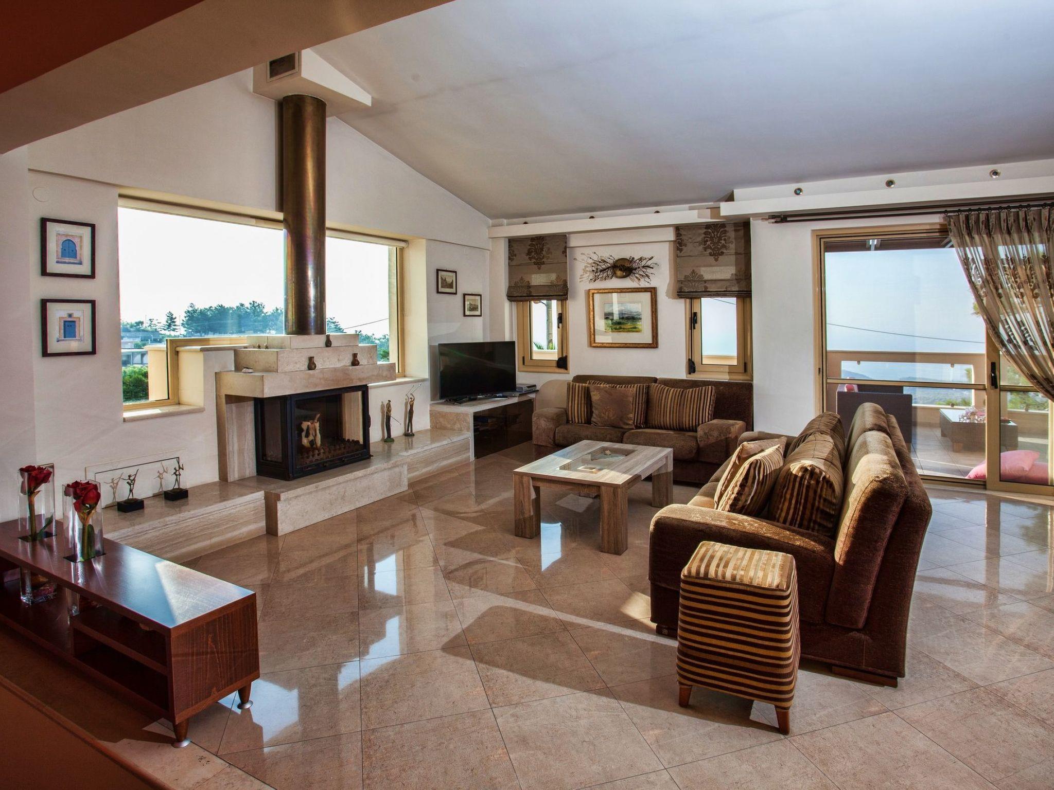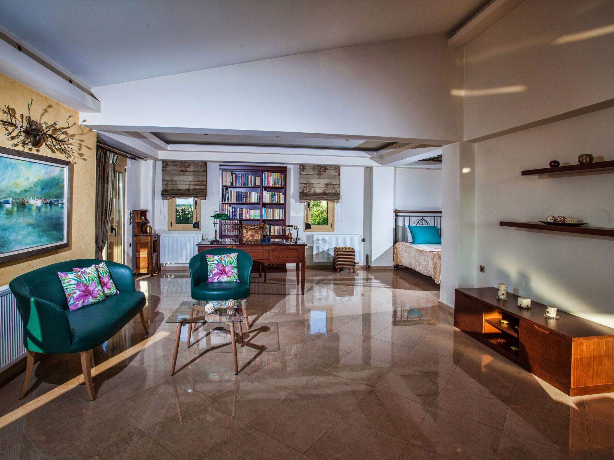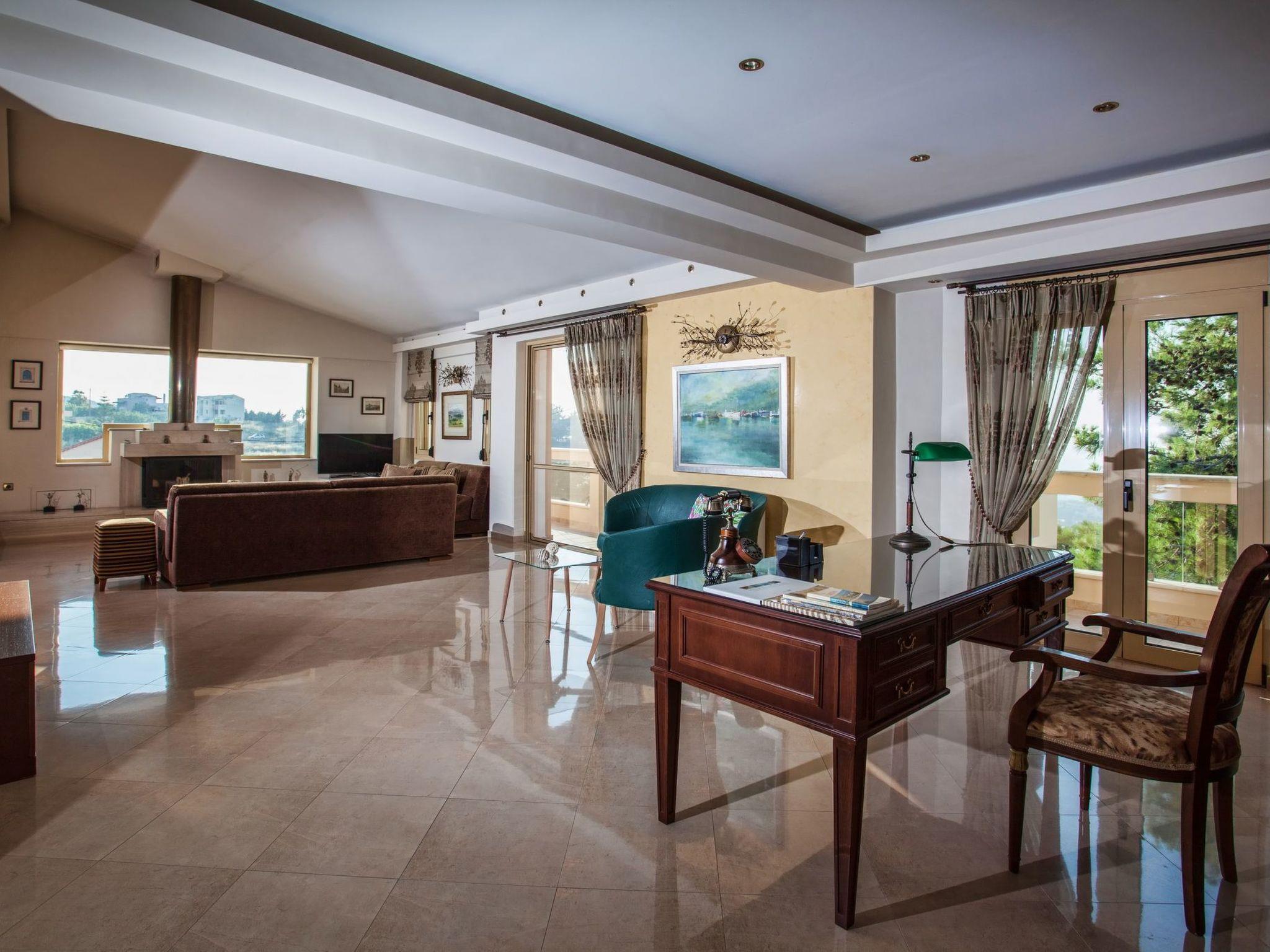 The large terrace and balconies offer beautiful views over the surrounding area and the distant sea. Full Air Conditioned. High Quality Construction. The villa is 300sqm in size, is a very elegant and spacious villa, with 5 bedrooms; 1 of them with double beds and luxurious en-suite bathrooms/WC, 2 bedrooms with twin beds share one luxurious bathroom/WC and 1 whith twins beds, sofa bed, babycot and luxurious en-suite bathrooms/WC, all on the ground floor, on the second floor is an open bedroom with a double iron bed and a double sofa bed, it is suitable for up to 10-14 people. An open marble staircase(eight steps) leads to upper floor where is a very well equipped kitchen with full electric cooker, electric oven, microwave, dishwasher, fridge/freezer, coffee machine, toaster, juicer, and electric kettle. In the same level of the kitchen there is the dining room with a big dining table for 12 people. From the dining room a door leads out to the terrace where is another big table and a big umbrella for having breakfast, launch or dinner al fresco. Another eight steps up the kitchen area has comfortable seating, fireplace with glass, satellite TV and DVD player. Further to this there is one WC on this floor, a door opening out to the covered balcony with patio furniture with fantastic views the surround area and the distant sea. In the same level with the seating area there is a corner with a desk, library, WiFi VDSL is available inside and outside of the villa. There is a safety deposit box in the master bedroom. Air-condition is available in all bedrooms. Next to the garage there is a utility room with a washing machine and iron board. The villa is well equipped and furnished, with central heating for cooler periods of the year.