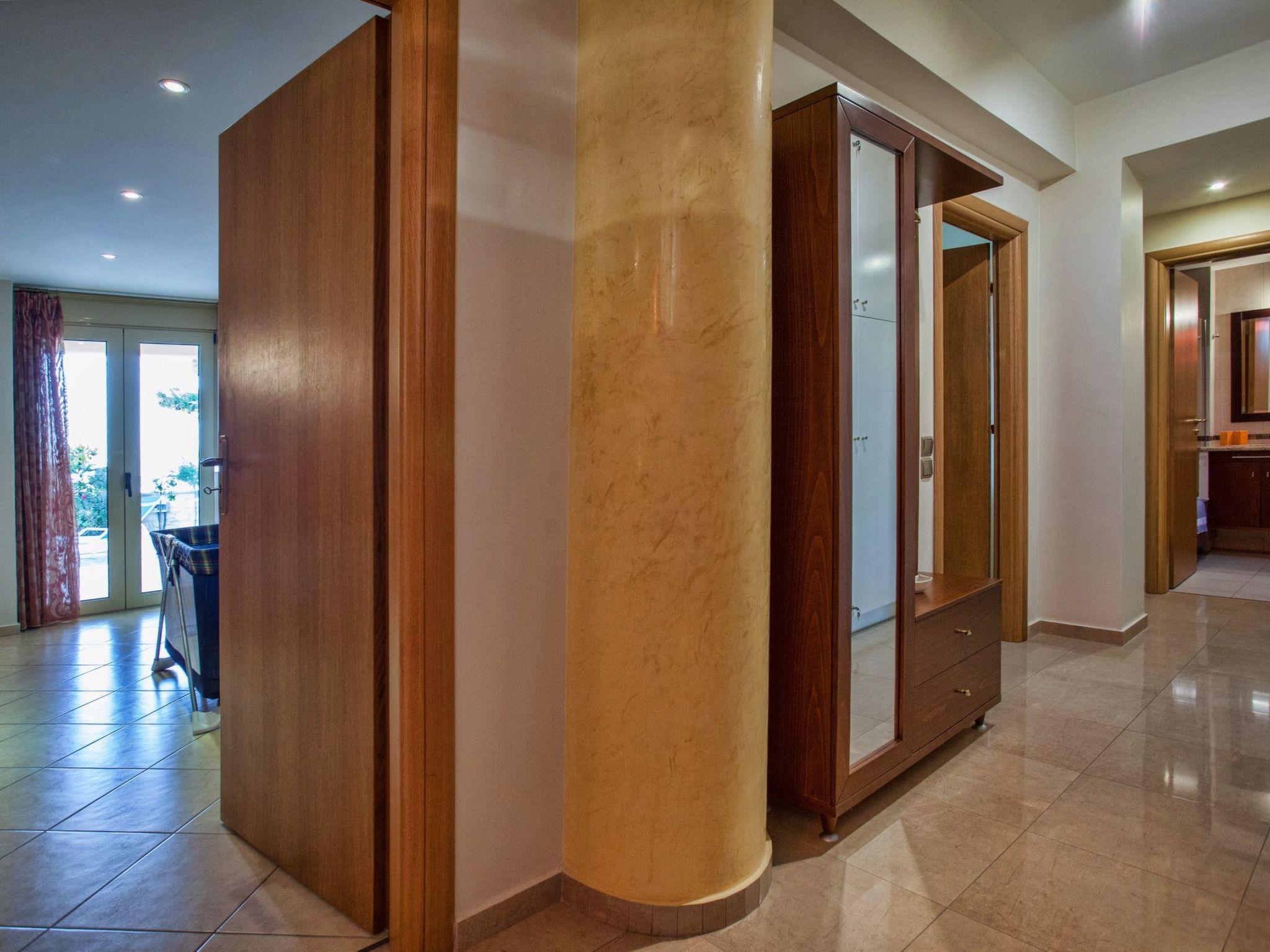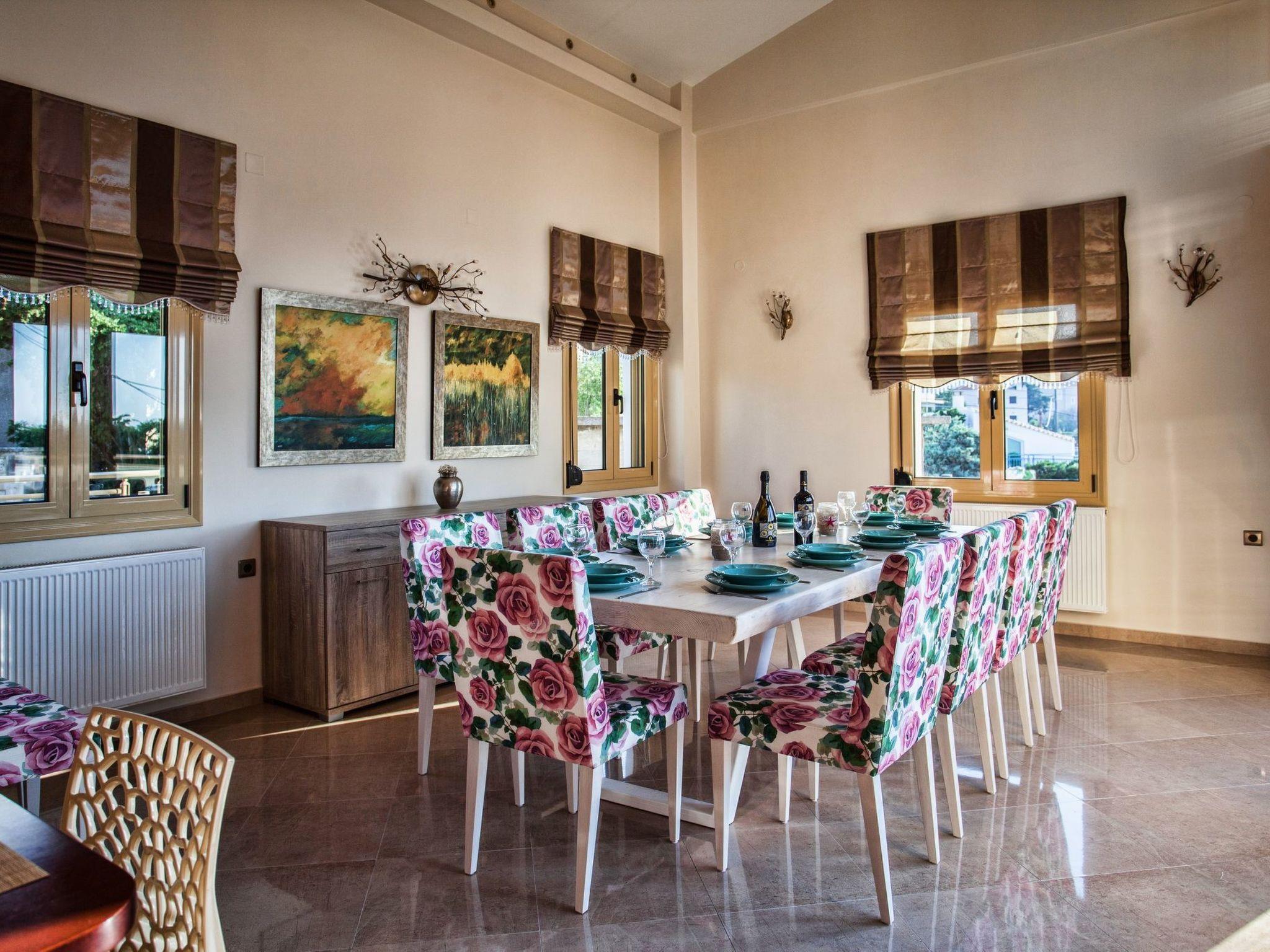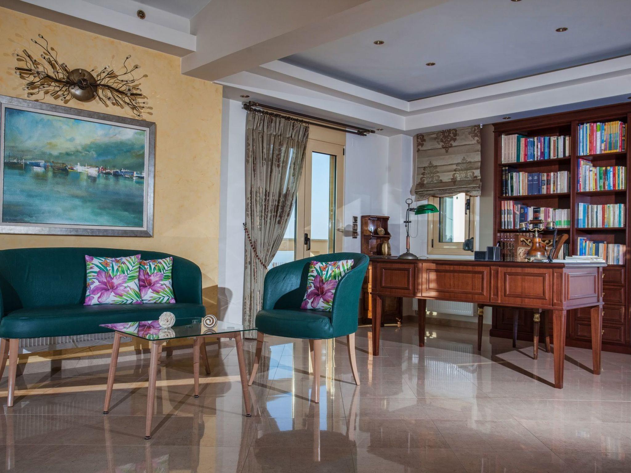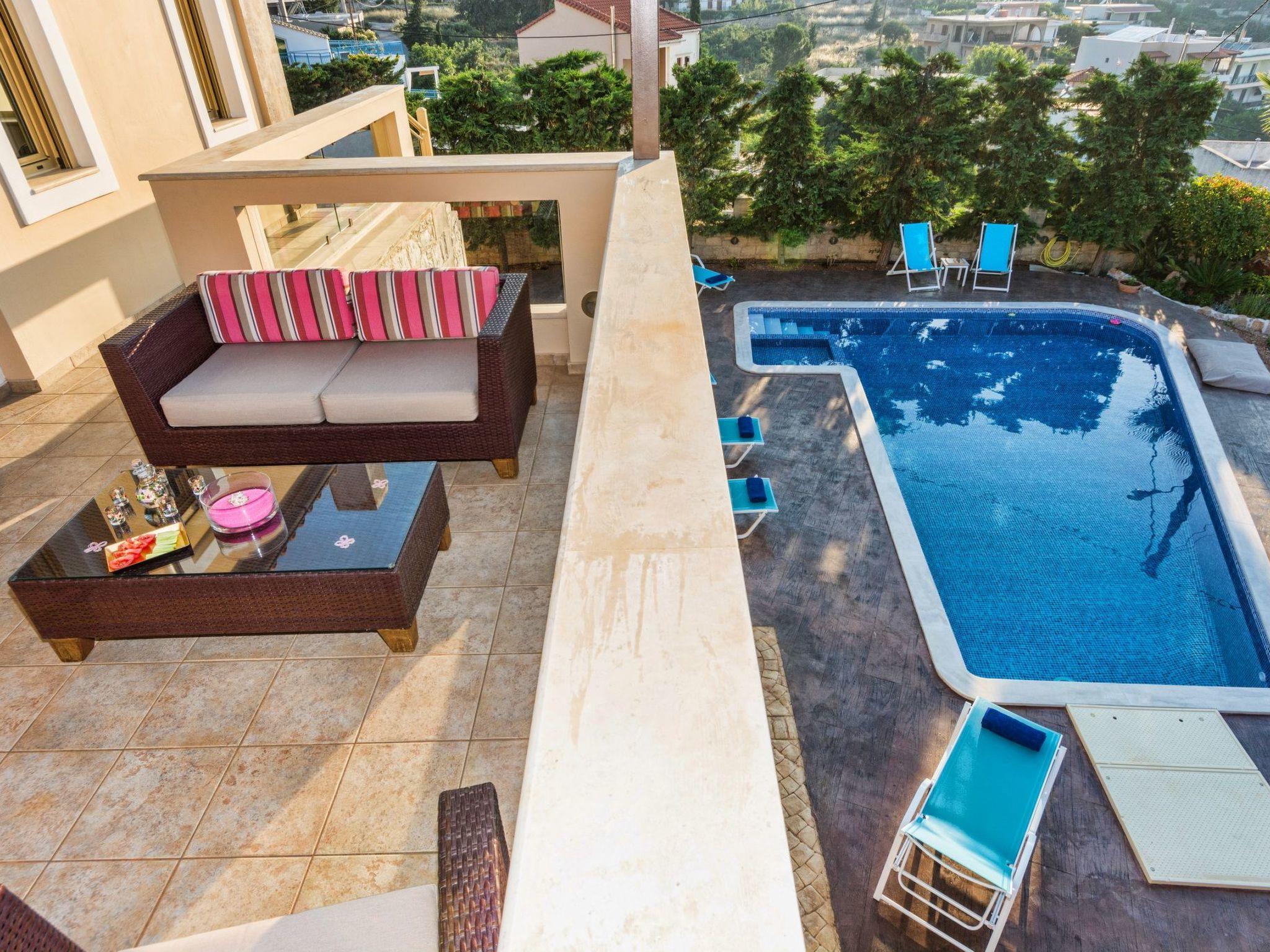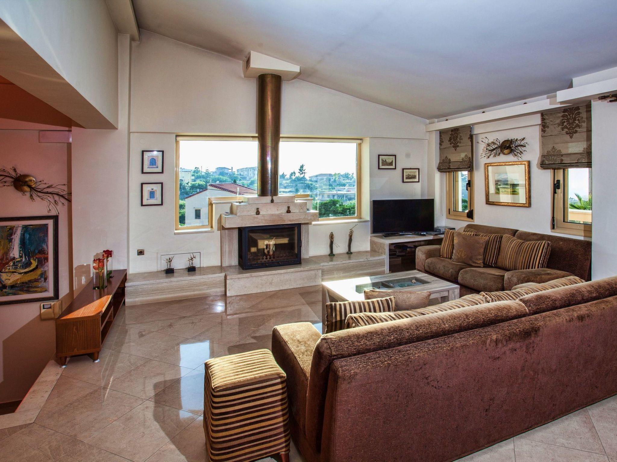 The large terrace and balconies offer beautiful views over the surrounding area and the distant sea. Full Air Conditioned. High Quality Construction. The villa is 300sqm in size, is a very elegant and spacious villa, with 5 bedrooms; 1 of them with double beds and luxurious en-suite bathrooms/WC, 2 bedrooms with twin beds share one luxurious bathroom/WC and 1 whith twins beds, sofa bed, babycot and luxurious en-suite bathrooms/WC, all on the ground floor, on the second floor is an open bedroom with a double iron bed and a double sofa bed, it is suitable for up to 10-14 people. An open marble staircase(eight steps) leads to upper floor where is a very well equipped kitchen with full electric cooker, electric oven, microwave, dishwasher, fridge/freezer, coffee machine, toaster, juicer, and electric kettle. In the same level of the kitchen there is the dining room with a big dining table for 12 people. From the dining room a door leads out to the terrace where is another big table and a big umbrella for having breakfast, launch or dinner al fresco. Another eight steps up the kitchen area has comfortable seating, fireplace with glass, satellite TV and DVD player. Further to this there is one WC on this floor, a door opening out to the covered balcony with patio furniture with fantastic views the surround area and the distant sea. In the same level with the seating area there is a corner with a desk, library, WiFi VDSL is available inside and outside of the villa. There is a safety deposit box in the master bedroom. Air-condition is available in all bedrooms. Next to the garage there is a utility room with a washing machine and iron board. The villa is well equipped and furnished, with central heating for cooler periods of the year.