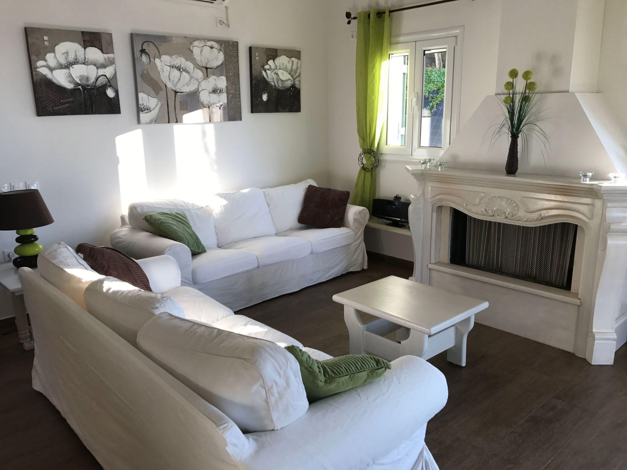 A living/dining room (TV, dining table for 6, sofa that seats 6, air conditioning, adjoining terrace)