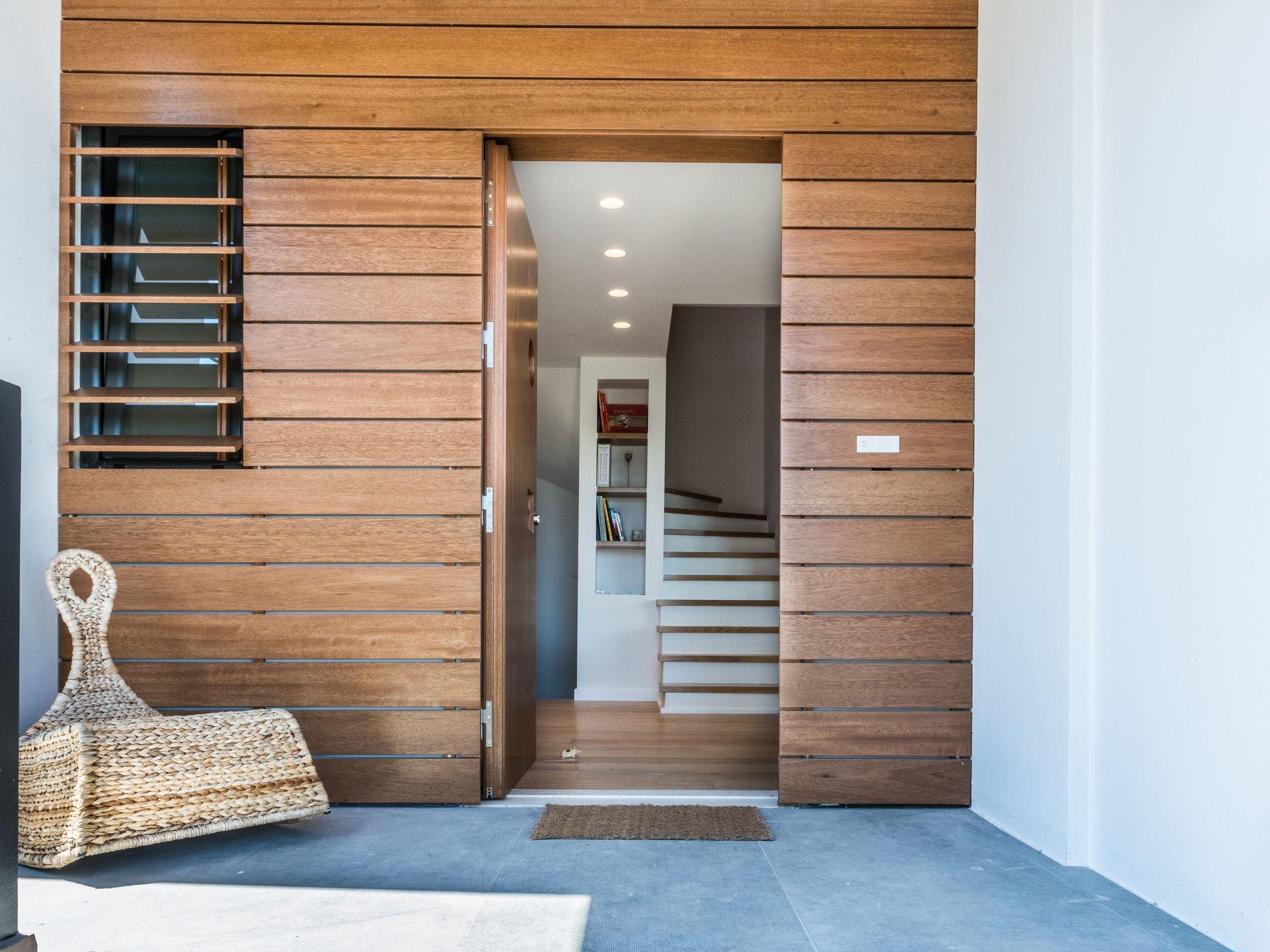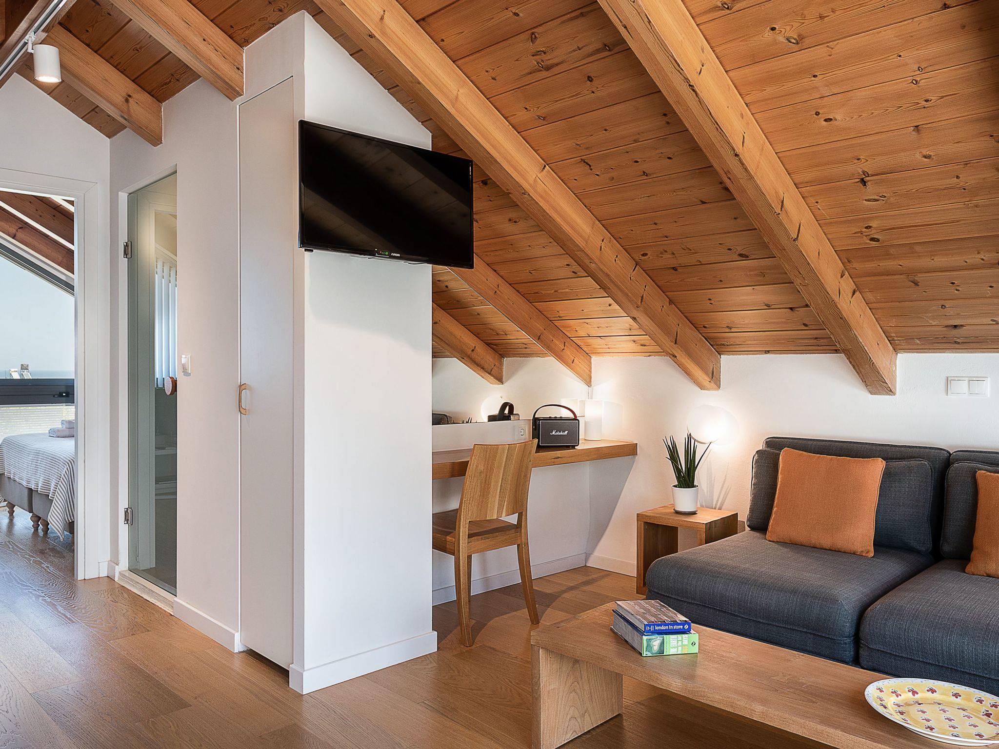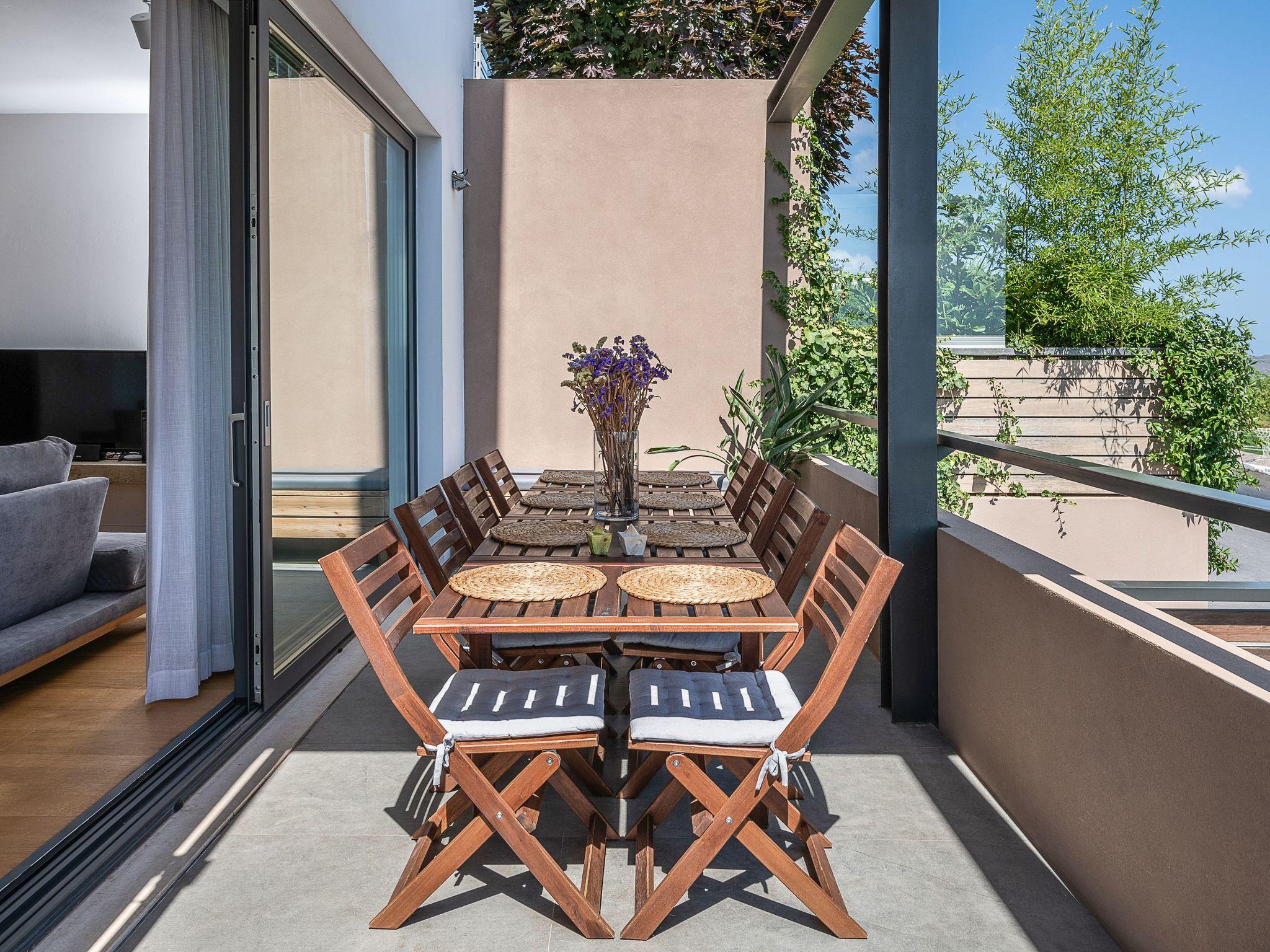 On the first floor there are three bedrooms and two bathrooms. One of the bedrooms has a double bed and an en suite bathroom. The other two bedrooms each have two single beds. Every bedroom has its own balcony.