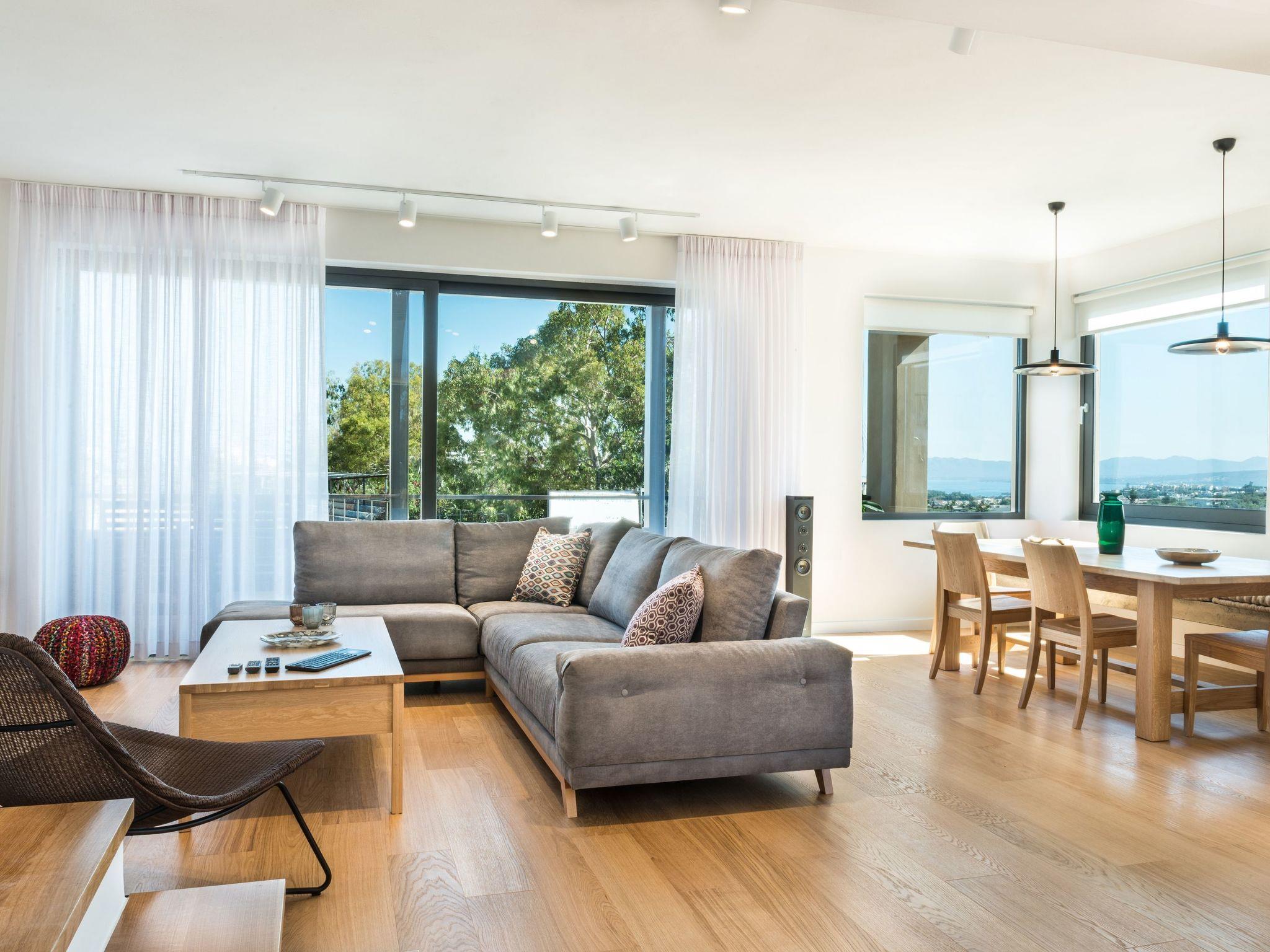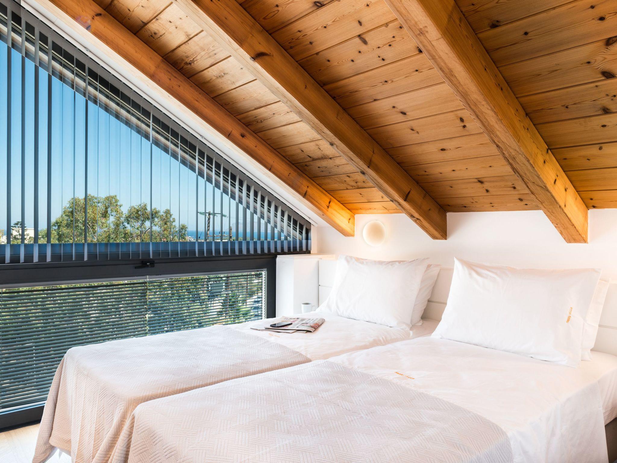 The top floor of the villa has superb views of the sea and Ag. Theodori Island, on the north side, from the south side, you can enjoy the scenery of the ‘Lefka Ori’ mountains. There is one bedroom with two single beds, one shower room, one WC and a sitting room area which can also accommodate two people with its double sofa bed.