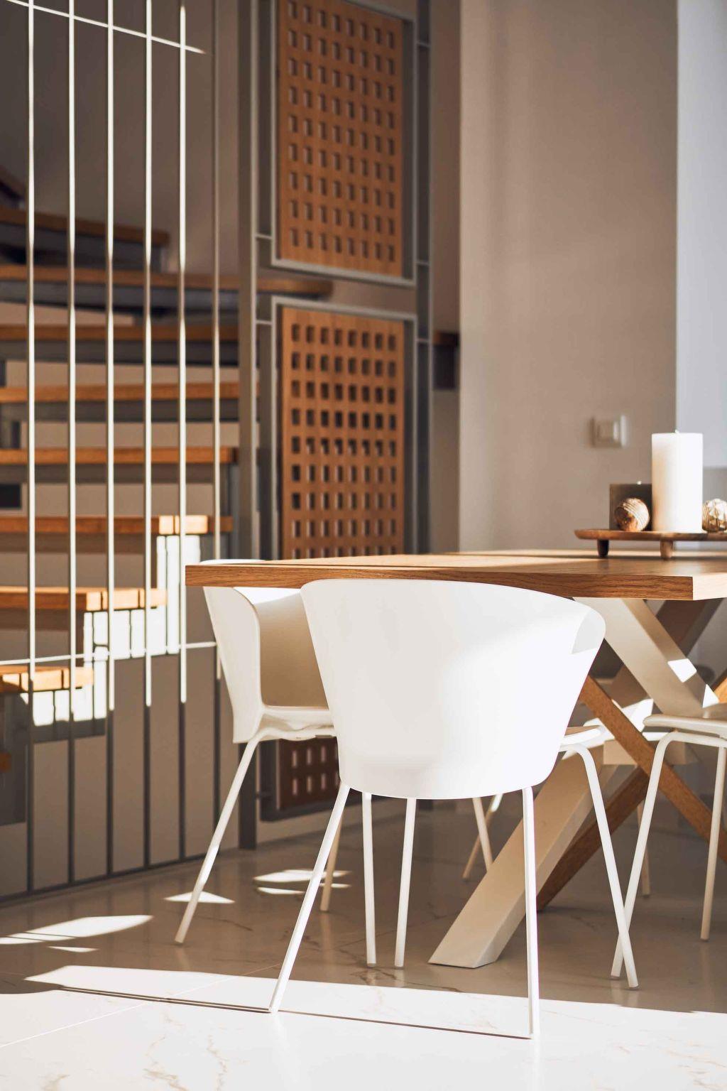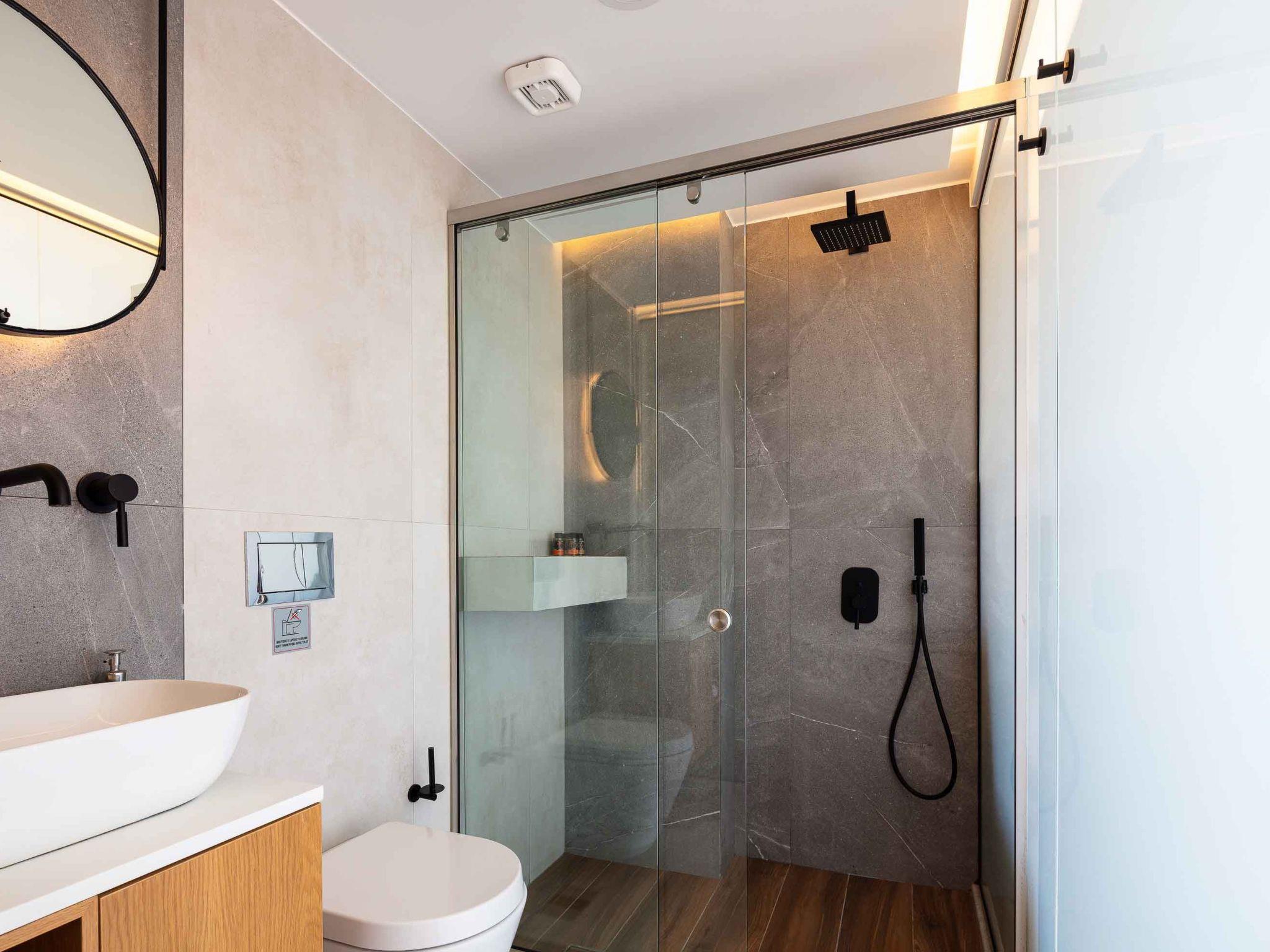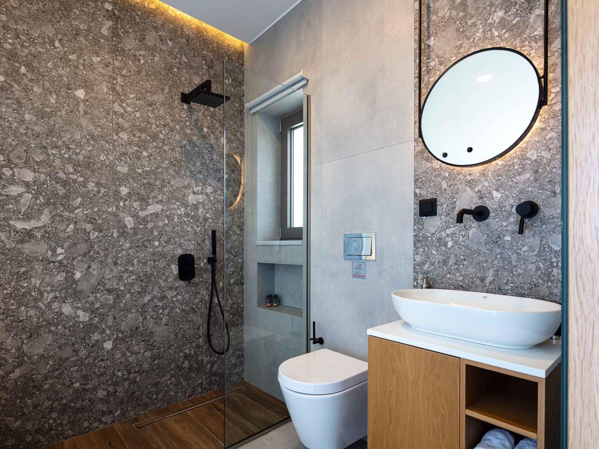 Entering the balcony, you will see a view that will impress you! Swimming in the outdoor pool or drinking a glass of wine above the sea will offer you the most unforgettable experience that you may ever have. Sunbeds, showers, and a table with chairs complete the outdoor area. The selected choice of earthy colors creates a warm place that lets your kids swim safely as there is a safe shallow separate pool next to the main pool. On the lower level, there is a secure parking space that is common for both villas, suitable for 2 cars (for each villa).