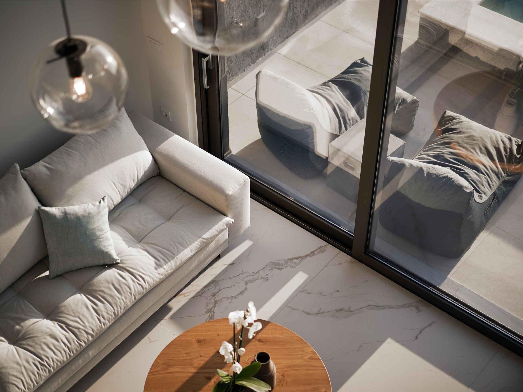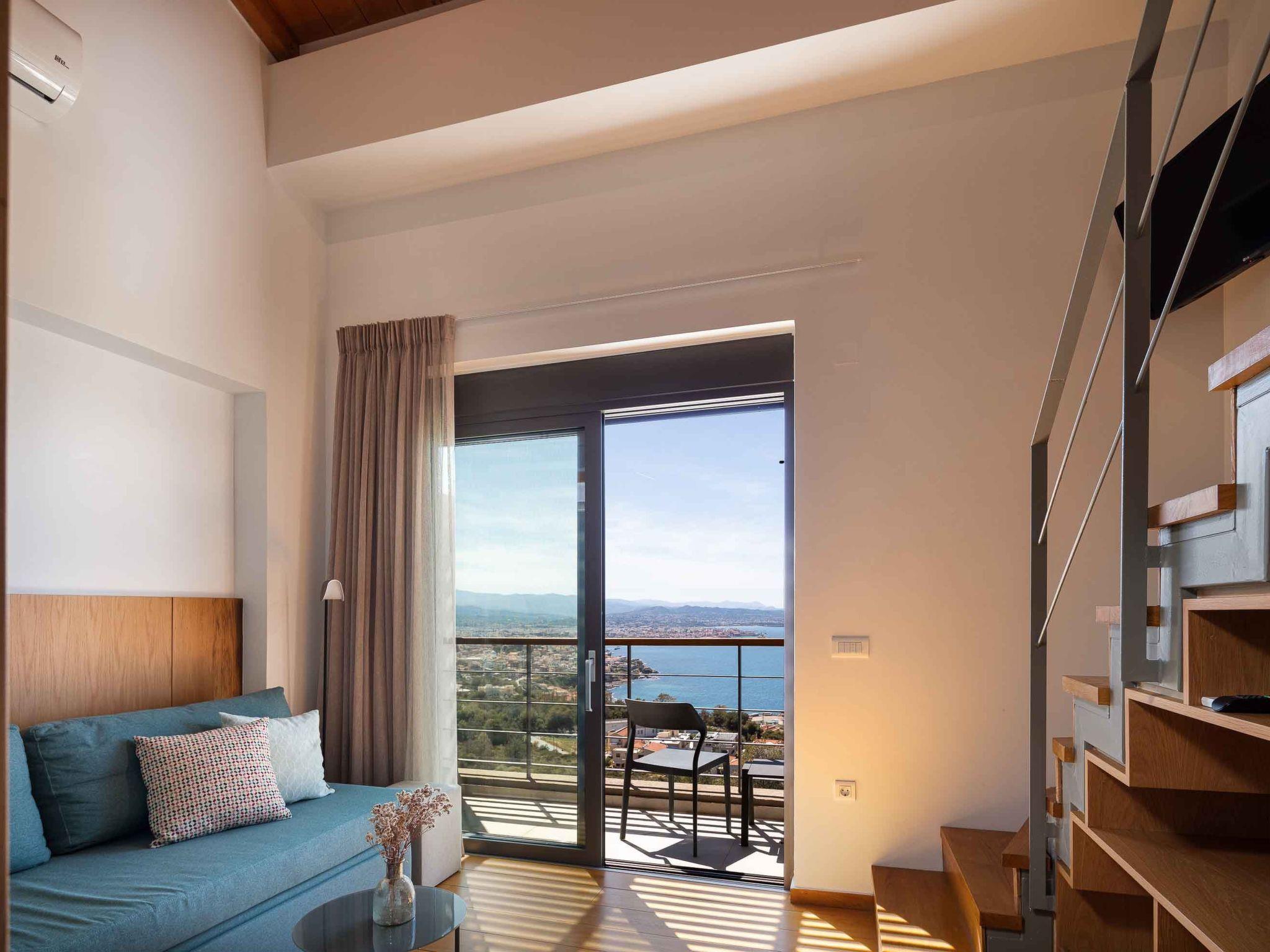 Living area with sofa, 60’’ satellite Smart TV, energy fireplace, access to pool terrace, sea view